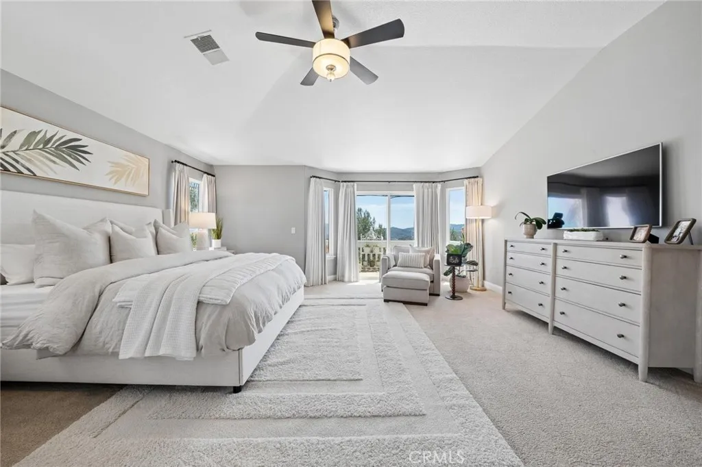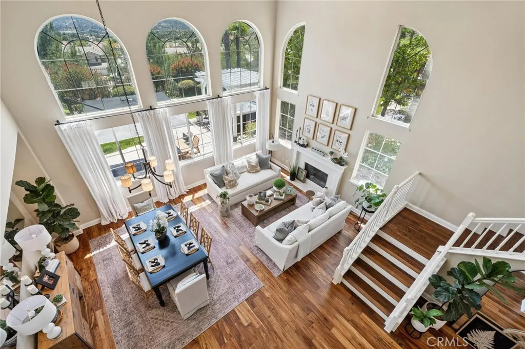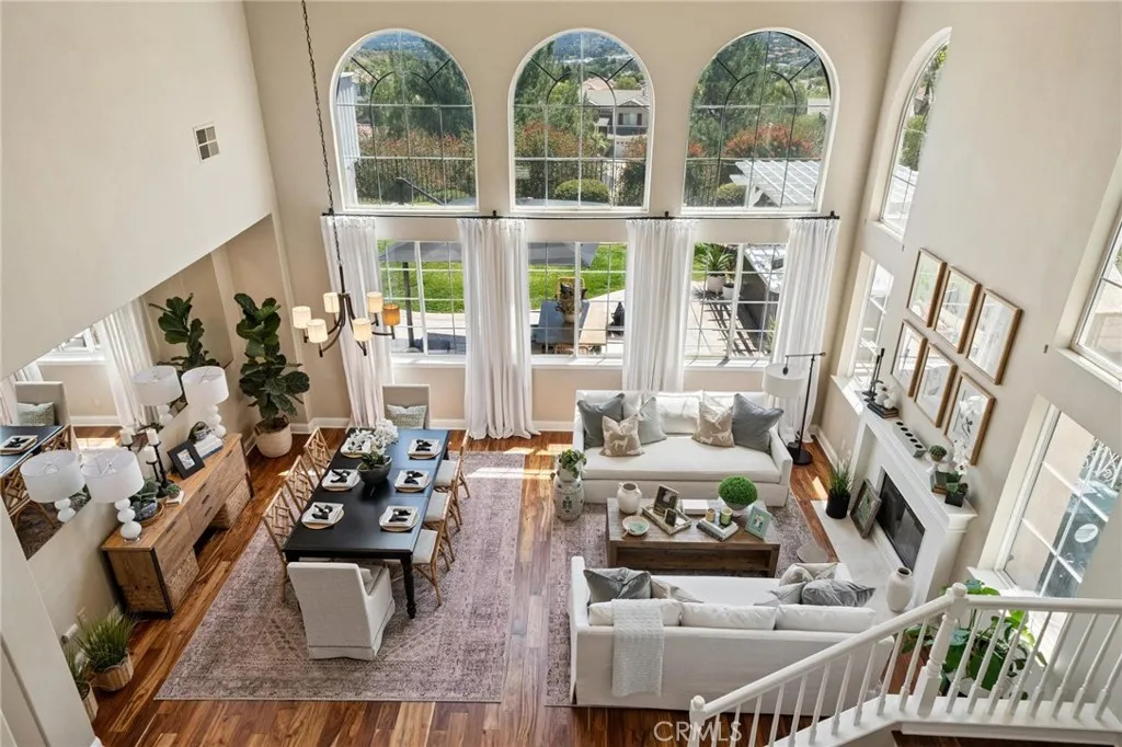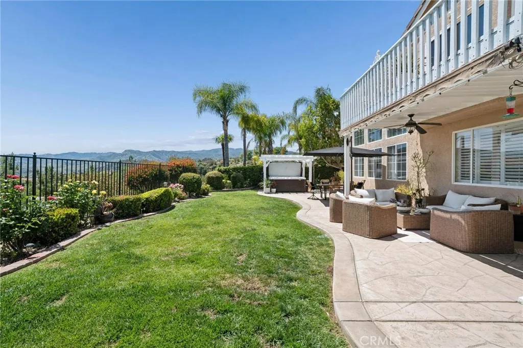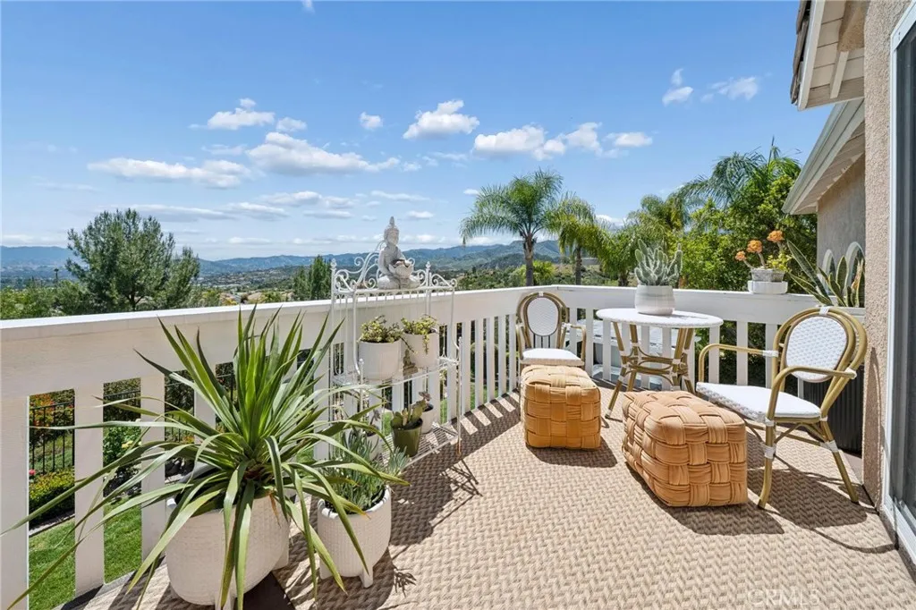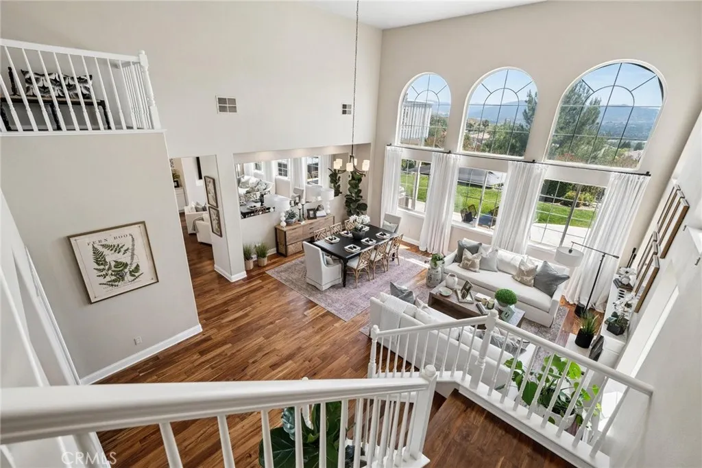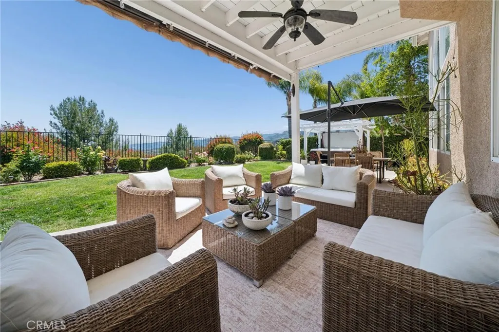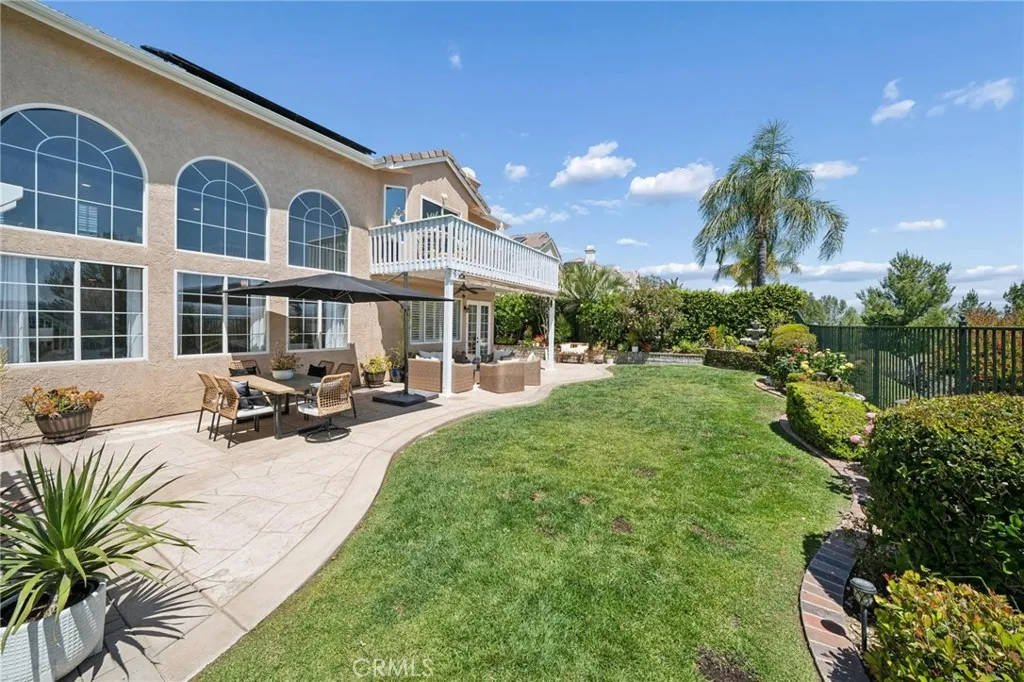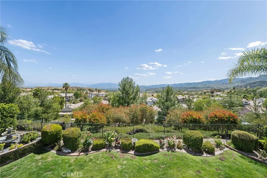 Panoramic view residence located within the prestigious Ryland Summit tract of Stevenson Ranch, offering breathtaking views and an elevated living experience. Soaring vaulted ceilings and expansive windows fill the home with natural light, beautifully showcasing the formal living and dining rooms and enhancing the home’s refined, open ambiance. Rich wood flooring extends throughout the main level, adding warmth and sophistication. The thoughtfully remodeled kitchen serves as the heart of the home, featuring an oversized waterfall quartz island, matching countertops, crisp white cabinetry, stainless steel appliances including a double GE oven, and custom Roman shades—seamlessly blending function with modern design. The adjoining family room is both inviting and elegant, complete with added cabinetry, a custom fireplace, and plantation shutters. A main-level bedroom and full bathroom provide versatility for guests or extended living arrangements, while the downstairs laundry room is equipped with a utility sink for added convenience. A grand staircase leads to the upper level, where a versatile loft or sitting area offers additional living space. Three well-appointed secondary bedrooms feature plantation shutters and plush carpeting, while the primary suite presents a private retreat with a balcony that captures sweeping panoramic views. The primary bathroom is designed for relaxation, offering updated countertops, elegant travertine flooring, an oversized soaking tub, a separate walk-in shower, and a walk-in closet with built-in organizers. Outdoors, the backyard is thoughtfully designed to complement the home’s stunning setting, featuring a combination of hardscape and grassy area, along with an above-ground jacuzzi—creating an ideal space to unwind while taking in the remarkable views. Additional highlights include a spacious three-car garage with extensive built-in cabinetry, low HOA, and a prime location close to shopping, freeway access, and Richard Rioux Park.