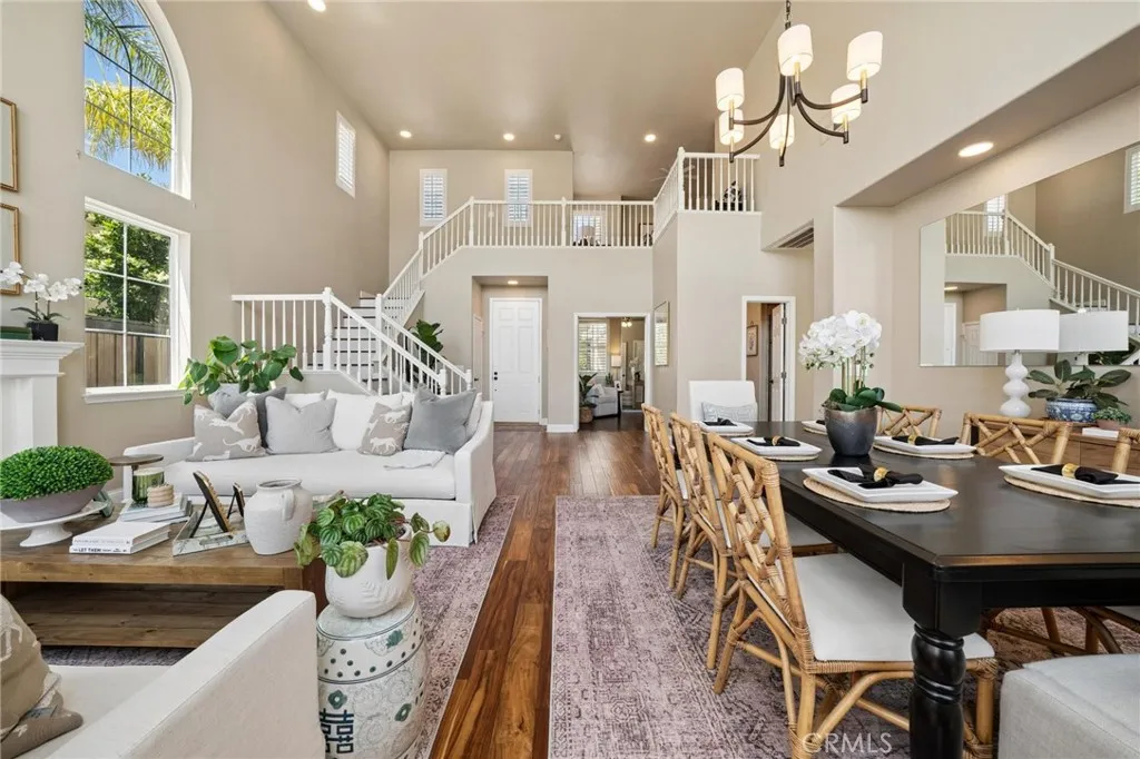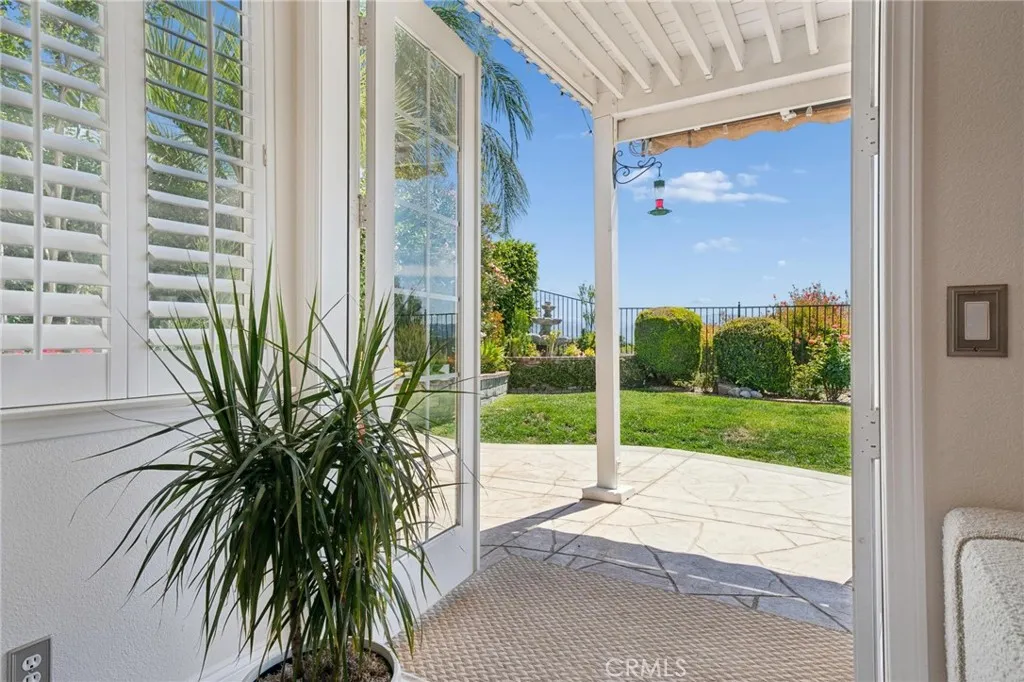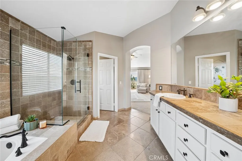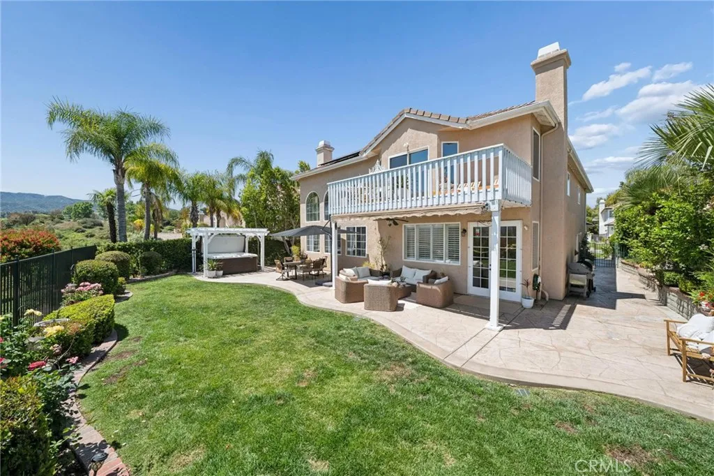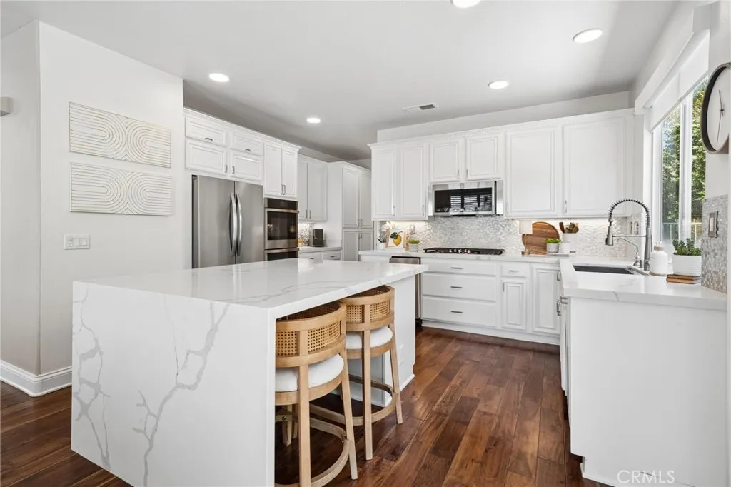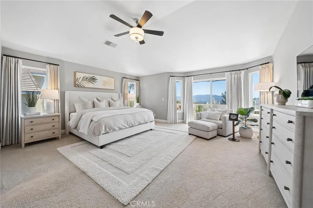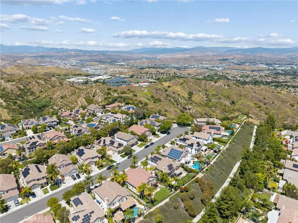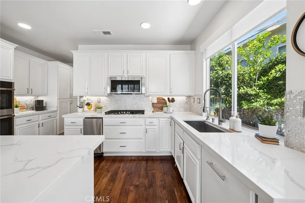 Panoramic view residence located within the prestigious Ryland Summit tract of Stevenson Ranch, offering breathtaking views and an elevated living experience. Soaring vaulted ceilings and expansive windows fill the home with natural light, beautifully showcasing the formal living and dining rooms and enhancing the home’s refined, open ambiance. Rich wood flooring extends throughout the main level, adding warmth and sophistication. The thoughtfully remodeled kitchen serves as the heart of the home, featuring an oversized waterfall quartz island, matching countertops, crisp white cabinetry, stainless steel appliances including a double GE oven, and custom Roman shades—seamlessly blending function with modern design. The adjoining family room is both inviting and elegant, complete with added cabinetry, a custom fireplace, and plantation shutters. A main-level bedroom and full bathroom provide versatility for guests or extended living arrangements, while the downstairs laundry room is equipped with a utility sink for added convenience. A grand staircase leads to the upper level, where a versatile loft or sitting area offers additional living space. Three well-appointed secondary bedrooms feature plantation shutters and plush carpeting, while the primary suite presents a private retreat with a balcony that captures sweeping panoramic views. The primary bathroom is designed for relaxation, offering updated countertops, elegant travertine flooring, an oversized soaking tub, a separate walk-in shower, and a walk-in closet with built-in organizers. Outdoors, the backyard is thoughtfully designed to complement the home’s stunning setting, featuring a combination of hardscape and grassy area, along with an above-ground jacuzzi—creating an ideal space to unwind while taking in the remarkable views. Additional highlights include a spacious three-car garage with extensive built-in cabinetry, low HOA, and a prime location close to shopping, freeway access, and Richard Rioux Park.