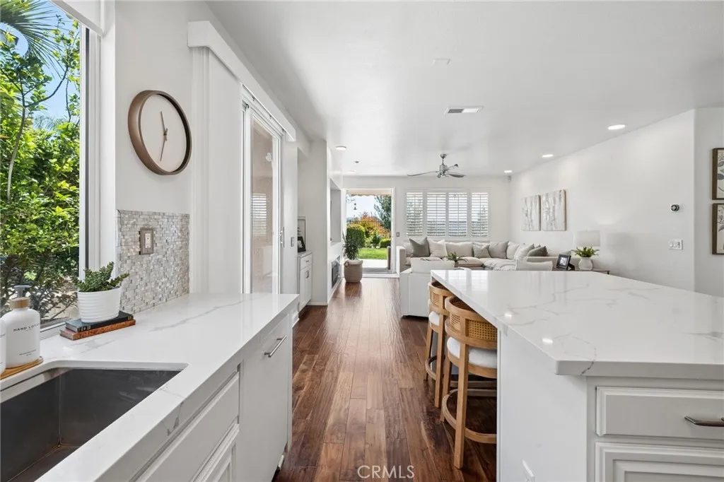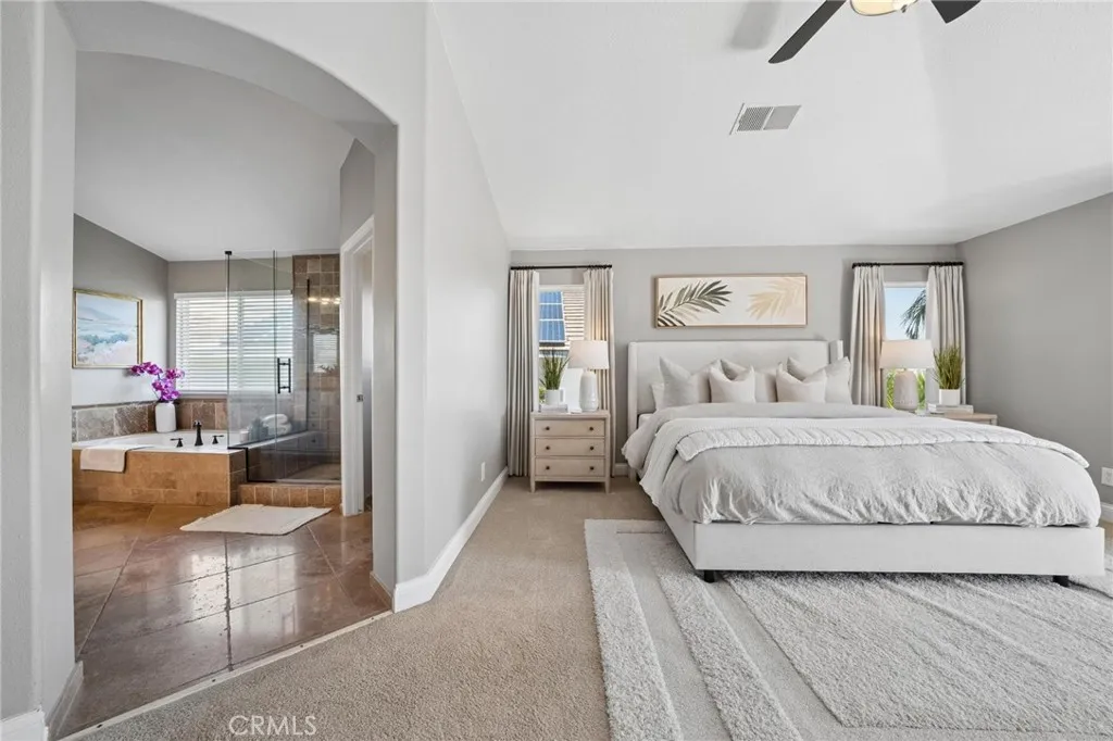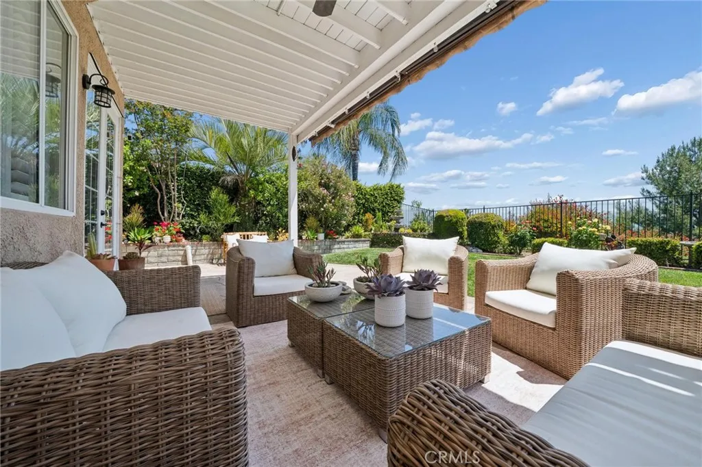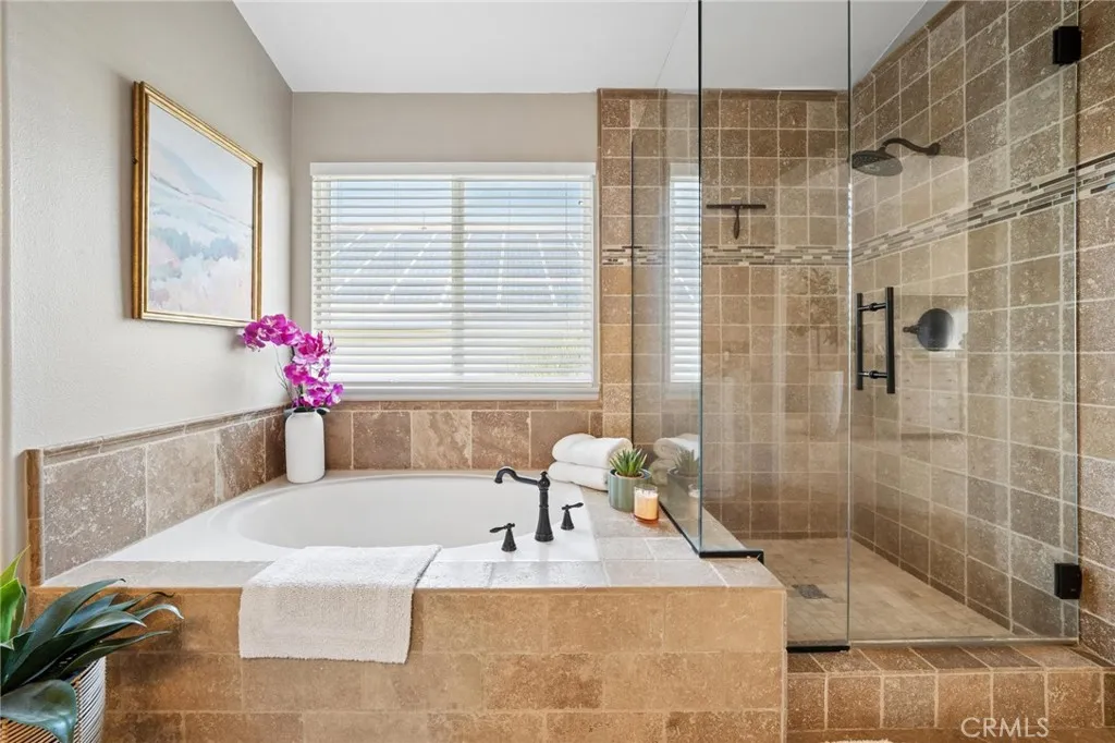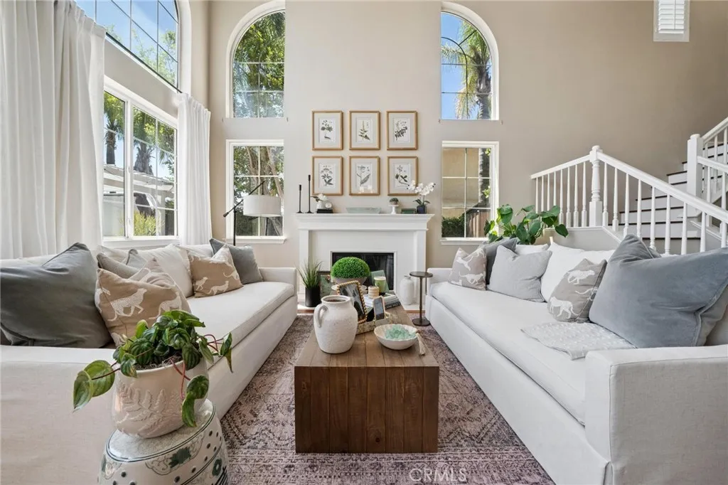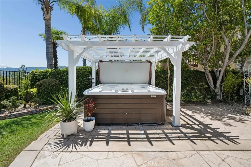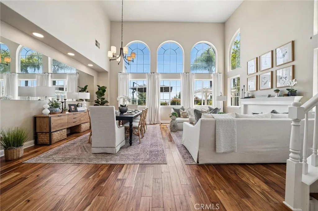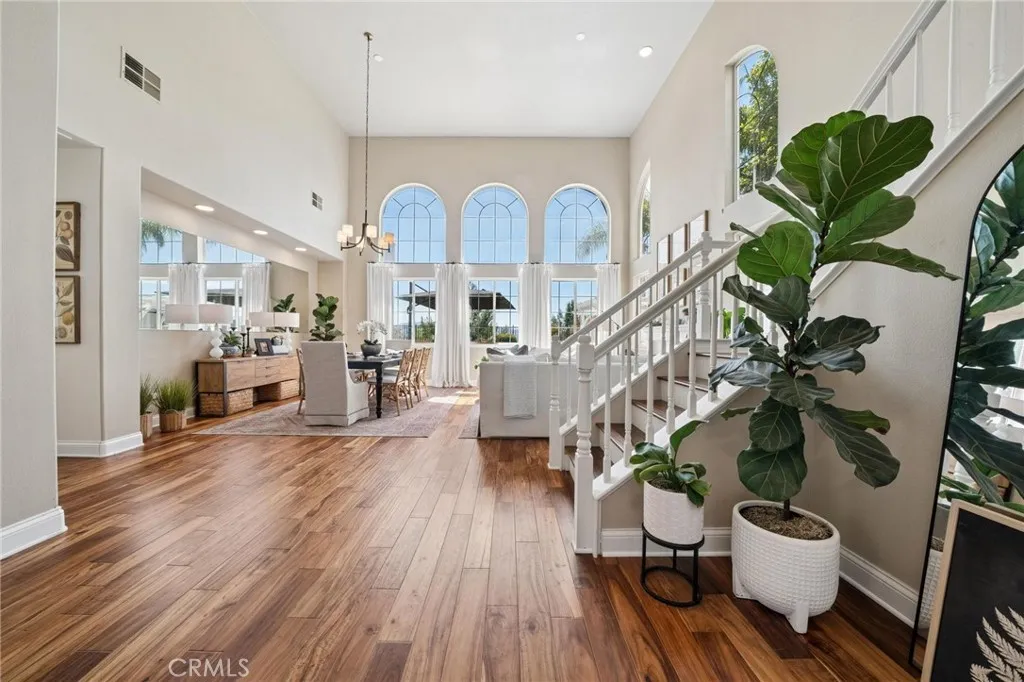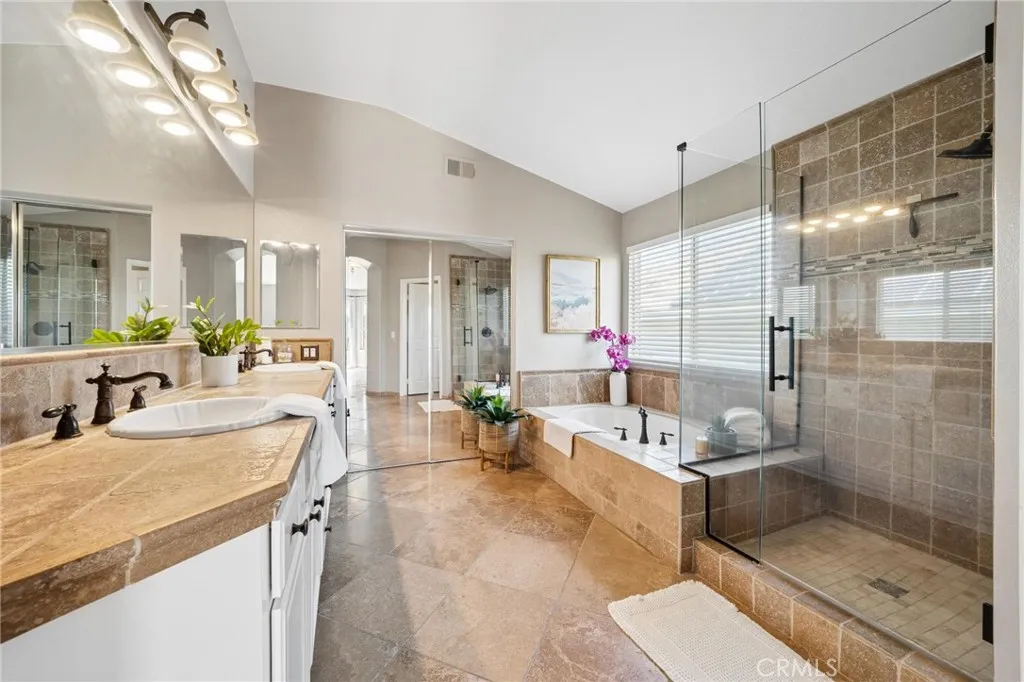 Panoramic view residence located within the prestigious Ryland Summit tract of Stevenson Ranch, offering breathtaking views and an elevated living experience. Soaring vaulted ceilings and expansive windows fill the home with natural light, beautifully showcasing the formal living and dining rooms and enhancing the home’s refined, open ambiance. Rich wood flooring extends throughout the main level, adding warmth and sophistication. The thoughtfully remodeled kitchen serves as the heart of the home, featuring an oversized waterfall quartz island, matching countertops, crisp white cabinetry, stainless steel appliances including a double GE oven, and custom Roman shades—seamlessly blending function with modern design. The adjoining family room is both inviting and elegant, complete with added cabinetry, a custom fireplace, and plantation shutters. A main-level bedroom and full bathroom provide versatility for guests or extended living arrangements, while the downstairs laundry room is equipped with a utility sink for added convenience. A grand staircase leads to the upper level, where a versatile loft or sitting area offers additional living space. Three well-appointed secondary bedrooms feature plantation shutters and plush carpeting, while the primary suite presents a private retreat with a balcony that captures sweeping panoramic views. The primary bathroom is designed for relaxation, offering updated countertops, elegant travertine flooring, an oversized soaking tub, a separate walk-in shower, and a walk-in closet with built-in organizers. Outdoors, the backyard is thoughtfully designed to complement the home’s stunning setting, featuring a combination of hardscape and grassy area, along with an above-ground jacuzzi—creating an ideal space to unwind while taking in the remarkable views. Additional highlights include a spacious three-car garage with extensive built-in cabinetry, low HOA, and a prime location close to shopping, freeway access, and Richard Rioux Park.