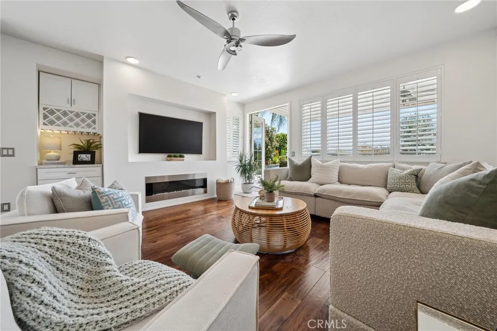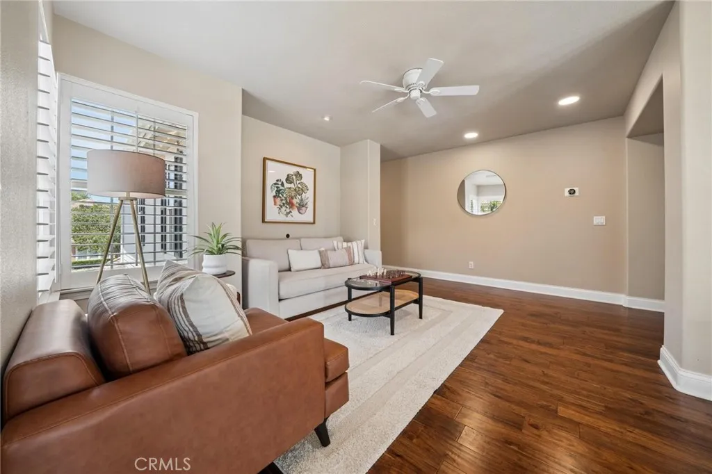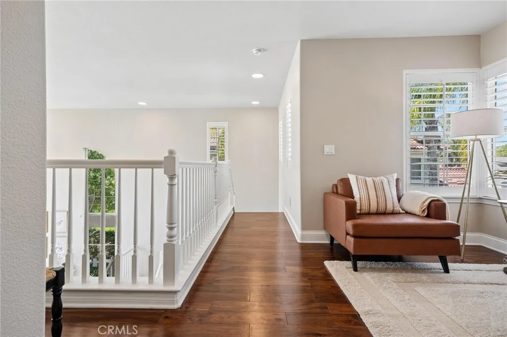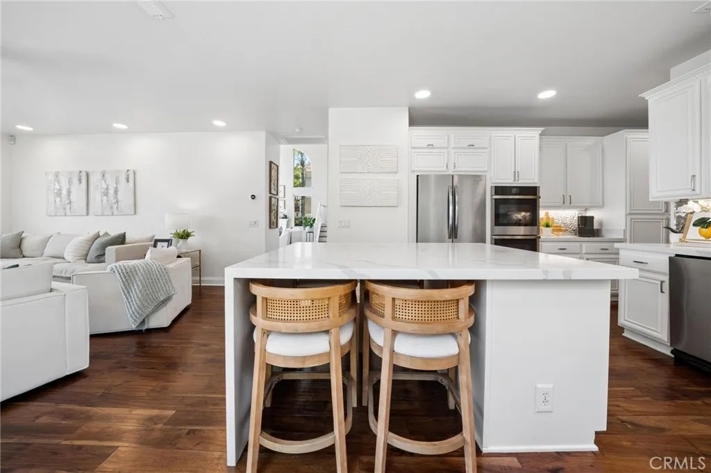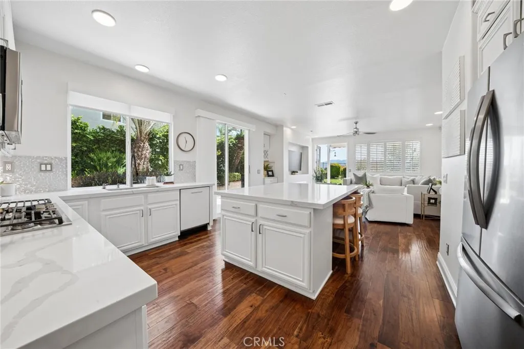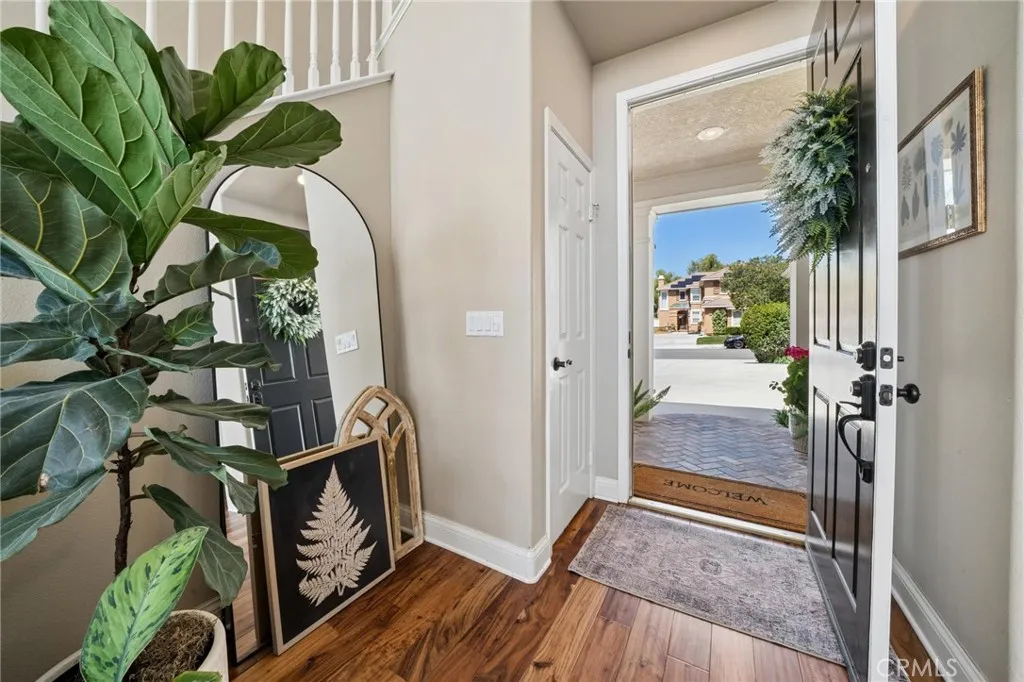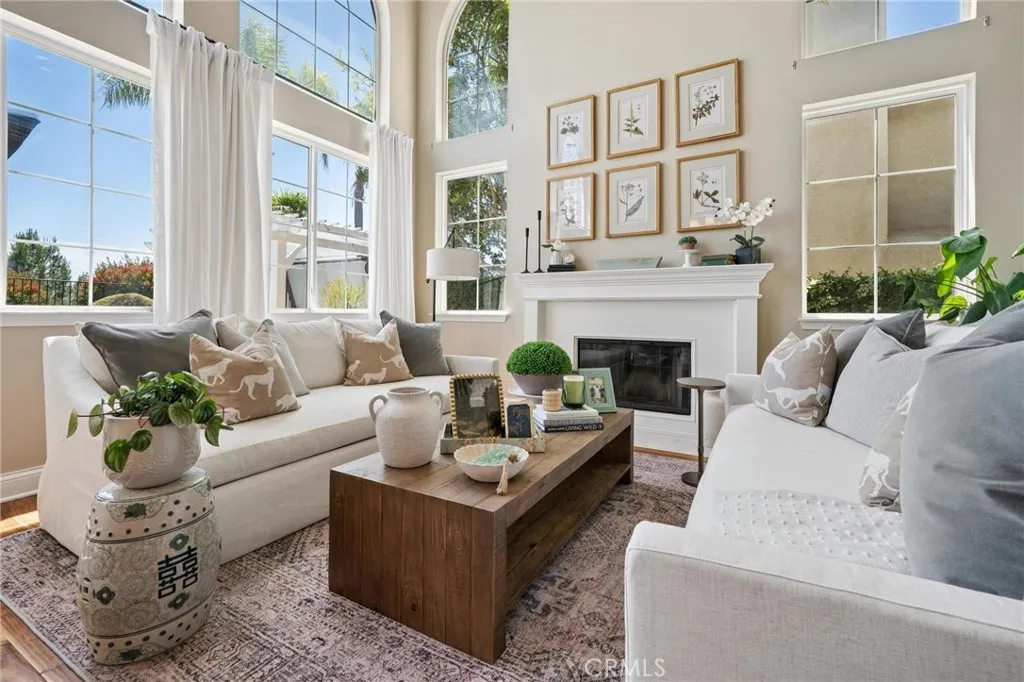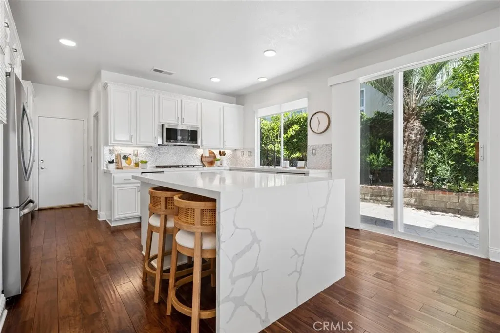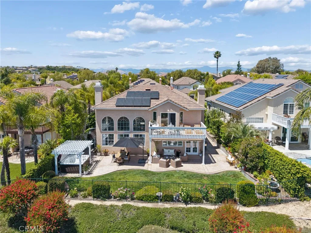 Panoramic view residence located within the prestigious Ryland Summit tract of Stevenson Ranch, offering breathtaking views and an elevated living experience. Soaring vaulted ceilings and expansive windows fill the home with natural light, beautifully showcasing the formal living and dining rooms and enhancing the home’s refined, open ambiance. Rich wood flooring extends throughout the main level, adding warmth and sophistication. The thoughtfully remodeled kitchen serves as the heart of the home, featuring an oversized waterfall quartz island, matching countertops, crisp white cabinetry, stainless steel appliances including a double GE oven, and custom Roman shades—seamlessly blending function with modern design. The adjoining family room is both inviting and elegant, complete with added cabinetry, a custom fireplace, and plantation shutters. A main-level bedroom and full bathroom provide versatility for guests or extended living arrangements, while the downstairs laundry room is equipped with a utility sink for added convenience. A grand staircase leads to the upper level, where a versatile loft or sitting area offers additional living space. Three well-appointed secondary bedrooms feature plantation shutters and plush carpeting, while the primary suite presents a private retreat with a balcony that captures sweeping panoramic views. The primary bathroom is designed for relaxation, offering updated countertops, elegant travertine flooring, an oversized soaking tub, a separate walk-in shower, and a walk-in closet with built-in organizers. Outdoors, the backyard is thoughtfully designed to complement the home’s stunning setting, featuring a combination of hardscape and grassy area, along with an above-ground jacuzzi—creating an ideal space to unwind while taking in the remarkable views. Additional highlights include a spacious three-car garage with extensive built-in cabinetry, low HOA, and a prime location close to shopping, freeway access, and Richard Rioux Park.