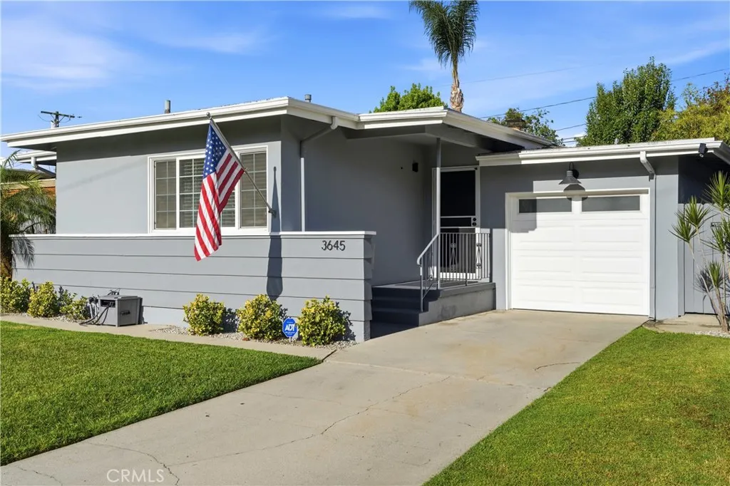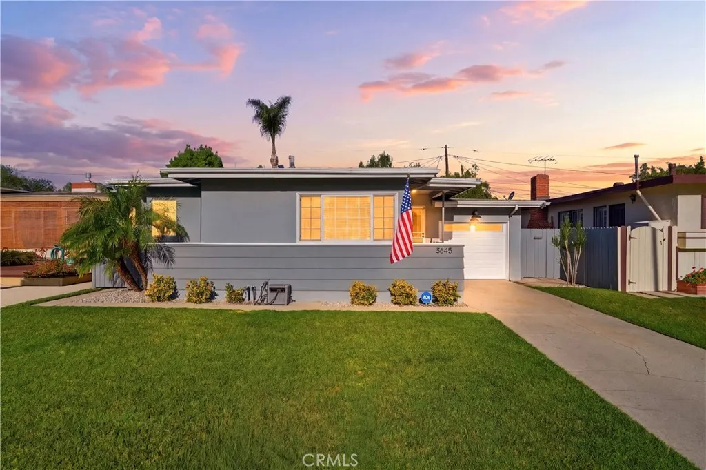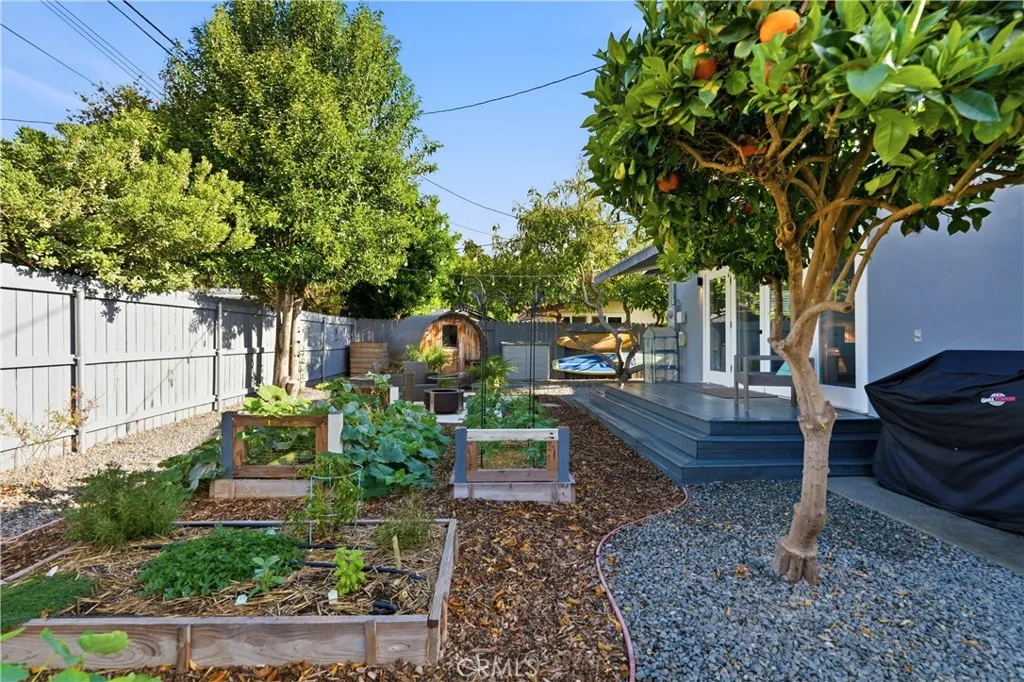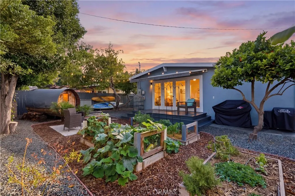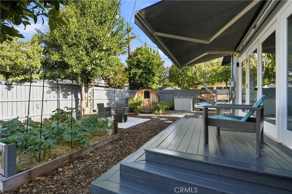 Charming Mid-Century Modern Plaza property nestled in the middle of a beautiful tree lined neighborhood. Original hardwood flooring and wood burning fireplace greet you along with a very open living space, complete with recessed lighting, solar tube and fresh paint. The kitchen is remodeled with quartz counter tops, recessed lighting and stainless appliances, offering a seamless transition to the living room. The generous primary bedroom has wonderful backyard views via the large French doors, with access to a very generous and remodeled bath with an adjacent workspace/counter and dual sink vanities. The private backyard provides box gardens, producing Avocado, Orange, Lime and Fig trees with plenty of room for entertaining. The retractable Sunsetter awning creates a wonderful shady porch and the Breeo fire pit completes the ambiance and views. The sauna, which is in great condition will remain with the sale. This property has an amazing finished garage, offering custom cabinetry/work bench, NEMA car charger, auto opener, and overhead storage. Additional features include: central heat and AC, 200 amp electrical panel, dual pane windows and front yard irrigation system. Enjoy a short walk to Patrick Henry Elementary, Marshall Middle School and Heartwell Park. Hurry, this property will not last!