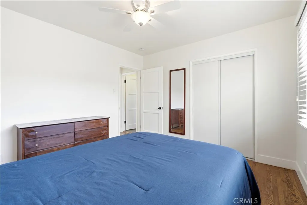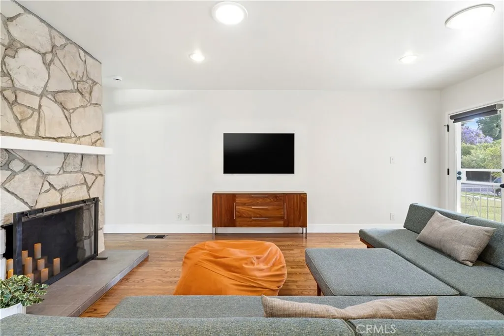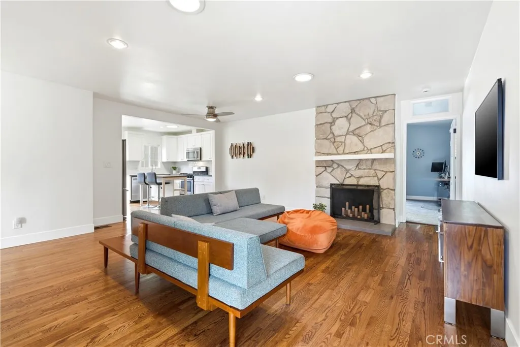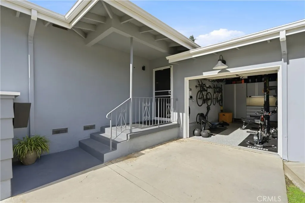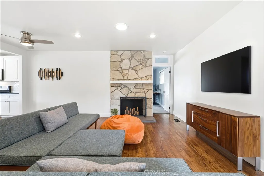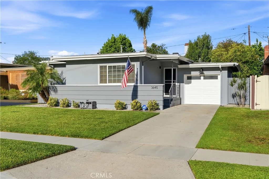 Charming Mid-Century Modern Plaza property nestled in the middle of a beautiful tree lined neighborhood. Original hardwood flooring and wood burning fireplace greet you along with a very open living space, complete with recessed lighting, solar tube and fresh paint. The kitchen is remodeled with quartz counter tops, recessed lighting and stainless appliances, offering a seamless transition to the living room. The generous primary bedroom has wonderful backyard views via the large French doors, with access to a very generous and remodeled bath with an adjacent workspace/counter and dual sink vanities. The private backyard provides box gardens, producing Avocado, Orange, Lime and Fig trees with plenty of room for entertaining. The retractable Sunsetter awning creates a wonderful shady porch and the Breeo fire pit completes the ambiance and views. The sauna, which is in great condition will remain with the sale. This property has an amazing finished garage, offering custom cabinetry/work bench, NEMA car charger, auto opener, and overhead storage. Additional features include: central heat and AC, 200 amp electrical panel, dual pane windows and front yard irrigation system. Enjoy a short walk to Patrick Henry Elementary, Marshall Middle School and Heartwell Park. Hurry, this property will not last!
