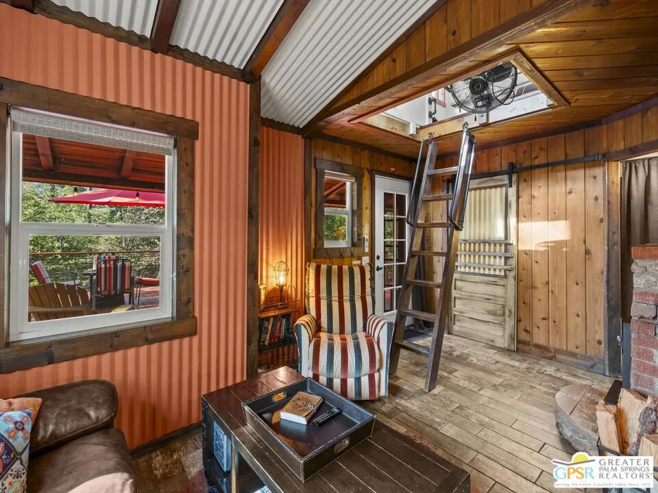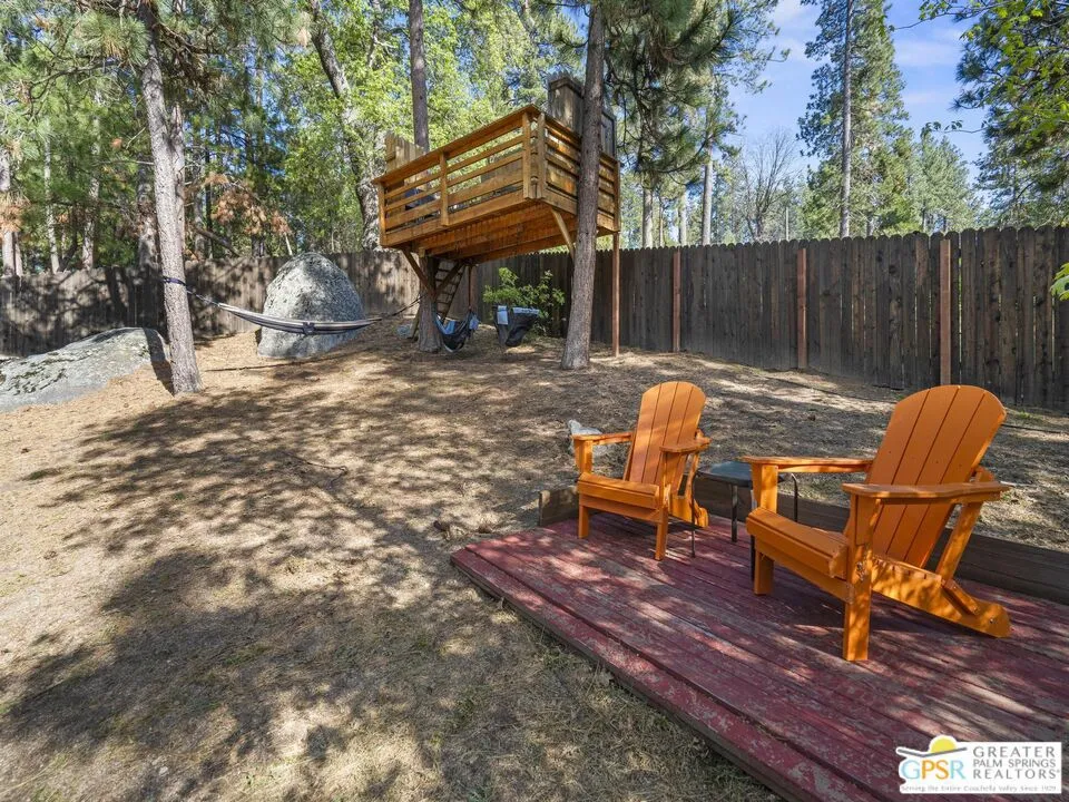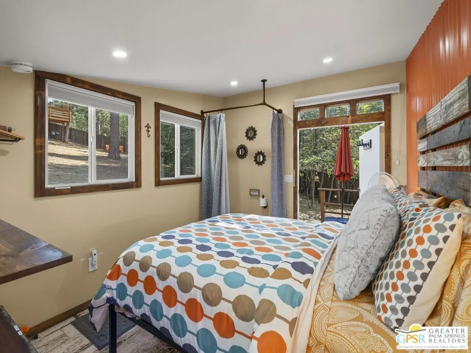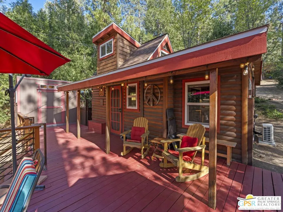 The Little Red: A Storybook Cabin in Idyllwild 1Bd + Loft|1 Bath|486 Sq Ft|.37 Acres|Built 1955| Bunkhouse + Laundry|Whole-House Generator Don't let the square footage fool you. At 486 square feet, this mountain cabin delivers more life per square foot than most homes three times its size and the .37-acre fully fenced lot gives you room to breathe in every direction. The bones are original -- the cabin was built in 1955. The systems are new. A raised roof with fresh insulation installed just five years ago, updated electrical panel, an energy-efficient mini split for heating and cooling, and a wood-burning fireplace insert that turns a January snowstorm into the best night of the weekend. Inside, the main level is complete -- an open plan kitchen, dining, and living room flowing together, a bedroom tucked behind a barn door with a skylight overhead, and a full bath behind a second barn door. A loft sleeping area accessed by a ship's ladder sits above it all.Step outside and the property opens up. The deck is oversized by any measure, with multiple seating zones, a covered porch, room to host a crowd, and it flows out to a fully fenced yard that begs to be explored. A hammock hangs between the pines, a treehouse deck sits elevated in the canopy, and there is more than enough room for dogs to run. This is a property built for people who want to live outside as much as in.Two additional outbuildings round out the compound: a converted bonus sleeping space and a dedicated laundry and washroom shed. A whole-house Generac generator means this property functions beautifully in every season, through every storm.Small by design. Extraordinary by every other measure. The Little Red is ready for whatever you have in mind.