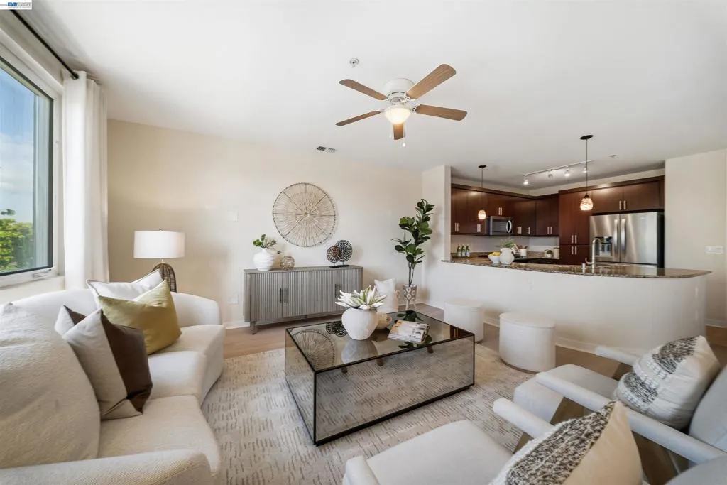Stunning Turn-Key Corner Unit Condo — Updated & Move-In Ready! Welcome to this beautifully updated 2 bed/2 bath premium corner residence offering 1,269 sq ft of modern, light-filled living. As an end unit, this home enjoys an abundance of natural light and boasts an oversized private balcony — perfect for morning coffee or evening relaxation. The main living area showcases brand-new French oak-style European flooring, lending a sleek, contemporary feel throughout. The open-concept kitchen features rich cabinetry, granite counters, stainless steel appliances, and a breakfast bar flowing into the spacious living and dining areas. Both bedrooms are generously sized, with a primary suite featuring balcony access and dual-sink vanity bath. Enjoy easy access to assigned parking two parking spaces and premium HOA amenities including a full gym, pool, game room, and onsite management. A true commuter’s dream — you’re seconds from Dublin/Pleasanton BART, tech shuttles, and I-580/680, with Whole Foods and premier dining right around the corner. Don’t miss this rare opportunity to own a turn-key, light-filled corner condo in a sought-after community!