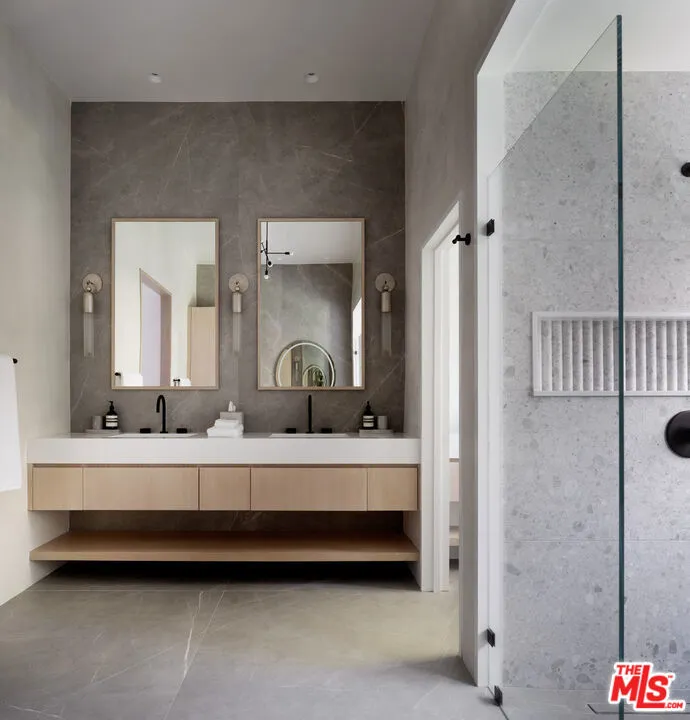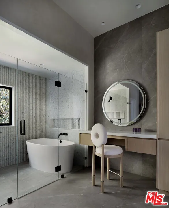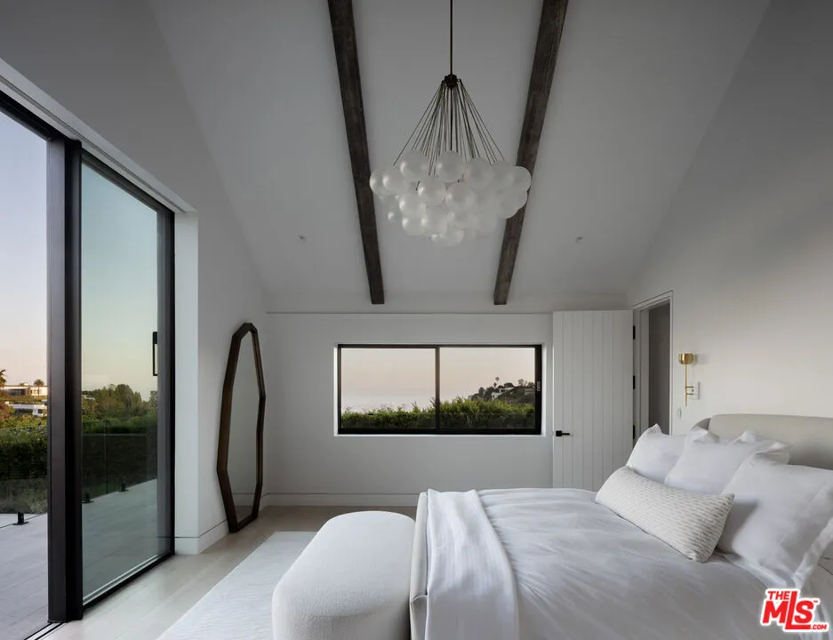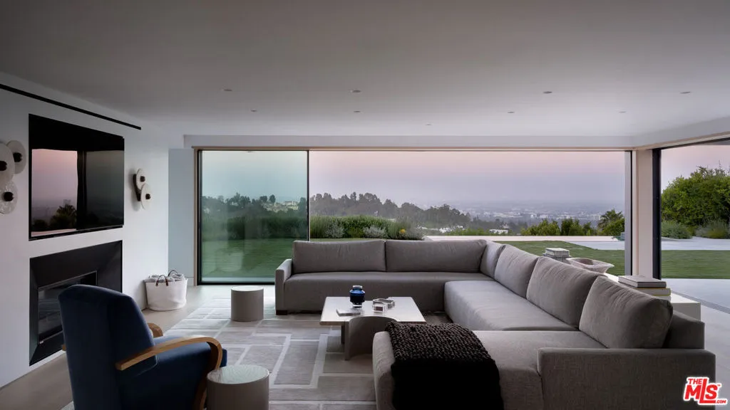 Sited on one of Bel Air's most coveted ridgelines, the residence is a masterfully reimagined estate by Ballantine Studio, set on approximately 1.5 acres with sweeping hillside-to-coastal views. The striking two-story home spans 6,400 sq ft, offering 7 en-suite bedrooms and 7 bathrooms, thoughtfully arranged across two wings with a private primary suite and separate guest/office lounge. Designed for seamless indoor-outdoor living, the open floor plan is anchored by warm white Venetian plaster walls and 10" wide-plank European white oak flooring, with expansive Fleetwood glass framing the surrounding vistas. Vaulted ceilings with custom wood beams define the upper level, while a dramatic skybridge overlooks the double-height living room, accessed via a sculptural open-rise staircase enclosed in glass. Refined finishes include curated marble, chef-grade appliances, Arto Norman brick, Baldwin Estate Collection hardware, and precision-crafted millwork with integrated reglet detailing. Bespoke KGM lighting design highlights cove, bridge, stair, and running board illumination throughout. Fully integrated Crestron smart home system controls lighting, audio/visual, HVAC, security, pool, and access, complemented by 24/7 monitored perimeter cameras and speaker system. Additional features include linear HVAC venting, concealed shade pocketing, custom closets and built-ins throughout, and a private gym. Thoughtfully designed with fire-resistant materials and surrounded by water-retentive, fire-conscious landscaping, offering a rare combination of architectural pedigree, privacy, and long-term livability in Bel Air.