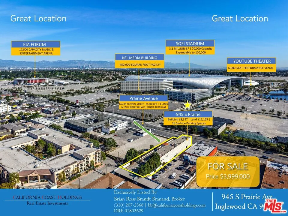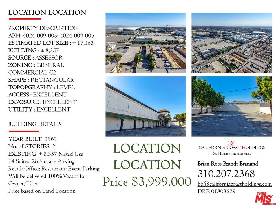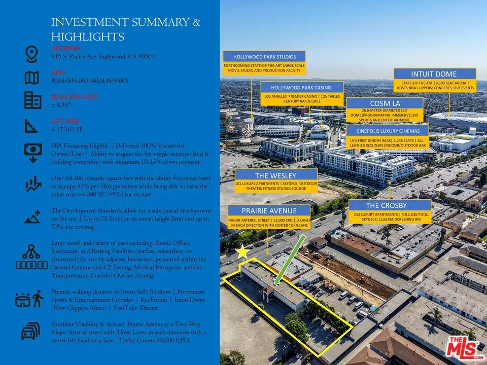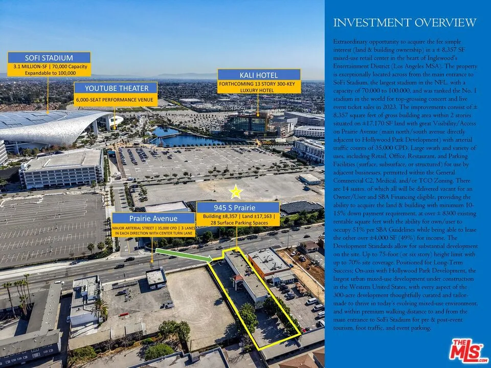 Extraordinary opportunity to acquire the fee simple interest (land & building ownership) in a 8,357 SF mixed-use retail center in the heart of Inglewood's Entertainment District (Los Angeles MSA). The property is exceptionally located across from the main entrance to SoFi Stadium, the largest stadium in the NFL, with a capacity of 70,000 to 100,000, and was ranked the No. 1 stadium in the world for top-grossing concert and live event ticket sales in 2023. The improvements consist of 8,357 square feet of gross building area within 2 stories situated on 17,170 SF land with great Visibility/Access on Prairie Avenue (main north/south avenue directly adjacent to Hollywood Park Development) with arterial traffic counts of 35,000 CPD. Large swath and variety of uses, including Retail, Office, Restaurant, and Parking Facilities (surface, subsurface, or structured) for use by adjacent businesses, permitted within the General Commercial C2, Medical, and/or TCO Zoning. There are 14 suites, of which all will be delivered vacant for an Owner/User and SBA Financing eligible, providing the ability to acquire the land & building with minimum 10-15% down payment requirement, at over 8300 existing rentable square feet with the ability for own/user to occupy 51% per SBA Guidelines while being able to lease the other over 4,000 SF (49%) for income. The Development Standards allow for substantial development on the site. Up to 75-foot (or six story) height limit with up to 70% site coverage. Positioned for Long-Term Success; On-axis with Hollywood Park Development, the largest urban mixed-use development under construction in the Western United States, with every aspect of the 300-acre development thoughtfully curated and tailor-made to thrive in today's evolving mixed-use environment, and within premium walking distance to and from the main entrance to SoFi Stadium for pre & post-event tourism, foot traffic, and event parking.