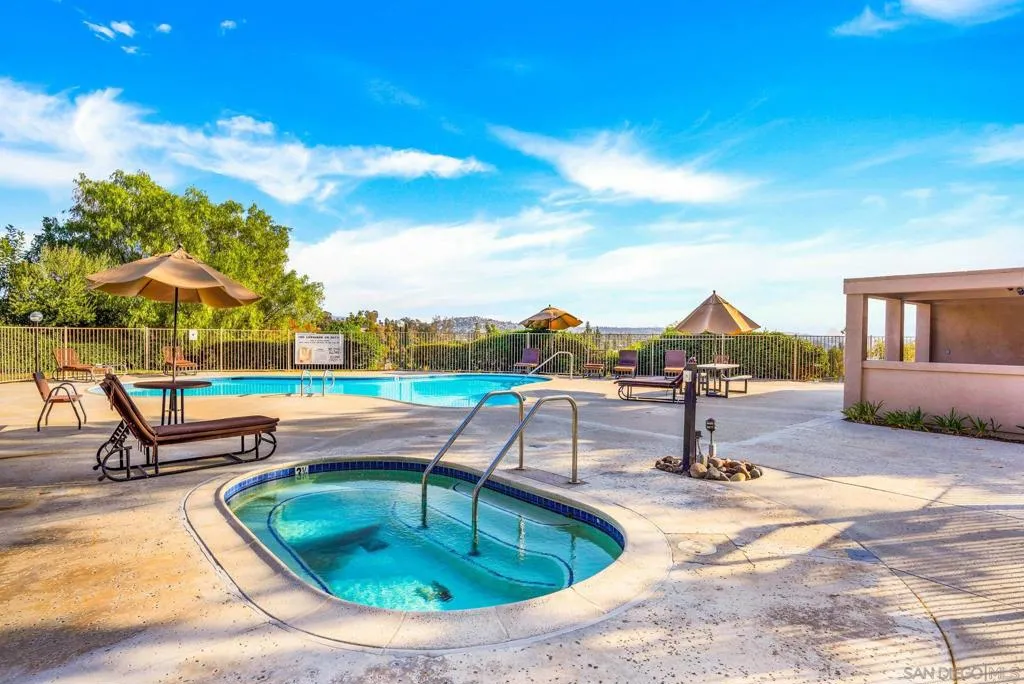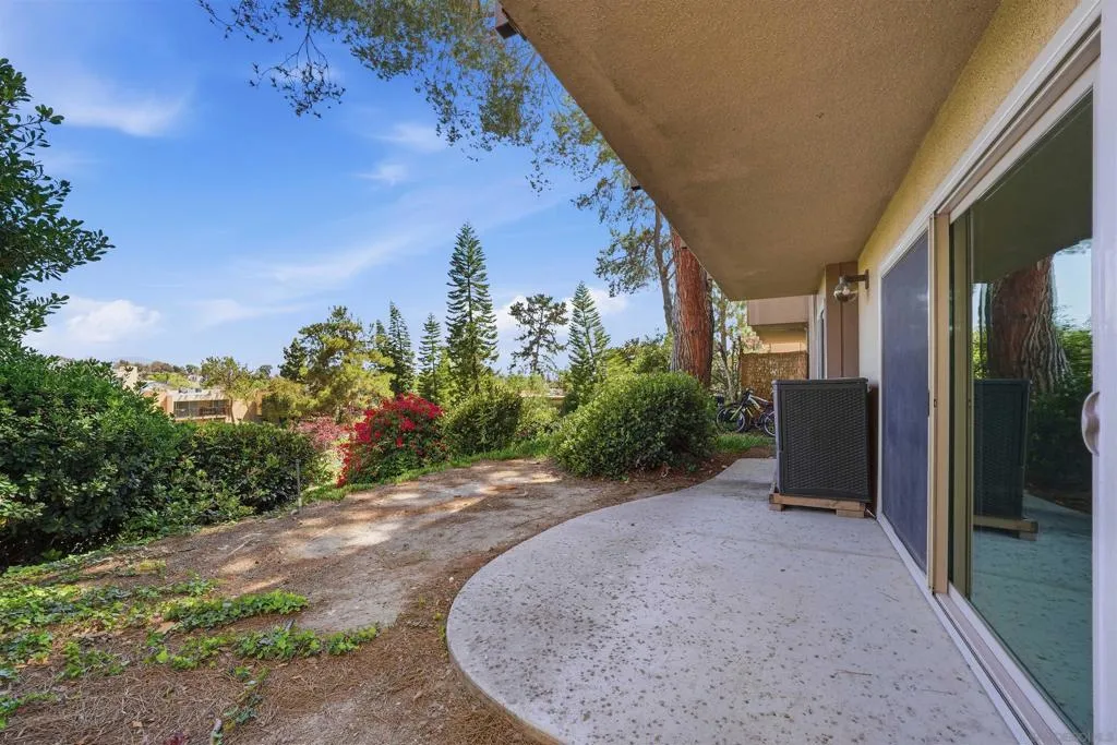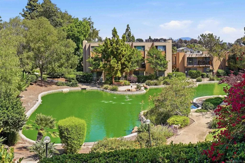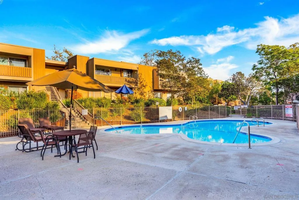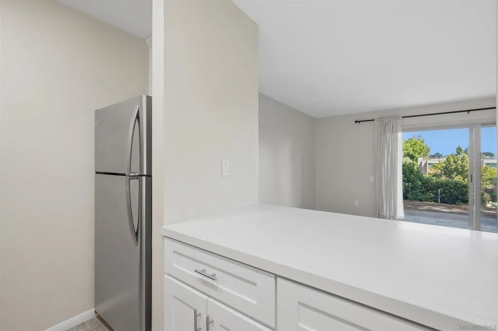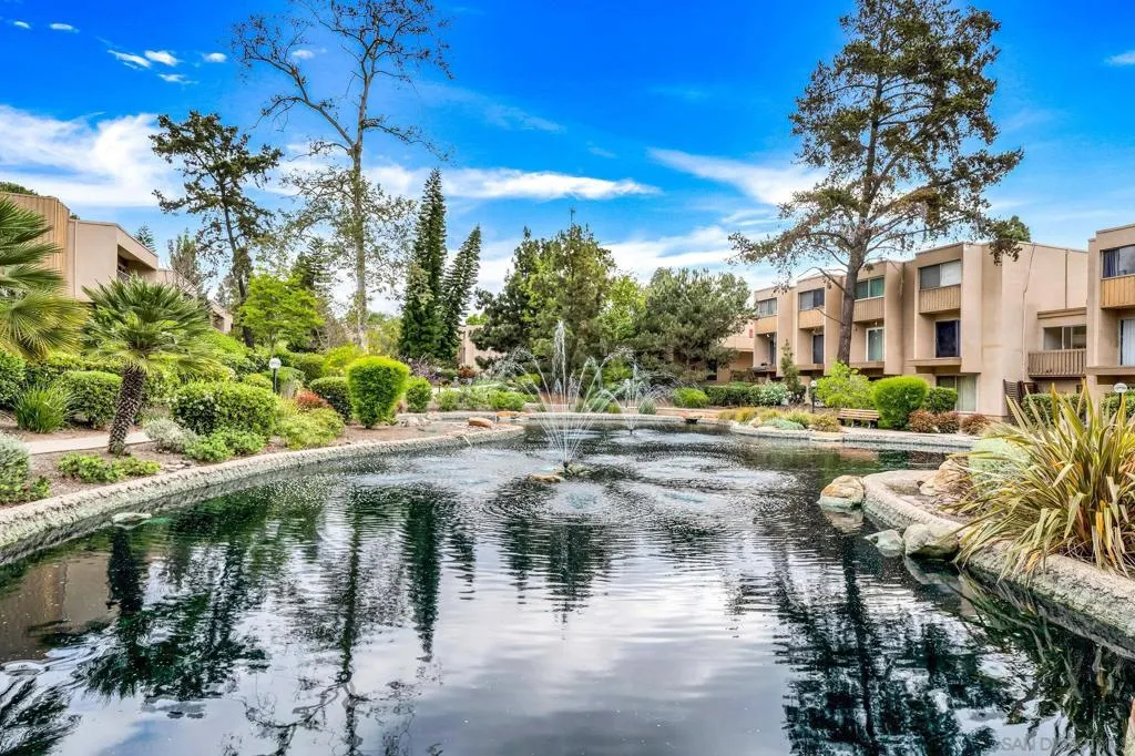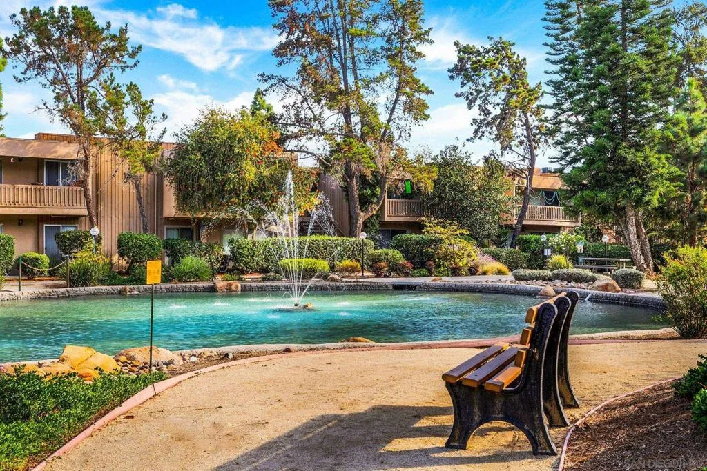 Tucked end-unit is one of the few in the complex where no one walks past your door. It's quiet. Step onto your oversized patio and look out over the garden pond — mornings here feel different than mornings anywhere else. Inside, the kitchen was rebuilt from scratch. White shaker cabinets with soft-close drawers, clean white countertops, tile backsplash, and newer appliances throughout. The complex does what most neighborhoods can't — pools, spa, gym, tennis courts, and 24-hour security, all without leaving home. And when you do leave, Lake Murray and Mission Trails are just a walk away.