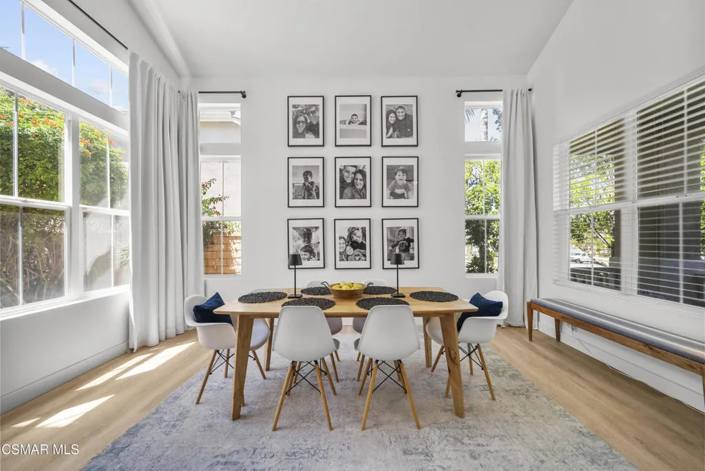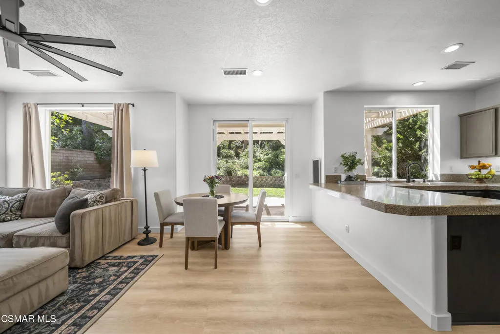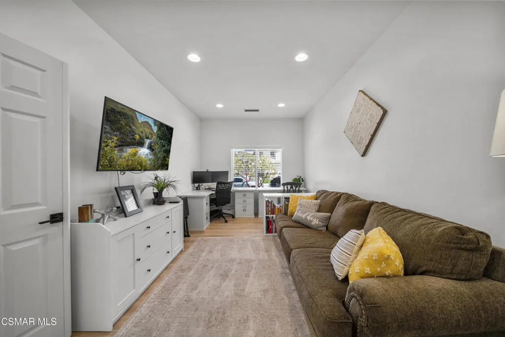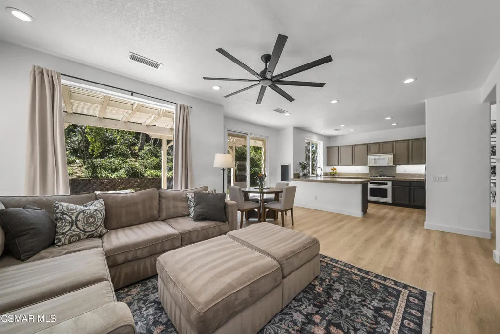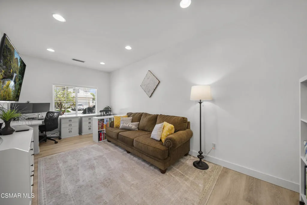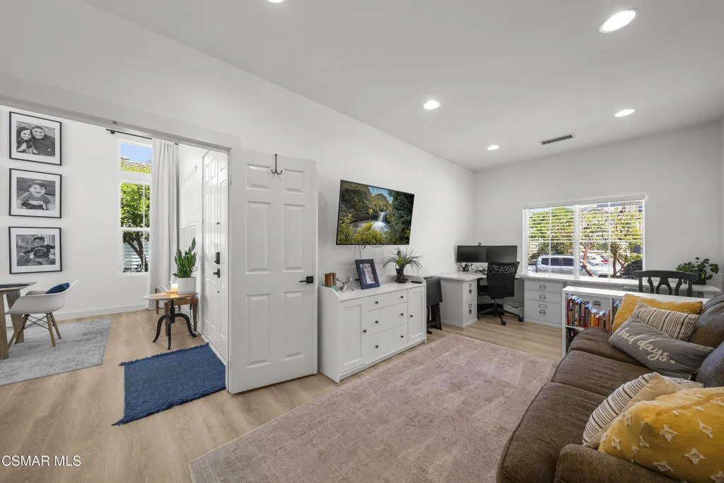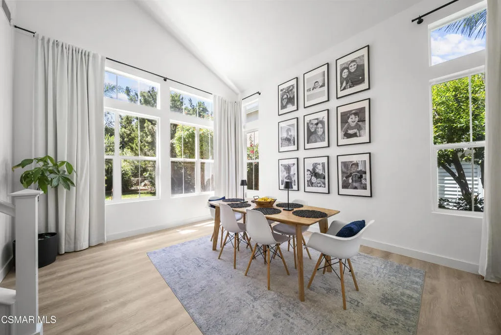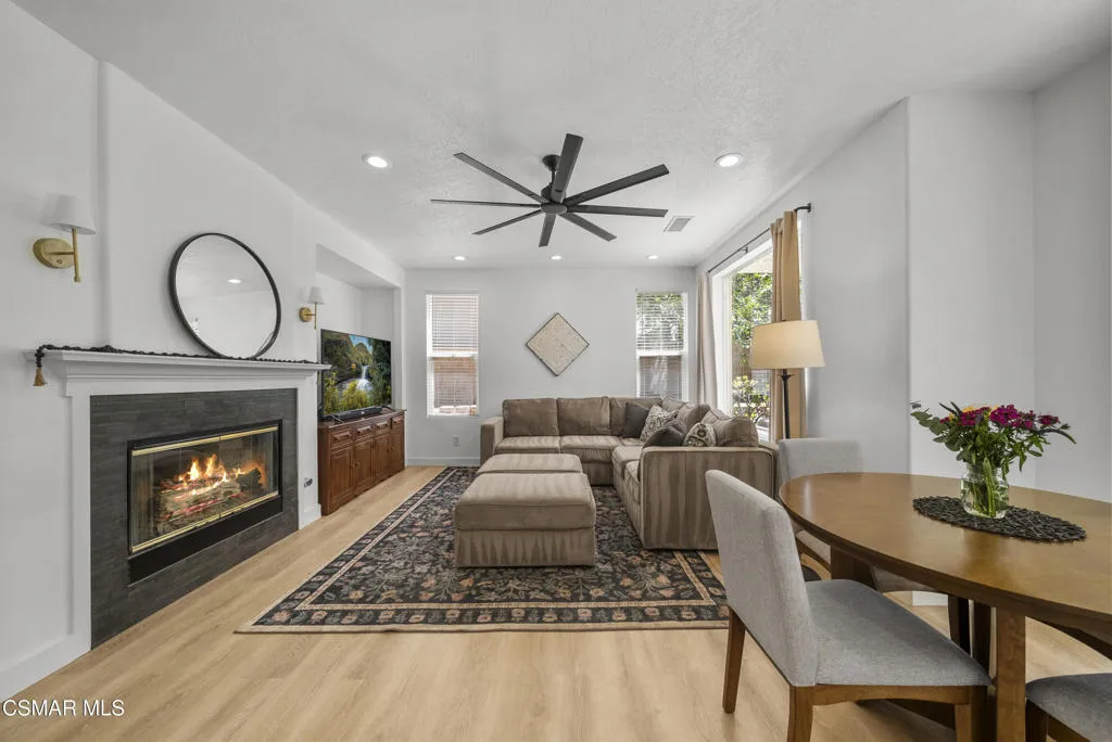 From the moment you arrive, this home makes a lasting impression with its beautifully maintained curb appeal, manicured landscaping, and inviting front entry. Step inside to cathedral ceilings and an abundance of natural light that fills the formal living and dining space. Large windows, custom oversized Pottery Barn drapes, and modern interior paint create a bright, airy feel, while luxury vinyl plank flooring flows seamlessly throughout, complemented by wood baseboards and wood-wrapped doors for a clean, elevated look.As you move further into the home, the living room opens up as a warm and inviting gathering space, featuring a refinished fireplace, oversized modern ceiling fan, and dimmable recessed lighting that allows you to set the perfect mood. Just off this area, a versatile downstairs room offers flexibility for a home office, guest space, or additional living area.The kitchen is both functional and well-appointed, with ample counter space, updated stainless steel appliances including a newer dishwasher and refrigerator, and a layout that connects effortlessly to the main living areas--ideal for everyday living and entertaining.The fully remodeled downstairs bathroom showcases stylish, modern finishes and adds convenience for guests.Step outside to the backyard retreat, where you can unwind and entertain year-round. The spa is equipped with a Pool Guard walkable safety cover, offering both relaxation and added safety, and the yard is graced with mature landscape throughout creating your own private oasis.Upgrades continue behind the scenes with a recently replaced AC condenser (2023), FULLY-OWNED solar panel system for energy efficiency, an Ecobee smart home system featuring smart thermostats and a doorbell camera for comfort and peace of mind, and a 2-car attached garage with direct access.Beyond the home, enjoy close proximity to beautifully maintained neighborhood parks featuring playgrounds, greenbelt paths, and sports courts--perfect for an active lifestyle.This move-in ready Simi Valley home blends modern upgrades, thoughtful design, and a prime location into one exceptional opportunity.