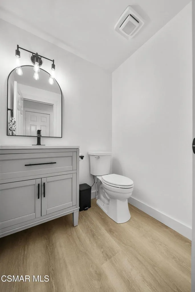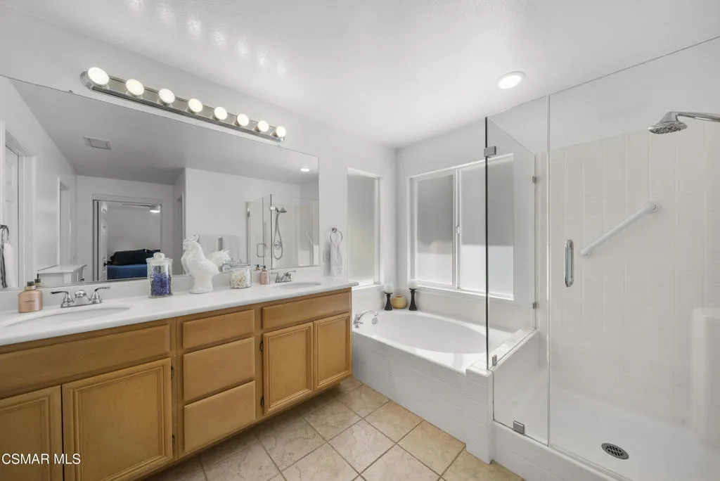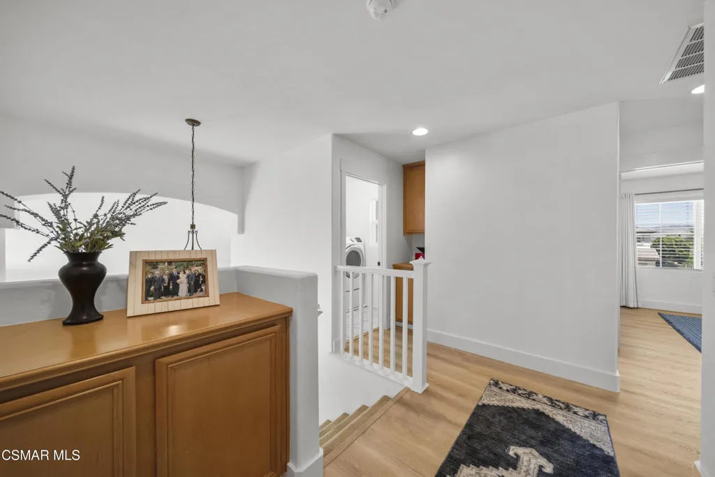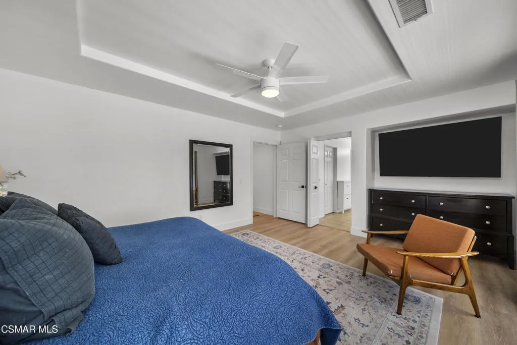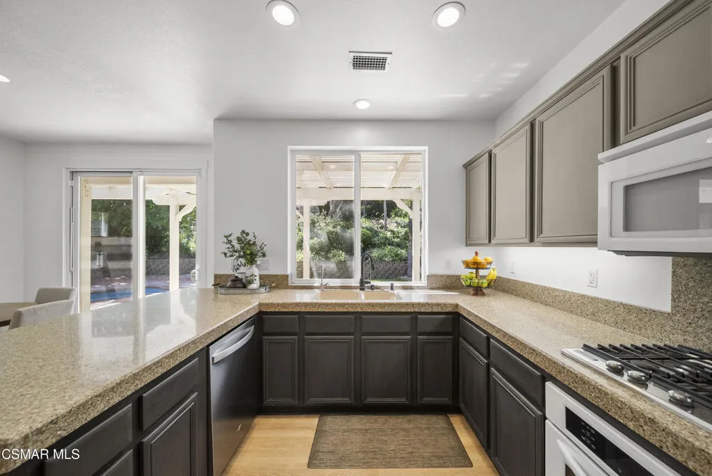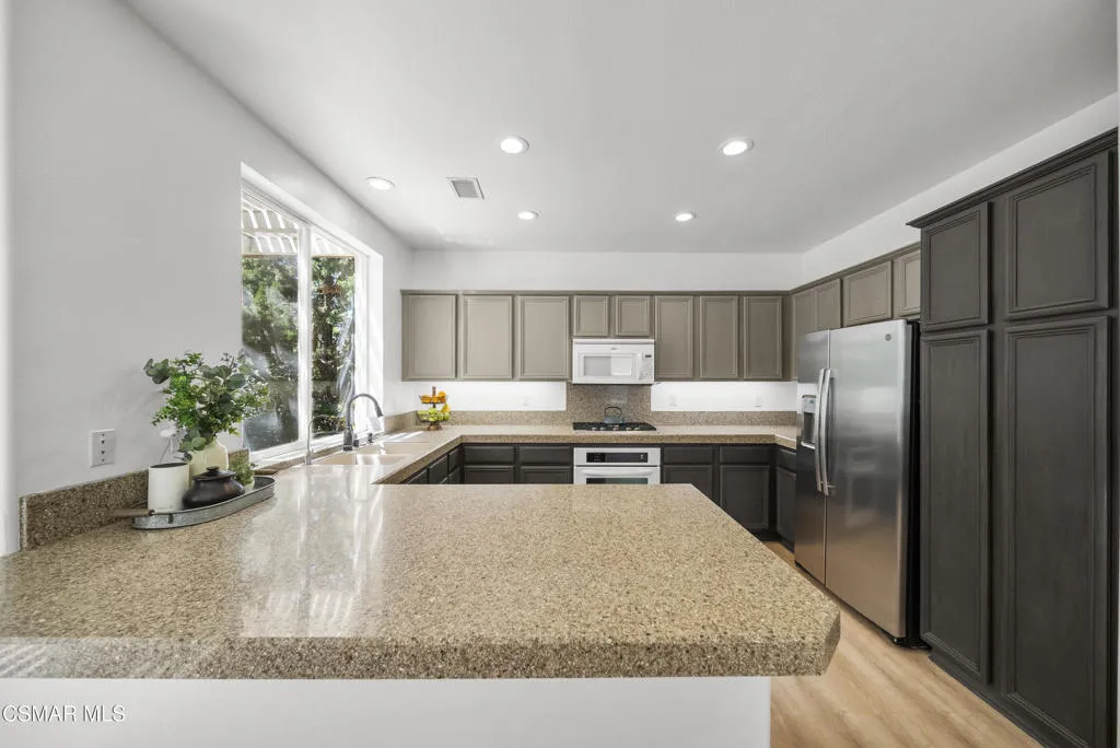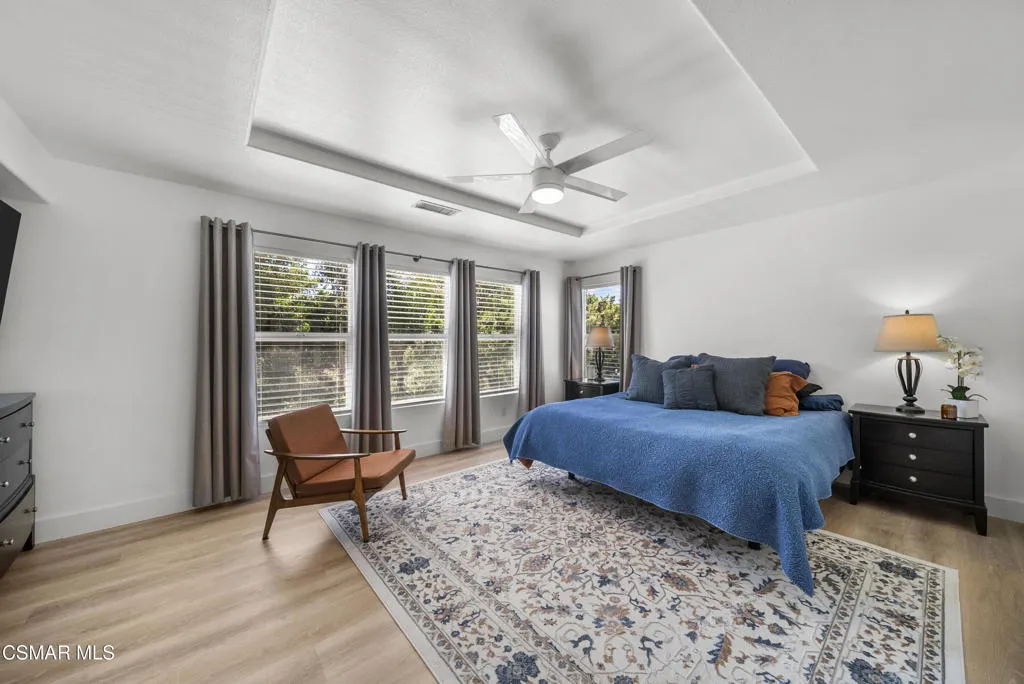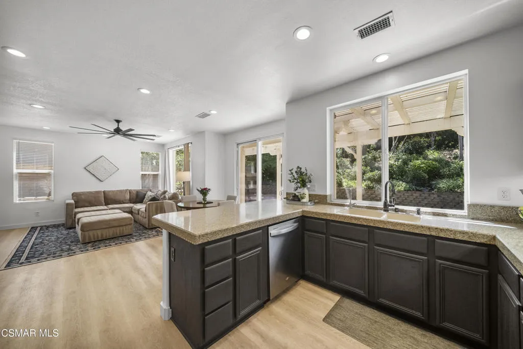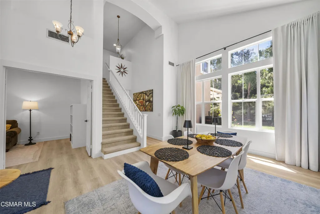 From the moment you arrive, this home makes a lasting impression with its beautifully maintained curb appeal, manicured landscaping, and inviting front entry. Step inside to cathedral ceilings and an abundance of natural light that fills the formal living and dining space. Large windows, custom oversized Pottery Barn drapes, and modern interior paint create a bright, airy feel, while luxury vinyl plank flooring flows seamlessly throughout, complemented by wood baseboards and wood-wrapped doors for a clean, elevated look.As you move further into the home, the living room opens up as a warm and inviting gathering space, featuring a refinished fireplace, oversized modern ceiling fan, and dimmable recessed lighting that allows you to set the perfect mood. Just off this area, a versatile downstairs room offers flexibility for a home office, guest space, or additional living area.The kitchen is both functional and well-appointed, with ample counter space, updated stainless steel appliances including a newer dishwasher and refrigerator, and a layout that connects effortlessly to the main living areas--ideal for everyday living and entertaining.The fully remodeled downstairs bathroom showcases stylish, modern finishes and adds convenience for guests.Step outside to the backyard retreat, where you can unwind and entertain year-round. The spa is equipped with a Pool Guard walkable safety cover, offering both relaxation and added safety, and the yard is graced with mature landscape throughout creating your own private oasis.Upgrades continue behind the scenes with a recently replaced AC condenser (2023), FULLY-OWNED solar panel system for energy efficiency, an Ecobee smart home system featuring smart thermostats and a doorbell camera for comfort and peace of mind, and a 2-car attached garage with direct access.Beyond the home, enjoy close proximity to beautifully maintained neighborhood parks featuring playgrounds, greenbelt paths, and sports courts--perfect for an active lifestyle.This move-in ready Simi Valley home blends modern upgrades, thoughtful design, and a prime location into one exceptional opportunity.
