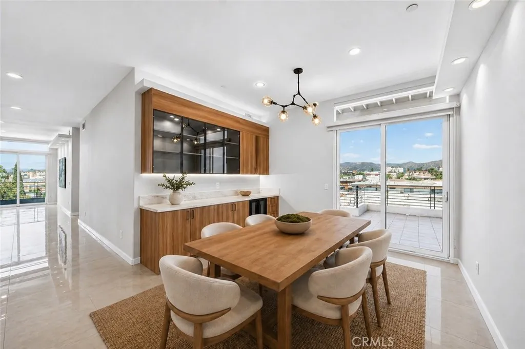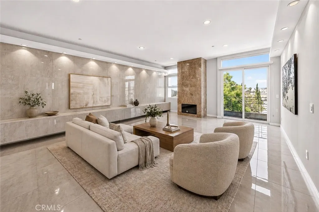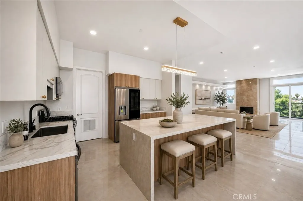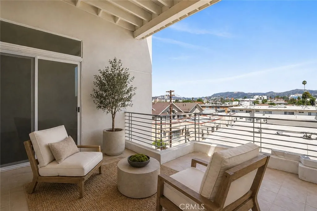 Welcome to 401 N Serrano Ave Penthouse 3, a rare offering in the heart of Koreatown. This beautifully reimagined penthouse showcases one of the most desirable floor plans in the community, blending refined design, privacy, and effortless indoor-outdoor living with sweeping views of the Hollywood Sign, Griffith Observatory, and the sparkling city skyline. Spanning approximately 1,800 square feet, this 3 bedroom, 2 bath residence welcomes you with an expansive open concept layout, soaring ceilings, and thoughtfully curated finishes throughout. The fully remodeled kitchen is both sophisticated and functional, featuring quartz countertops, custom cabinetry, a generous center island with seating, and premium Samsung and LG appliances. The adjacent dining area is enhanced by a built-in buffet and wine fridge, seamlessly opening to a private balcony, perfect for enjoying serene daytime views and vibrant city lights in the evening. The living room is equally impressive, anchored by a statement fireplace and custom built-in entertainment area, with sliding glass doors that lead to a second private balcony. The primary suite offers a tranquil retreat with direct balcony access, a beautifully remodeled ensuite bath, and a spacious walk-in closet with built-ins. Two additional bedrooms provide flexibility for guests, office space, or additional living needs, with one featuring access to its own balcony. A remodeled hallway bath, indoor laundry room, and walk-in pantry complete the home’s thoughtful layout. Residents enjoy access to a private fitness center, secured parking garage, and convenient elevator access, along with two tandem parking spaces. Ideally located just moments from premier dining, shopping, and entertainment; including Paramount Studios, The Grove, Beverly Hills, West Hollywood, and Downtown Los Angeles. This home also offers convenient access to major freeways 101, 110, 10 and the Metro. A rare opportunity to own a truly move in ready penthouse in one of Los Angeles most vibrant and sought after neighborhoods.