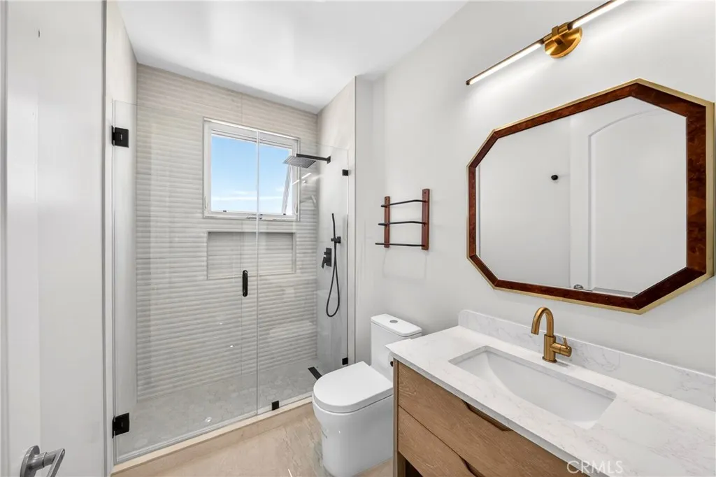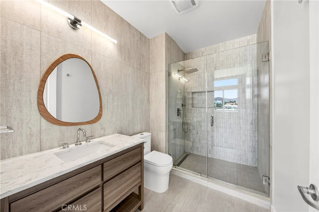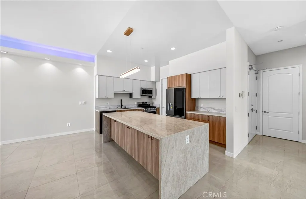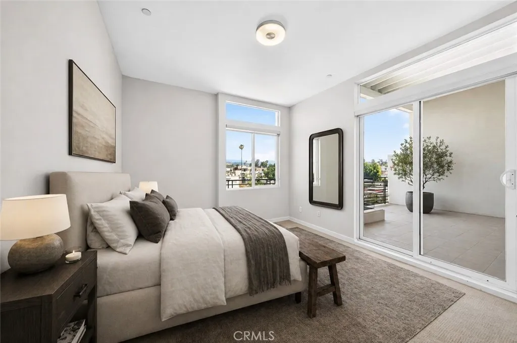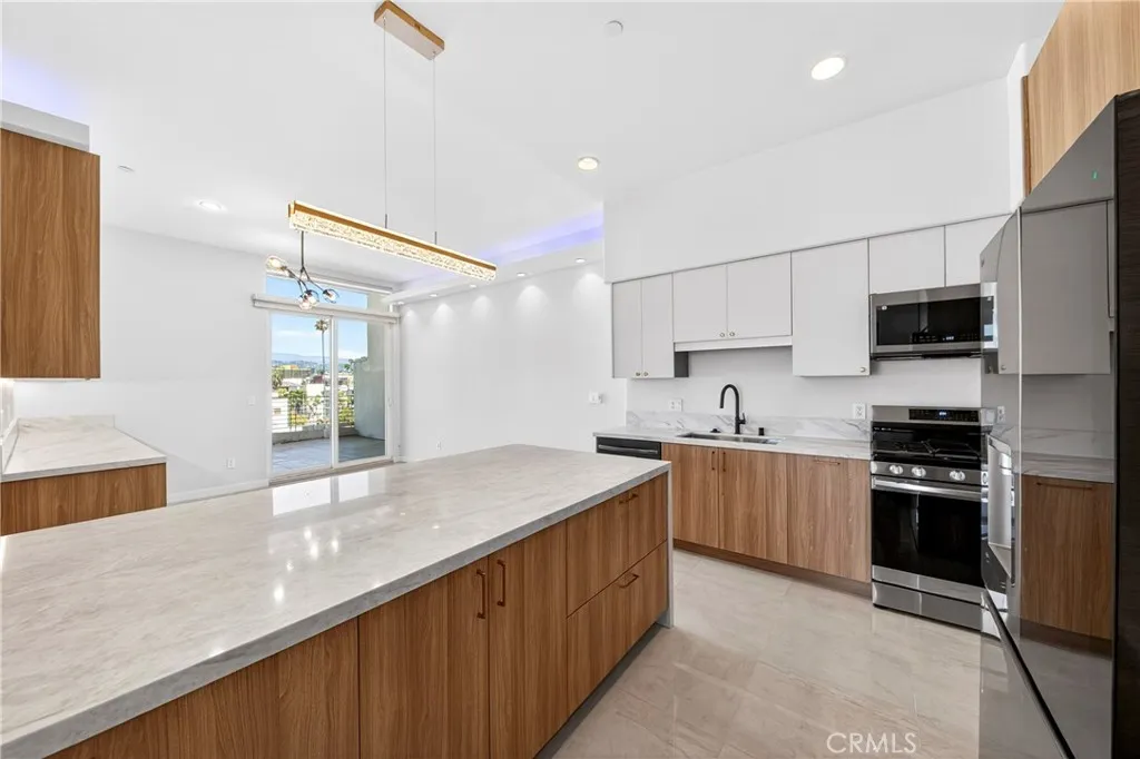 Welcome to 401 N Serrano Ave Penthouse 3, a rare offering in the heart of Koreatown. This beautifully reimagined penthouse showcases one of the most desirable floor plans in the community, blending refined design, privacy, and effortless indoor-outdoor living with sweeping views of the Hollywood Sign, Griffith Observatory, and the sparkling city skyline. Spanning approximately 1,800 square feet, this 3 bedroom, 2 bath residence welcomes you with an expansive open concept layout, soaring ceilings, and thoughtfully curated finishes throughout. The fully remodeled kitchen is both sophisticated and functional, featuring quartz countertops, custom cabinetry, a generous center island with seating, and premium Samsung and LG appliances. The adjacent dining area is enhanced by a built-in buffet and wine fridge, seamlessly opening to a private balcony, perfect for enjoying serene daytime views and vibrant city lights in the evening. The living room is equally impressive, anchored by a statement fireplace and custom built-in entertainment area, with sliding glass doors that lead to a second private balcony. The primary suite offers a tranquil retreat with direct balcony access, a beautifully remodeled ensuite bath, and a spacious walk-in closet with built-ins. Two additional bedrooms provide flexibility for guests, office space, or additional living needs, with one featuring access to its own balcony. A remodeled hallway bath, indoor laundry room, and walk-in pantry complete the home’s thoughtful layout. Residents enjoy access to a private fitness center, secured parking garage, and convenient elevator access, along with two tandem parking spaces. Ideally located just moments from premier dining, shopping, and entertainment; including Paramount Studios, The Grove, Beverly Hills, West Hollywood, and Downtown Los Angeles. This home also offers convenient access to major freeways 101, 110, 10 and the Metro. A rare opportunity to own a truly move in ready penthouse in one of Los Angeles most vibrant and sought after neighborhoods.