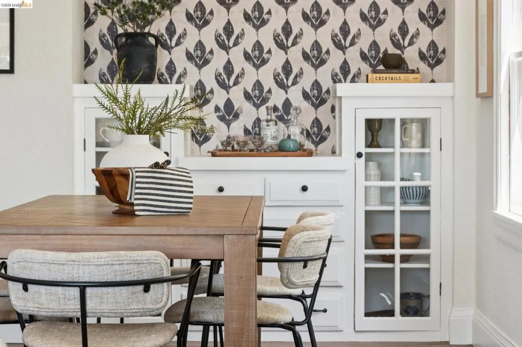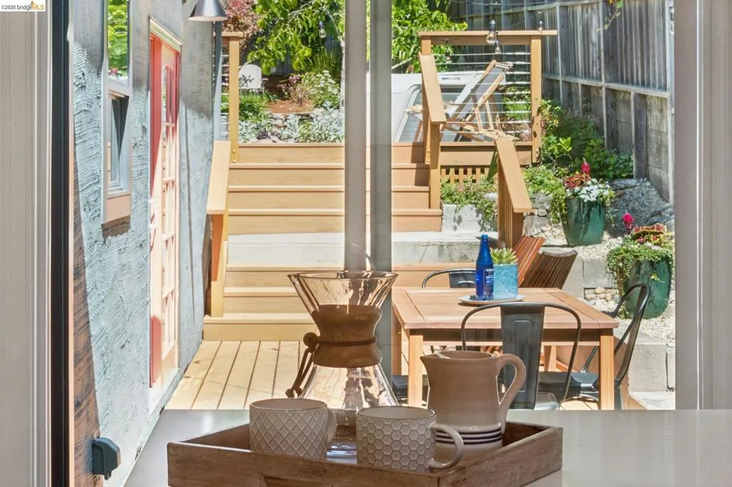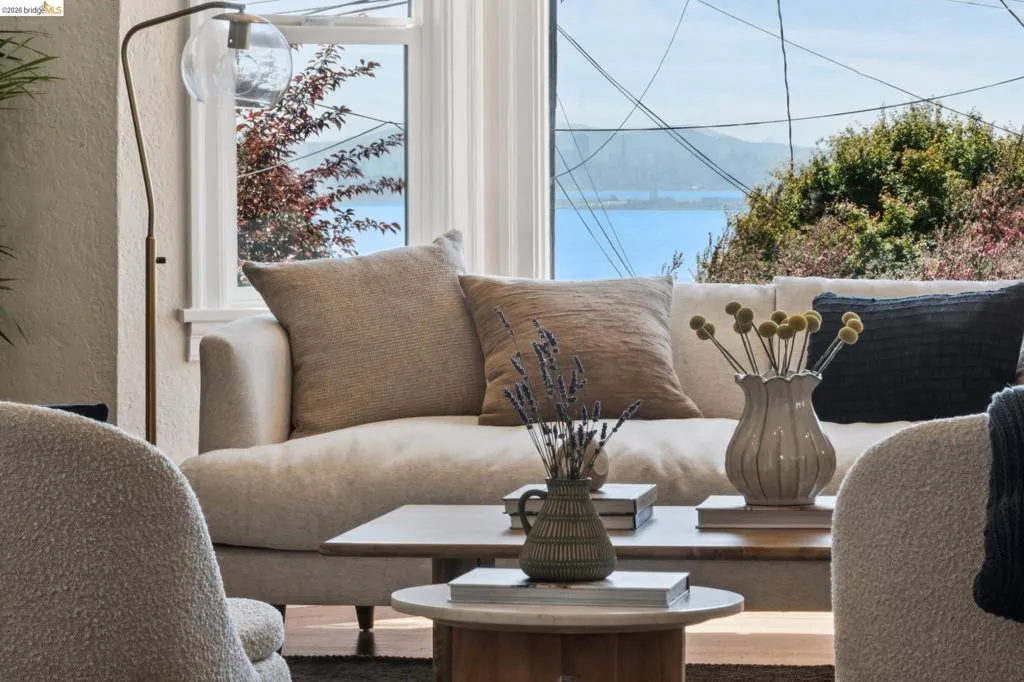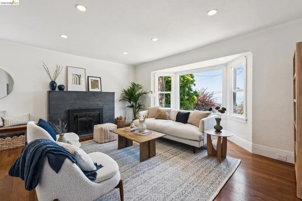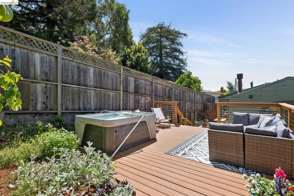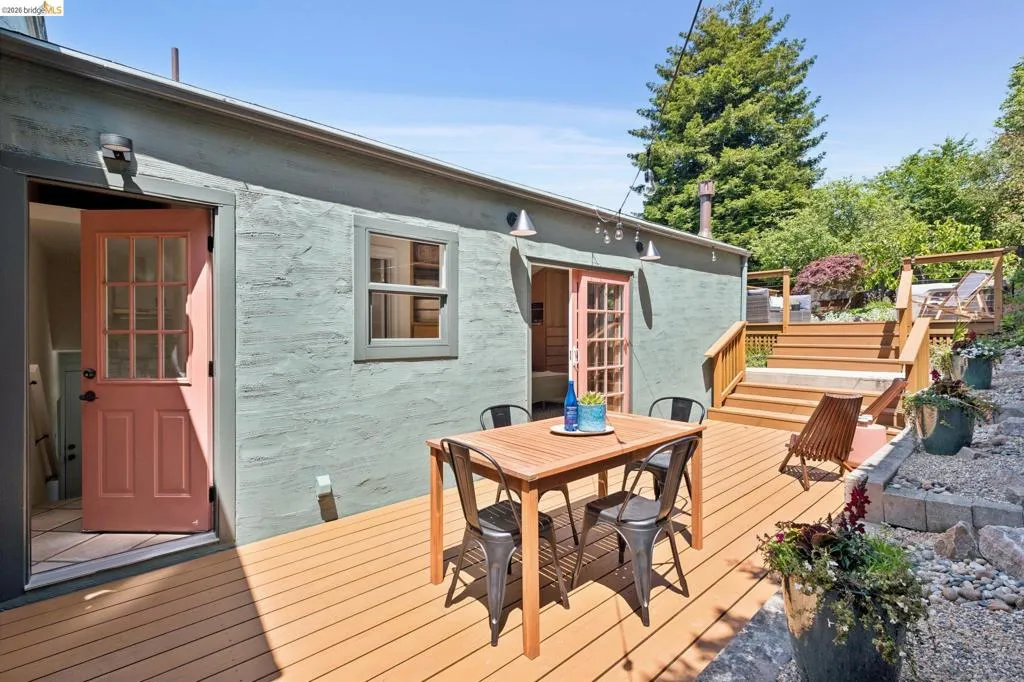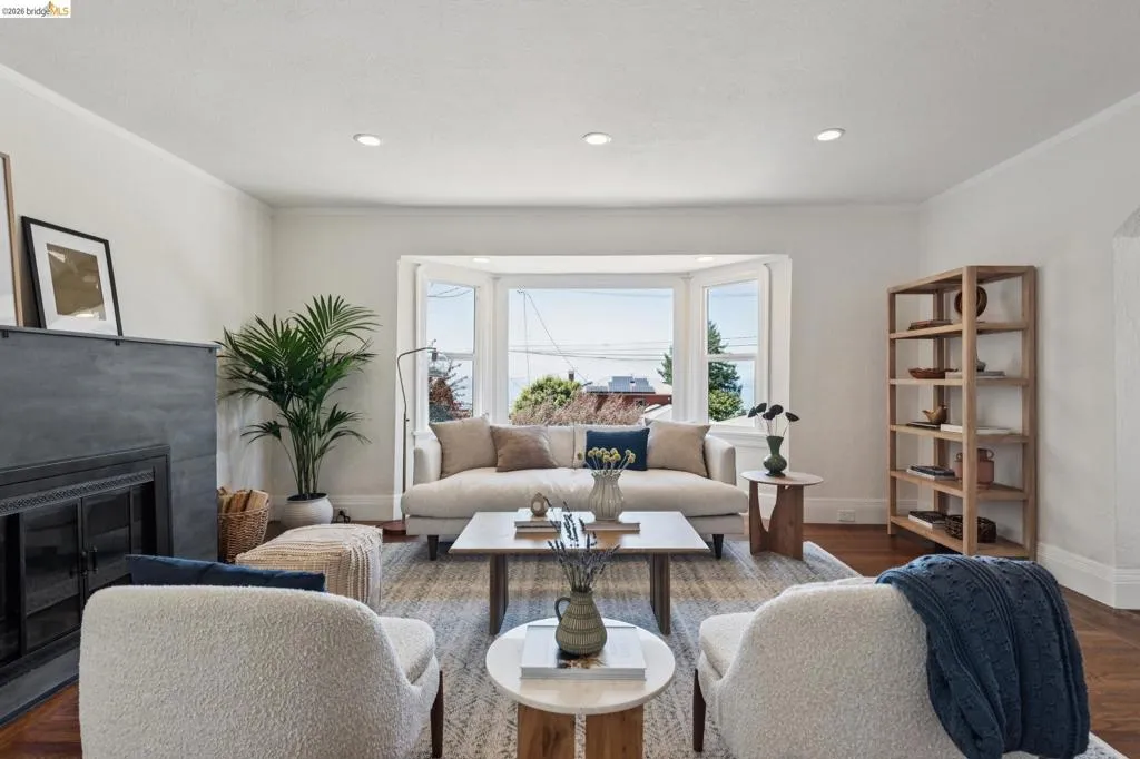 Step through a formal foyer and you’re immediately greeted with Bay views, leading into a bright, open living space centered around a sleek fireplace. The living area flows easily into the formal dining room, where the original built-ins adds a nice mix of coolness and practical storage. The layout is a true three-bedroom, two-bath setup. Two generously sized bedrooms sit on one side near an updated bathroom, while the primary suite is set apart at the back of the home, overlooking the landscaped yard and giving it a quieter, more private feel. The kitchen blends modern updates with vintage charm, featuring new countertops, a classic stove, and a convenient high counter with seating. It opens seamlessly to a deck, creating that coveted great indoor-outdoor flow. The backyard has everything you may need: a deck for dining, space for lounging, mature plantings, a grassy area and a hot tub! A detached garage provides excellent storage - and offers exciting potential for an ADU, perhaps? Energy Audit is 4. Peet's Coffee on Solano Avenue is literally five minutes away (per google), offering easy access to North Berkeley stores and amenities.
