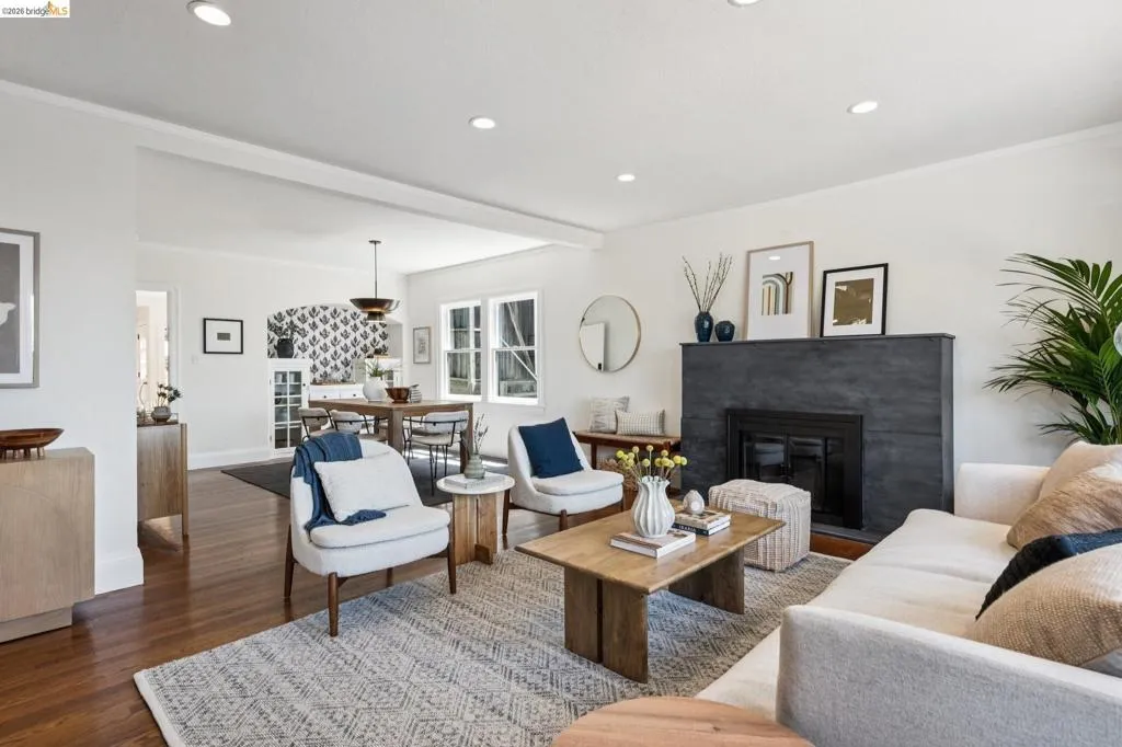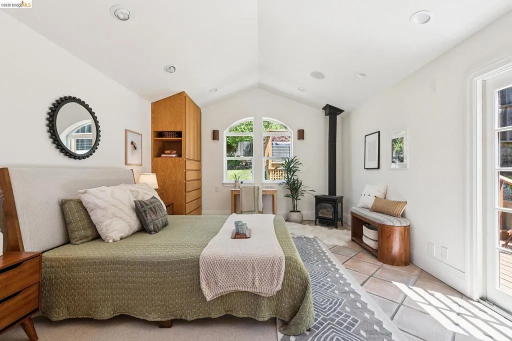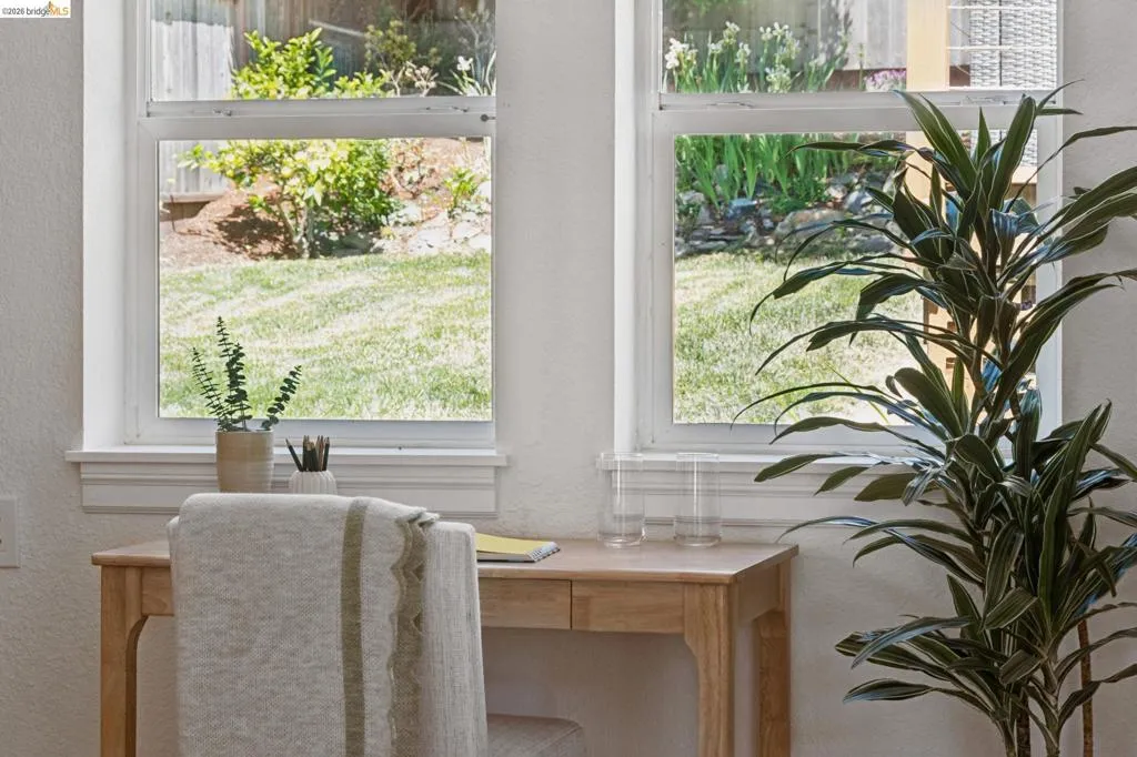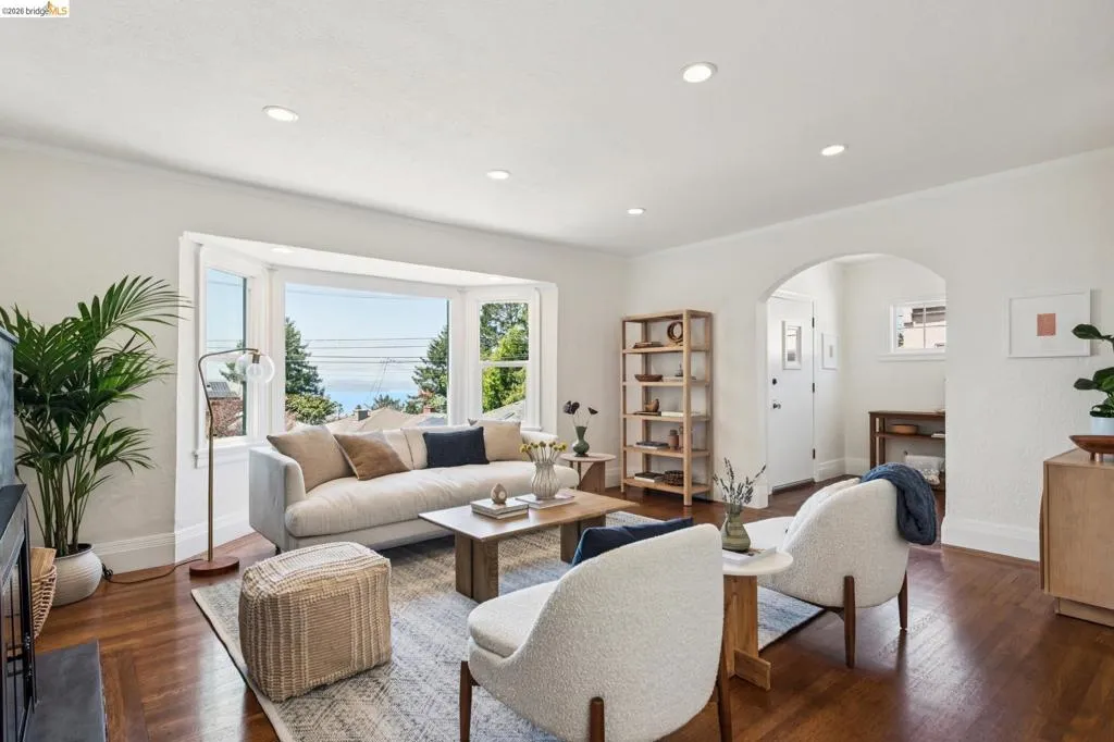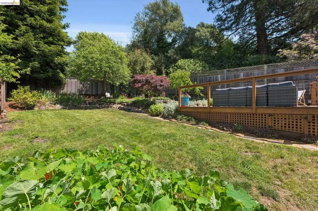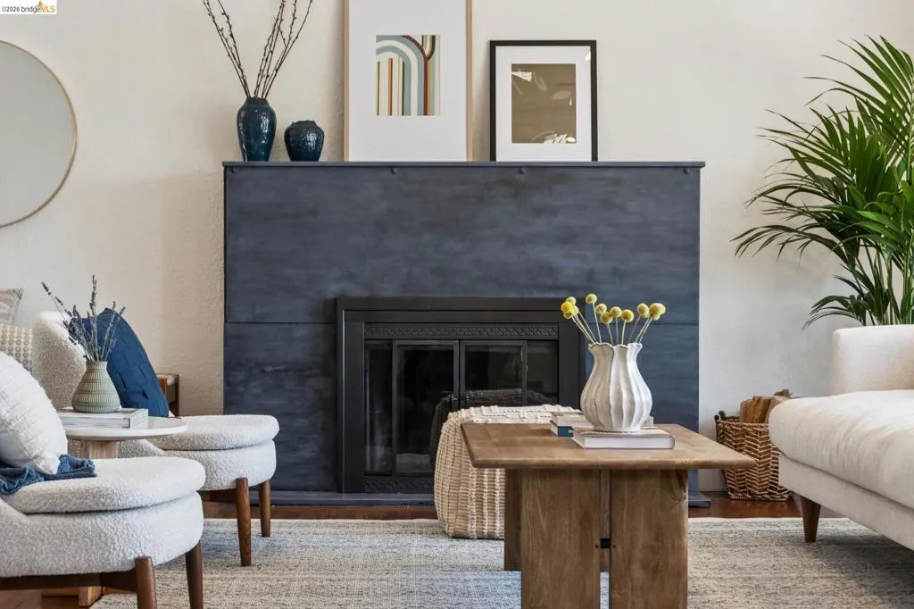 Step through a formal foyer and you’re immediately greeted with Bay views, leading into a bright, open living space centered around a sleek fireplace. The living area flows easily into the formal dining room, where the original built-ins adds a nice mix of coolness and practical storage. The layout is a true three-bedroom, two-bath setup. Two generously sized bedrooms sit on one side near an updated bathroom, while the primary suite is set apart at the back of the home, overlooking the landscaped yard and giving it a quieter, more private feel. The kitchen blends modern updates with vintage charm, featuring new countertops, a classic stove, and a convenient high counter with seating. It opens seamlessly to a deck, creating that coveted great indoor-outdoor flow. The backyard has everything you may need: a deck for dining, space for lounging, mature plantings, a grassy area and a hot tub! A detached garage provides excellent storage - and offers exciting potential for an ADU, perhaps? Energy Audit is 4. Peet's Coffee on Solano Avenue is literally five minutes away (per google), offering easy access to North Berkeley stores and amenities.