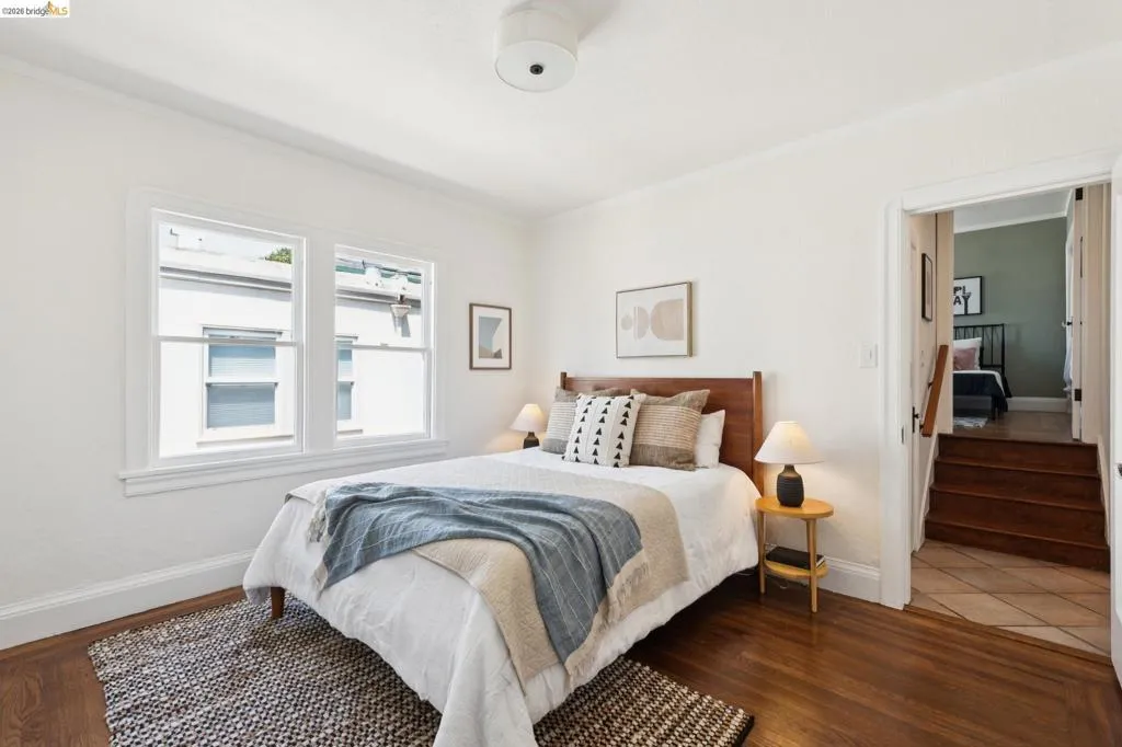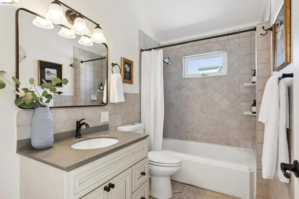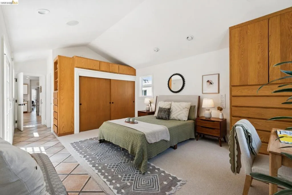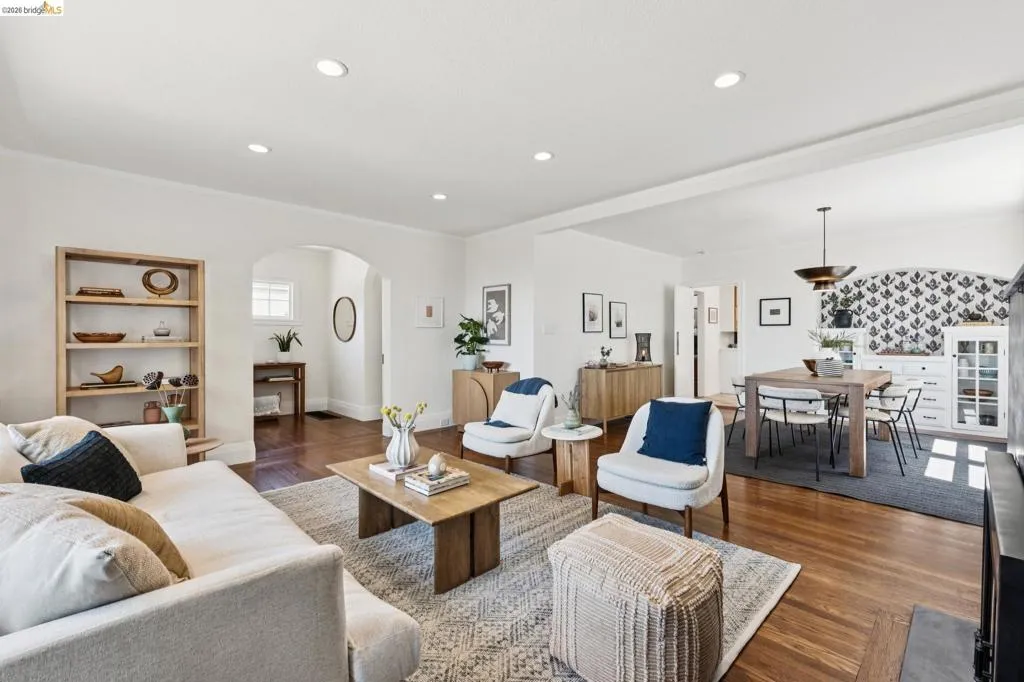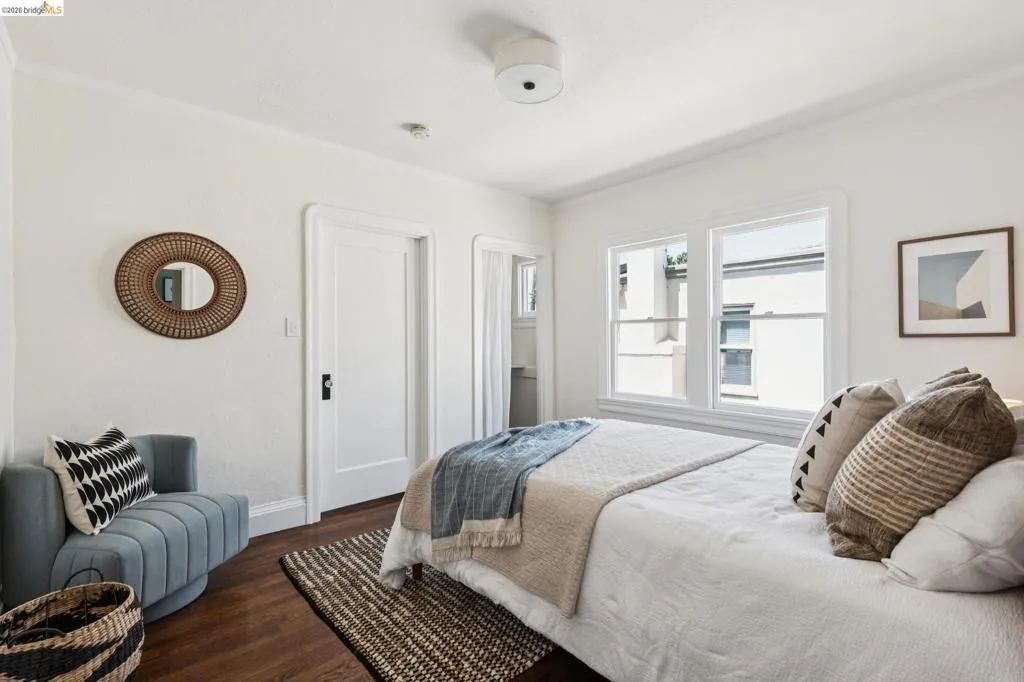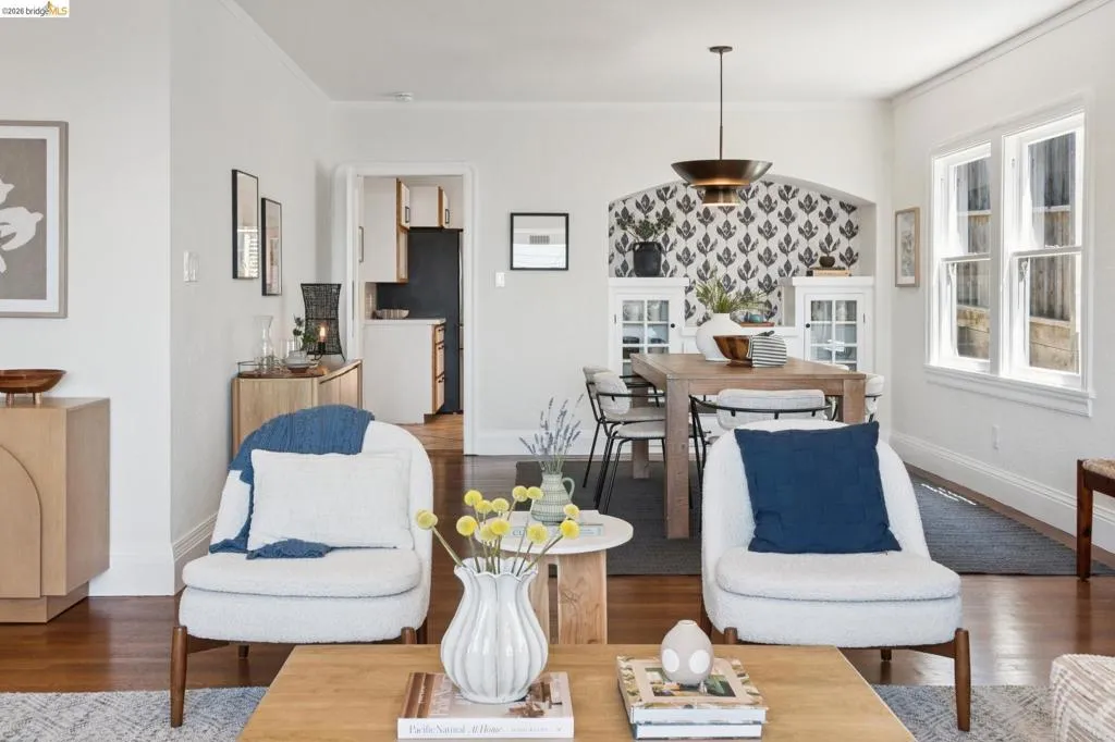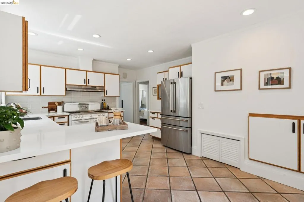 Step through a formal foyer and you’re immediately greeted with Bay views, leading into a bright, open living space centered around a sleek fireplace. The living area flows easily into the formal dining room, where the original built-ins adds a nice mix of coolness and practical storage. The layout is a true three-bedroom, two-bath setup. Two generously sized bedrooms sit on one side near an updated bathroom, while the primary suite is set apart at the back of the home, overlooking the landscaped yard and giving it a quieter, more private feel. The kitchen blends modern updates with vintage charm, featuring new countertops, a classic stove, and a convenient high counter with seating. It opens seamlessly to a deck, creating that coveted great indoor-outdoor flow. The backyard has everything you may need: a deck for dining, space for lounging, mature plantings, a grassy area and a hot tub! A detached garage provides excellent storage - and offers exciting potential for an ADU, perhaps? Energy Audit is 4. Peet's Coffee on Solano Avenue is literally five minutes away (per google), offering easy access to North Berkeley stores and amenities.