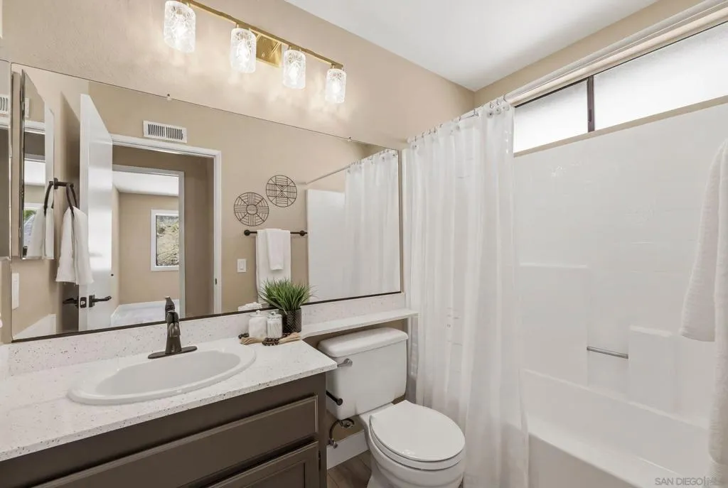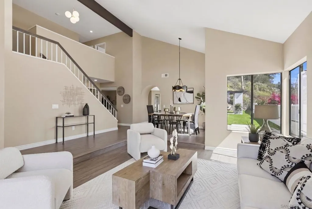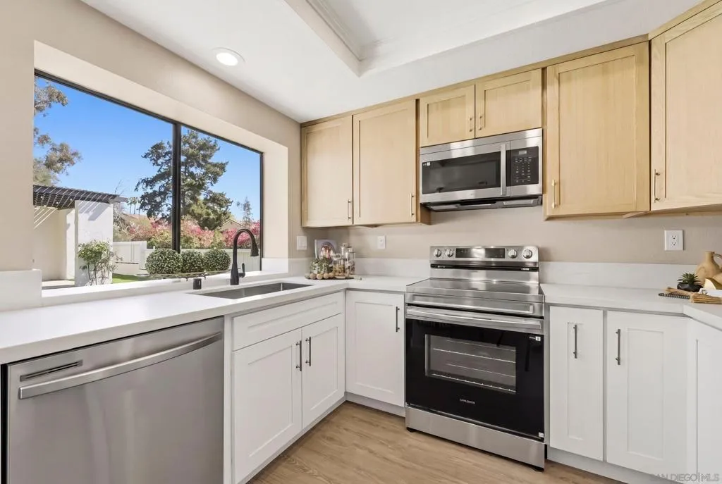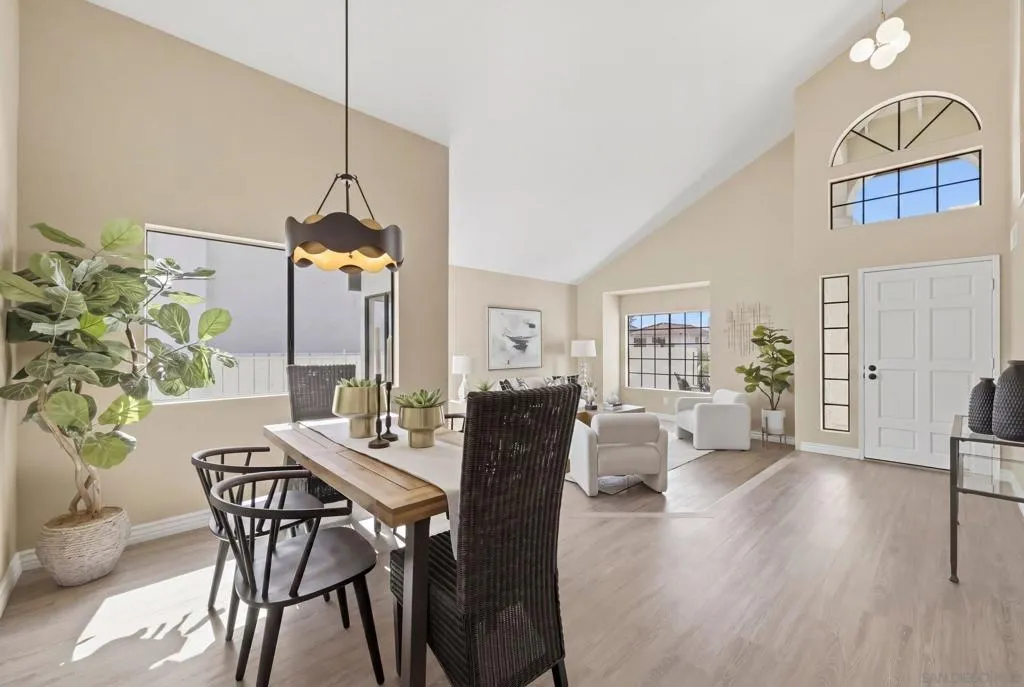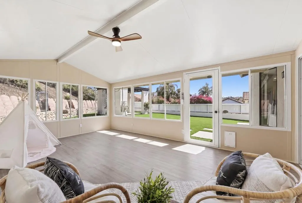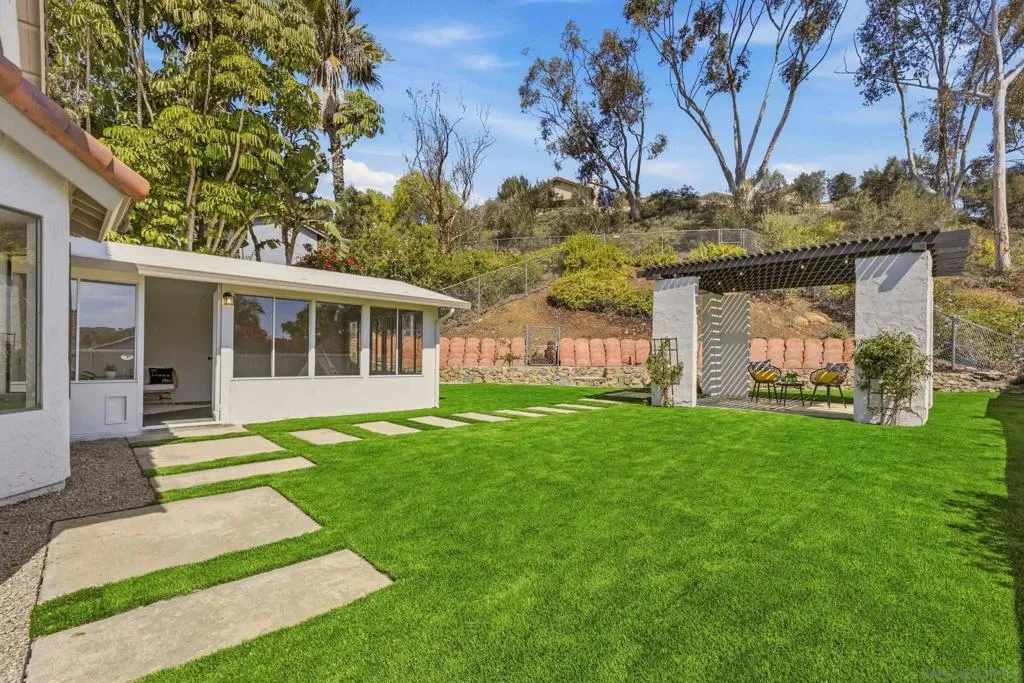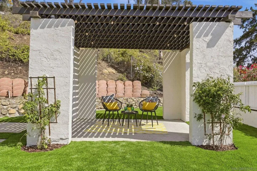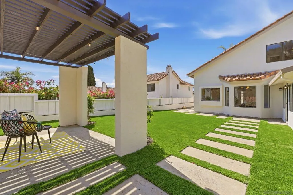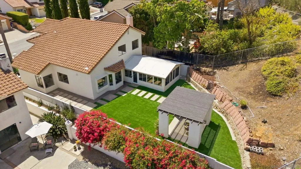 Some homes are just houses. This one feels like a fresh start. Nestled in coveted Park Village, this beautifully refreshed home greets you with soaring ceilings, sun-drenched rooms, and brand-new finishes throughout — new paint, new flooring, new kitchen, new light fixtures. Every detail whispers move right in. The heart of the home opens to a spacious sunroom bathed in natural light, flowing seamlessly to a private, low-maintenance backyard retreat — lush artificial turf, a charming pergola draped in string lights, and blooming bougainvillea framing it all. Upstairs, a vaulted primary suite offers the quiet sanctuary you've been dreaming of. This is the one you've been waiting for. No HOA. No Mello Roos. Close to stores, restaurants, library, fire & police stations, and YMCA. Award winning Poway Unified Schools. Home Upgrades: New interior paint throughout: walls, baseboards, stairs, & bathroom cabinetry 2026. New exterior paint including front door, garage door, body and trim 2026. Kitchen remodel including new cabinetry, quartz countertops, appliances, light fixtures, hardware, sink, garbage disposal, and faucet 2026 New LVP flooring in up baths with new faucets, sinks, & accessories 2026. New light fixtures throughout 2026. New LED recessed lighting throughout 2026. New interior doorknobs 2026. New ceiling fan in sunroom 2026. New closet doors in down and up guest bedrooms 2026. New garage doors 2026 New artificial turf with a landscape refresh 2026. Newer LVP flooring downstairs installed a few years ago. Schools: Canyonview Elementary, Mesa Verde Middle, Westview High