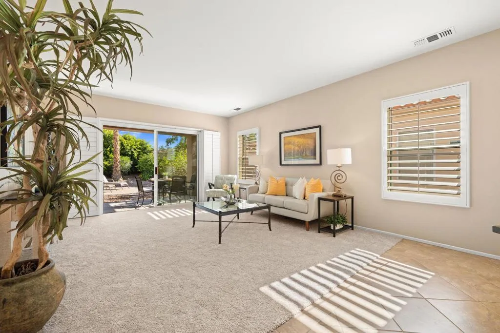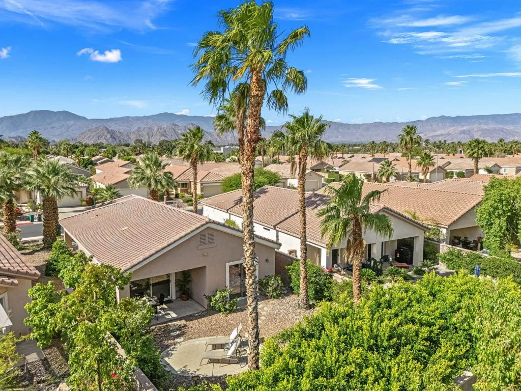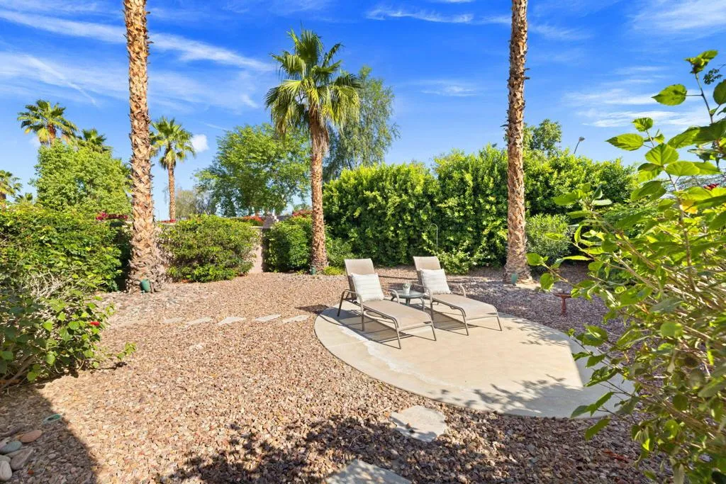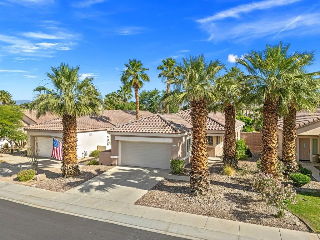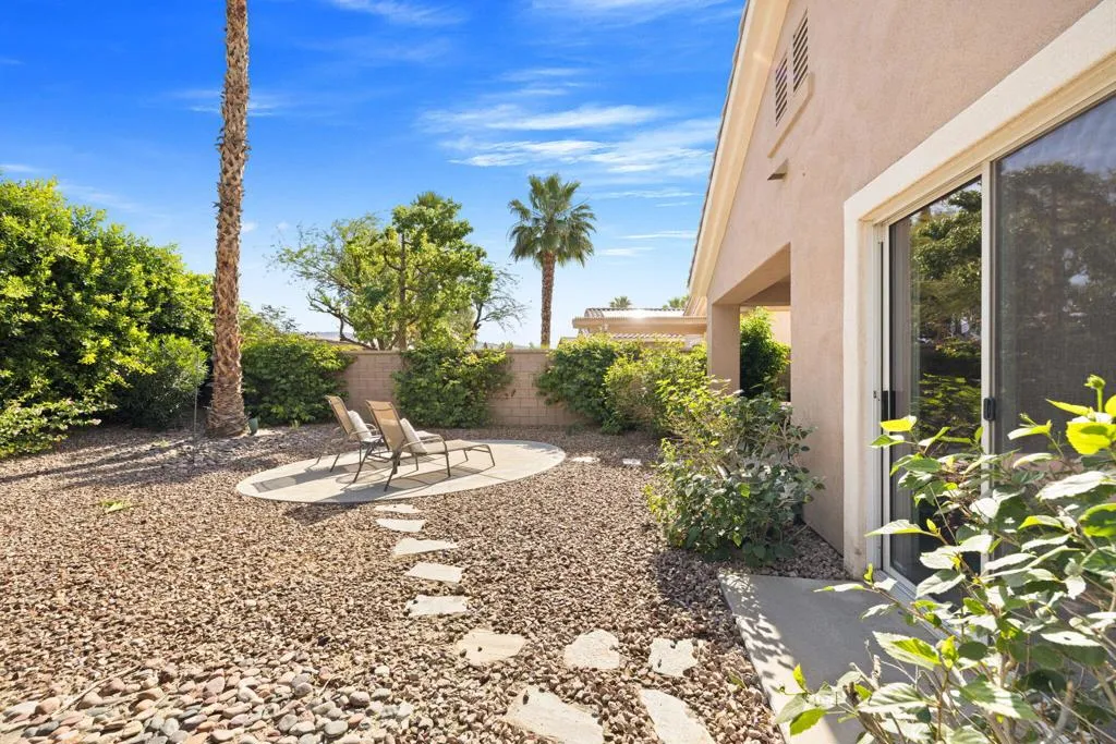 Located in the best 55+ community in the valley, Sun City Palm Desert, this Newport model is one of the favorites. It has 2 bedrooms, 2 bathrooms, and a 2-car garage. It has beautiful new carpet and a large, private, cool, north-facing backyard. The kitchen has Corian counters, stainless appliances, a cozy kitchenette, and opens to the bright cheery living room. The master suite has a view of the low-maintenance backyard and a nice bathroom with a double vanity, walk-in shower, and a walk-in closet. The guest bedroom is adjacent to the 2nd full bathroom and is very comfortable and inviting. The garage has the washer and dryer and is very roomy. This home has access to a close by semi-private pool area with a saltwater pool, a hot tub, hot showers, bathrooms, and a BBQ party area, for an extra HOA fee of approx. 50.00. This home is a great deal and is ready to move in.