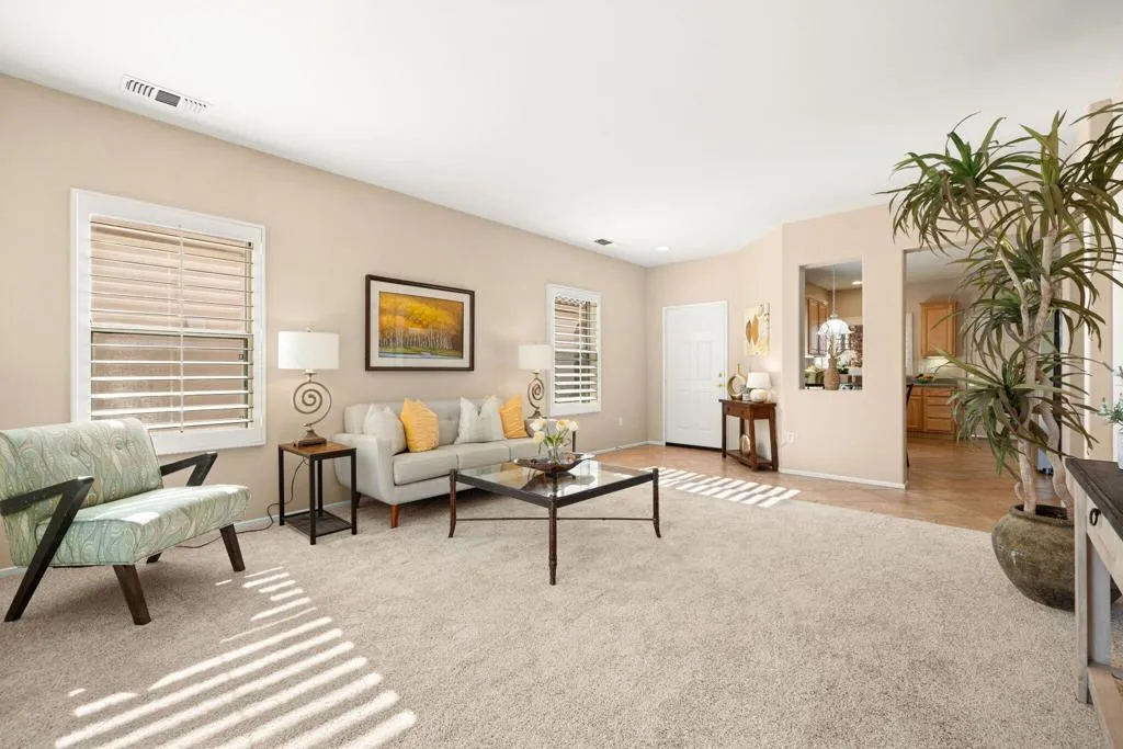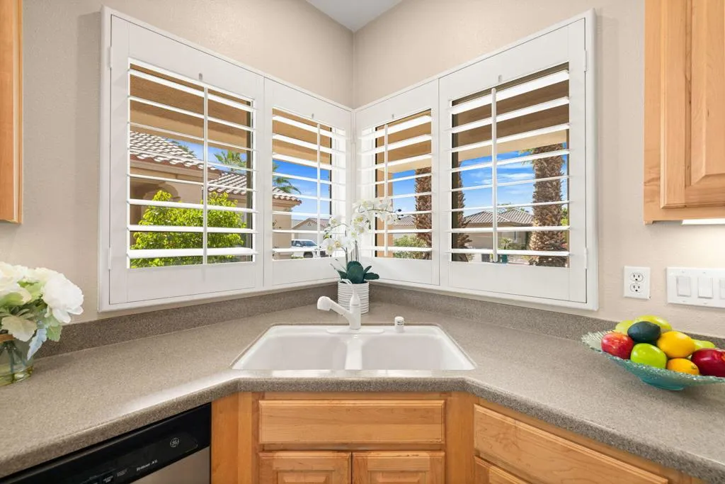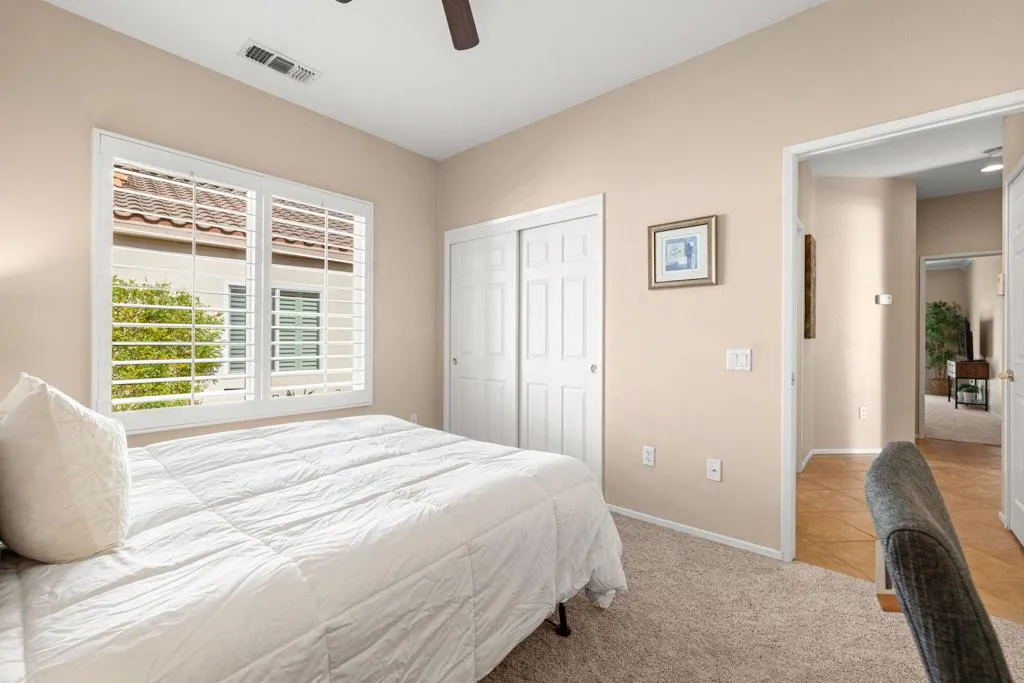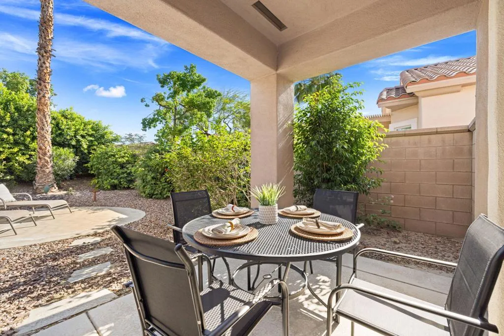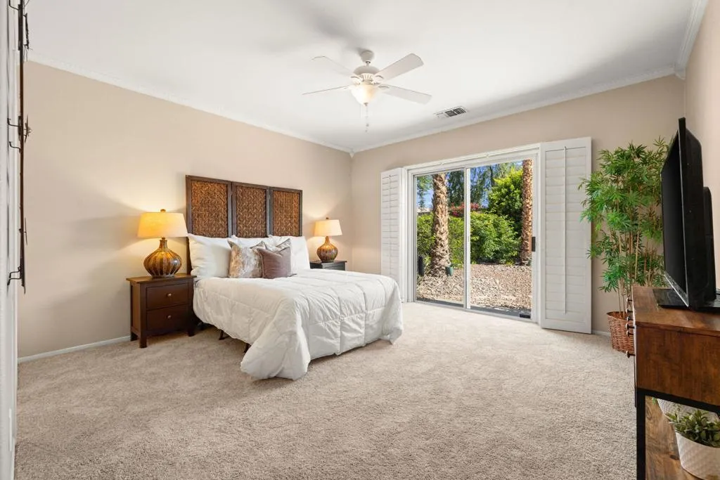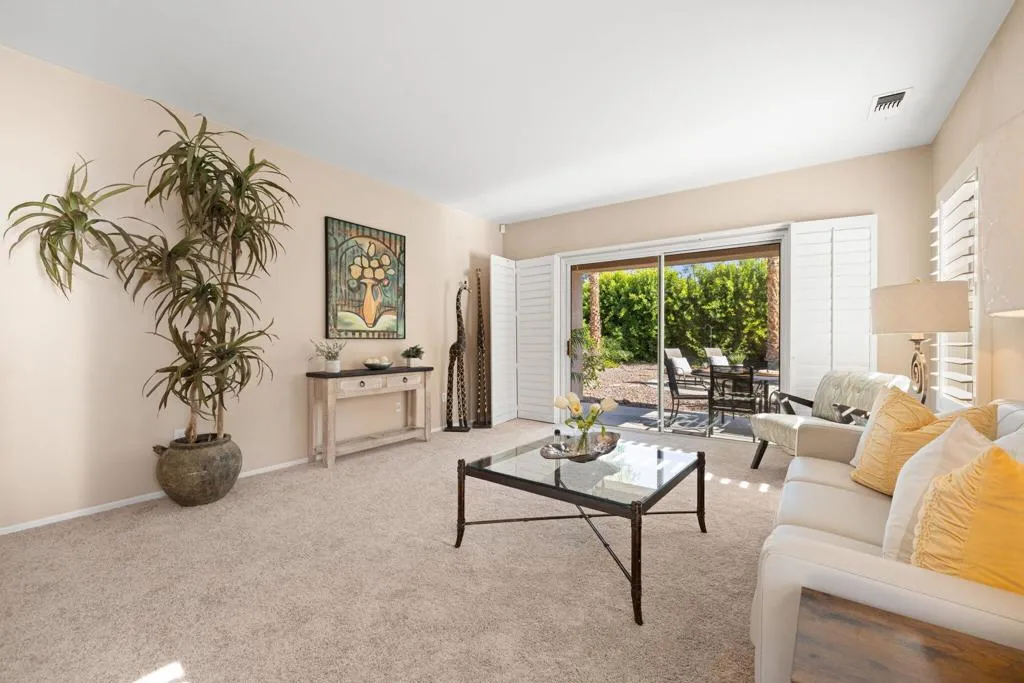 Located in the best 55+ community in the valley, Sun City Palm Desert, this Newport model is one of the favorites. It has 2 bedrooms, 2 bathrooms, and a 2-car garage. It has beautiful new carpet and a large, private, cool, north-facing backyard. The kitchen has Corian counters, stainless appliances, a cozy kitchenette, and opens to the bright cheery living room. The master suite has a view of the low-maintenance backyard and a nice bathroom with a double vanity, walk-in shower, and a walk-in closet. The guest bedroom is adjacent to the 2nd full bathroom and is very comfortable and inviting. The garage has the washer and dryer and is very roomy. This home has access to a close by semi-private pool area with a saltwater pool, a hot tub, hot showers, bathrooms, and a BBQ party area, for an extra HOA fee of approx. 50.00. This home is a great deal and is ready to move in.