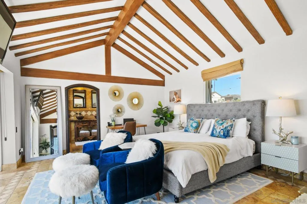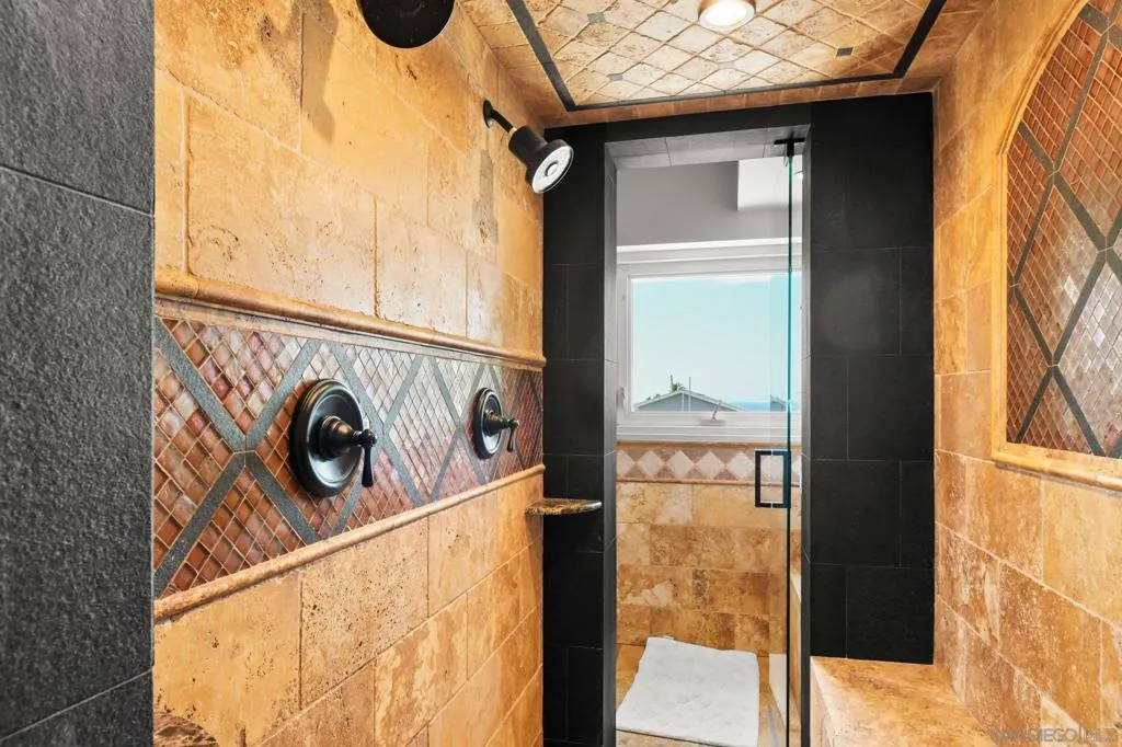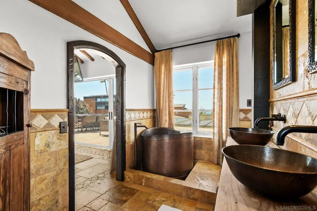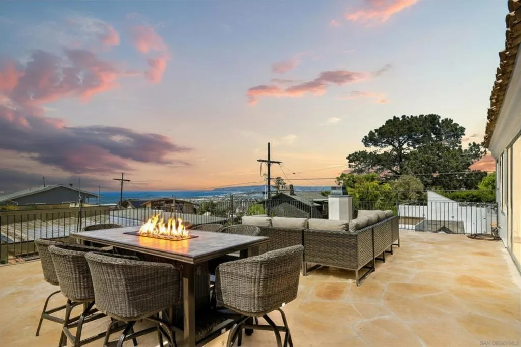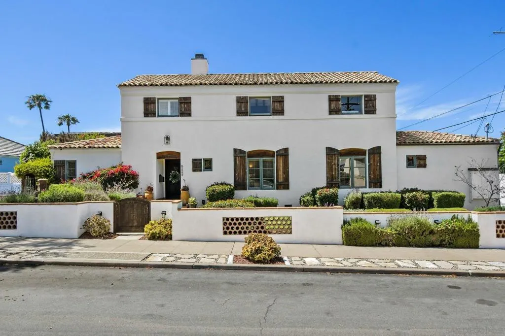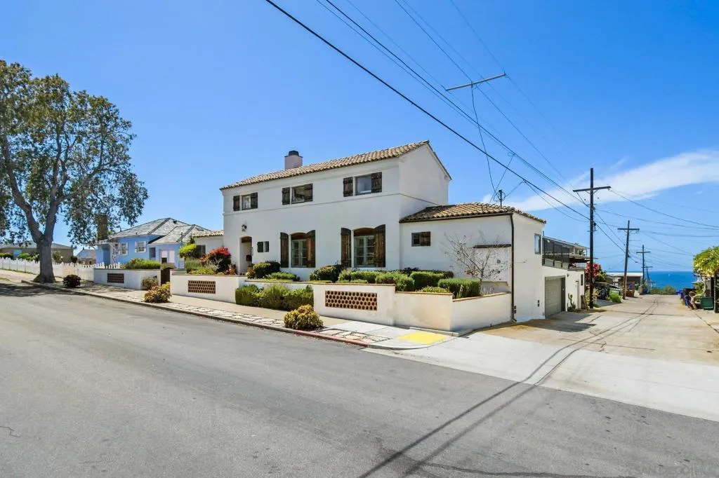 Experience elevated coastal living in this exquisitely custom-built and recently remodeled Spanish-style residence, designed by highly acclaimed architect Tony Crisafi of Island Architects and showcasing breathtaking panoramic views of the Pacific Ocean and Mission Bay. Offering two living areas, five bedrooms, including two en-suite bedrooms, and three and a half baths, this exceptional home is thoughtfully curated with timeless architecture, refined finishes, and elegant detail, blending classic Spanish charm with sophisticated comfort. The gourmet kitchen is beautifully appointed with distinctive granite countertops, premium Thermador appliances, a hammered copper sink, and custom cabinetry featuring a wood-paneled hidden refrigerator and pantry for a seamless, sophisticated design. Exposed beams in the living area and an oversized stone fireplace create a warm, dramatic focal point, while sliding glass pocket doors in both the main living areas and the primary suite provide a seamless indoor-outdoor connection. The luxurious primary suite is a private sanctuary with sweeping ocean views, direct access to the upper view deck, and a spa-inspired en-suite bath featuring a copper soaking tub and a stone tile steam shower with dual shower heads. Gracious living and dining spaces open to a serene private courtyard with lush grass and a tranquil fountain, all connected to the upper deck for unforgettable sunset views and refined entertaining. An attached two-car garage with a Tesla charger adds convenience for modern coastal living. This is the one you’ve been waiting for!