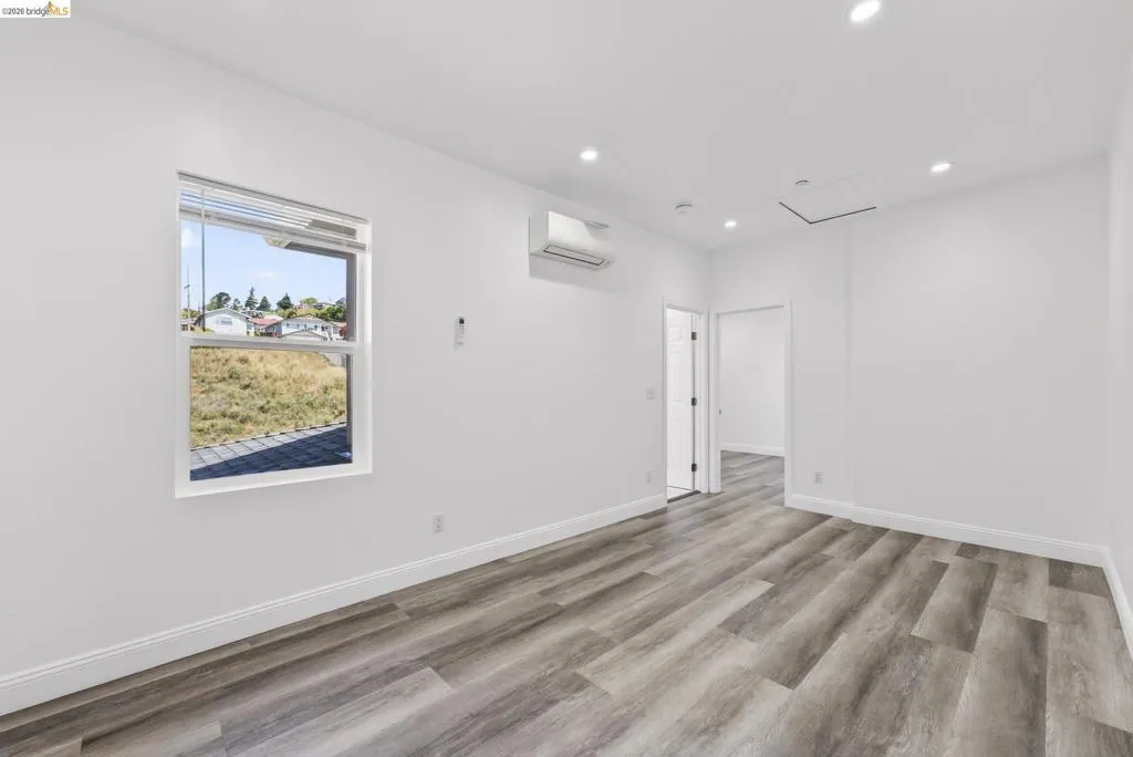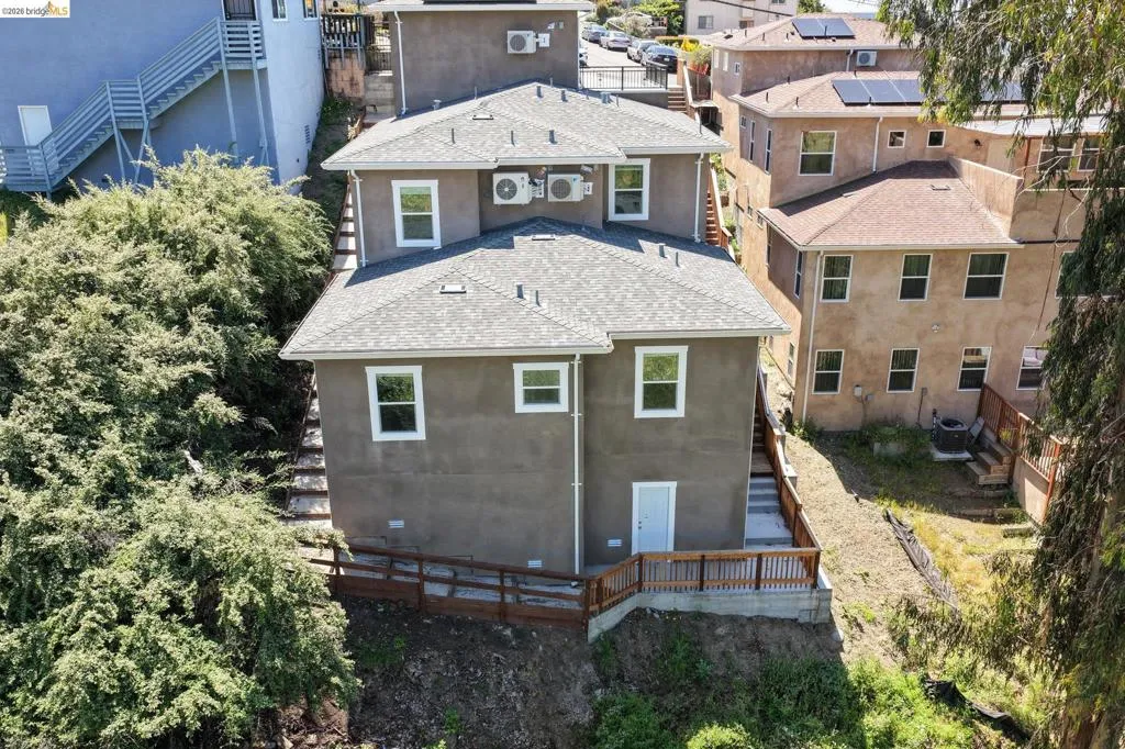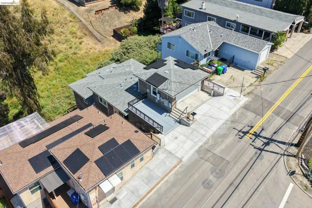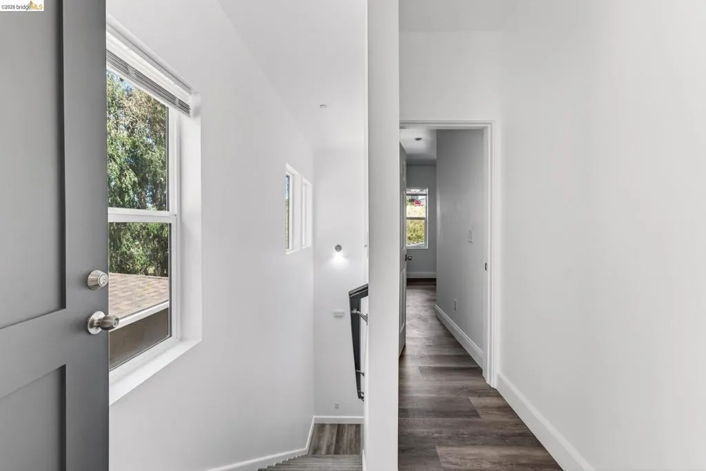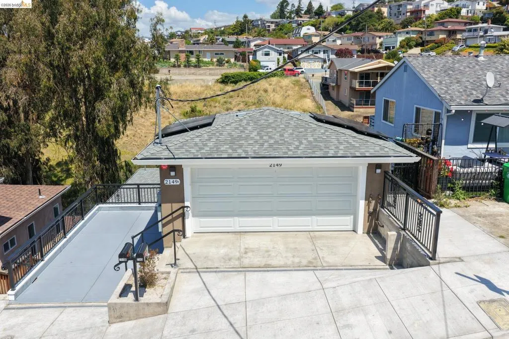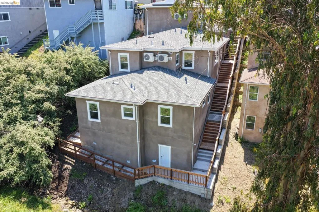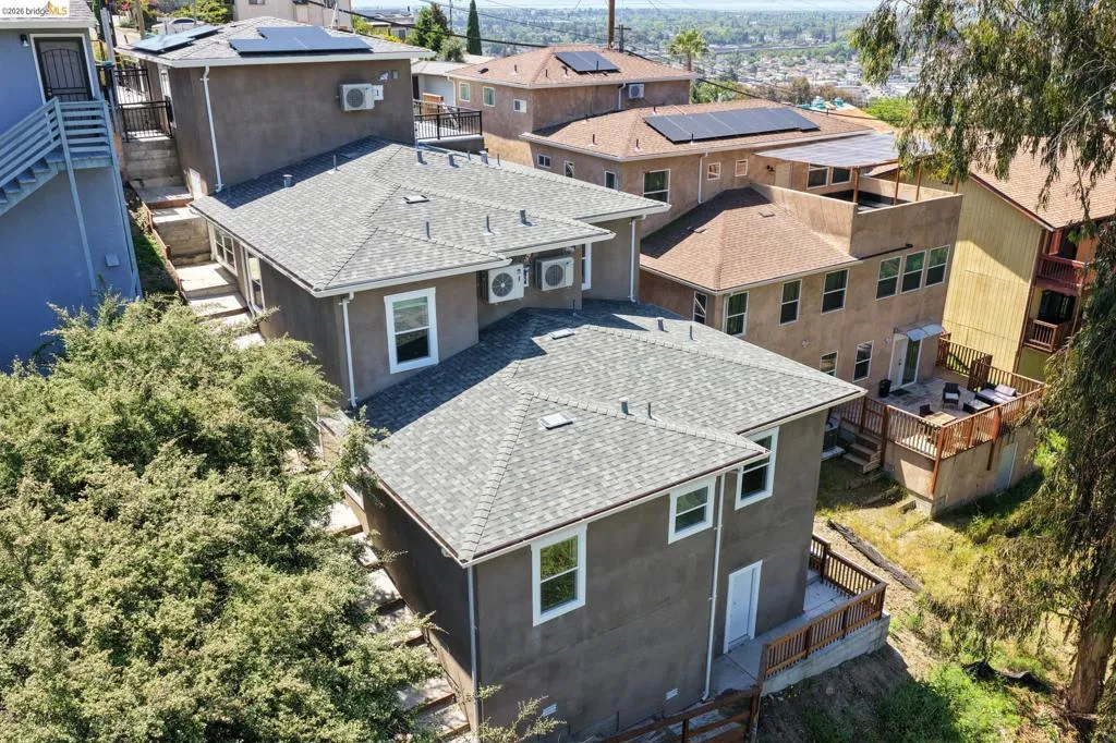 Perched on a downslope lot, this newly built contemporary home blends clean design with functional living and sweeping neighborhood views. Located in the desirable San Leandro area, this thoughtfully designed residence features 3 spacious bedrooms and 3 full bathrooms, plus a versatile 1 bed 1 bath ADU (Accessory Dwelling Unit)—ideal for extended family, guests, or rental income. The main home showcases an open-concept layout filled with natural light, wide-plank laminated flooring, and a seamless flow between living, dining, and kitchen spaces. The modern kitchen is a standout, featuring sleek white shaker cabinetry, quartz countertops, stainless steel appliances, and ample storage—perfect for both everyday living and entertaining. Each bedroom is generously sized, including a well-appointed primary suite designed for comfort and privacy. All three bathrooms feature contemporary finishes and stylish fixtures. Step outside to enjoy multiple levels of usable outdoor space, including a large patio area and elevated entry, offering both privacy and curb appeal. The downslope design enhances separation between living spaces and the ADU, maximizing flexibility. The detached ADU provides its own private entrance and living space—perfect for multigenerational living, a home office, or additional rental income potential. Conveniently located near major freeways, shopping, and dining, this property offers the perfect balance of modern living and accessibility. A rare opportunity to own a brand-new home with income potential—don’t miss it!