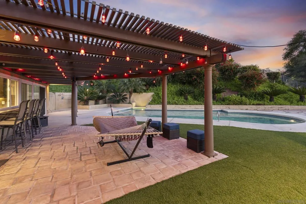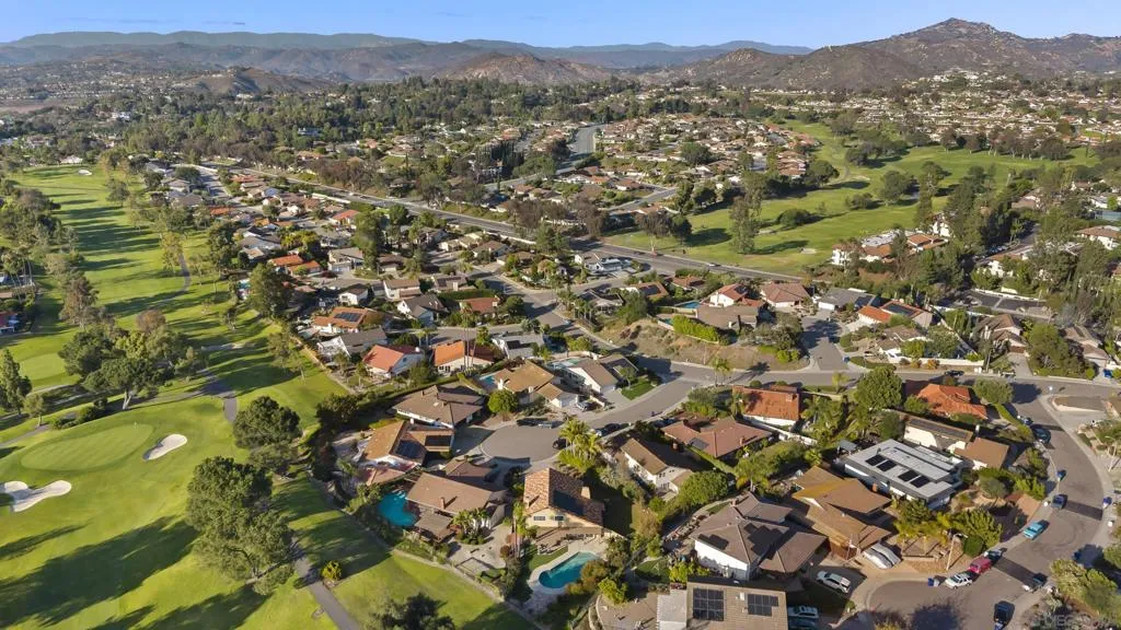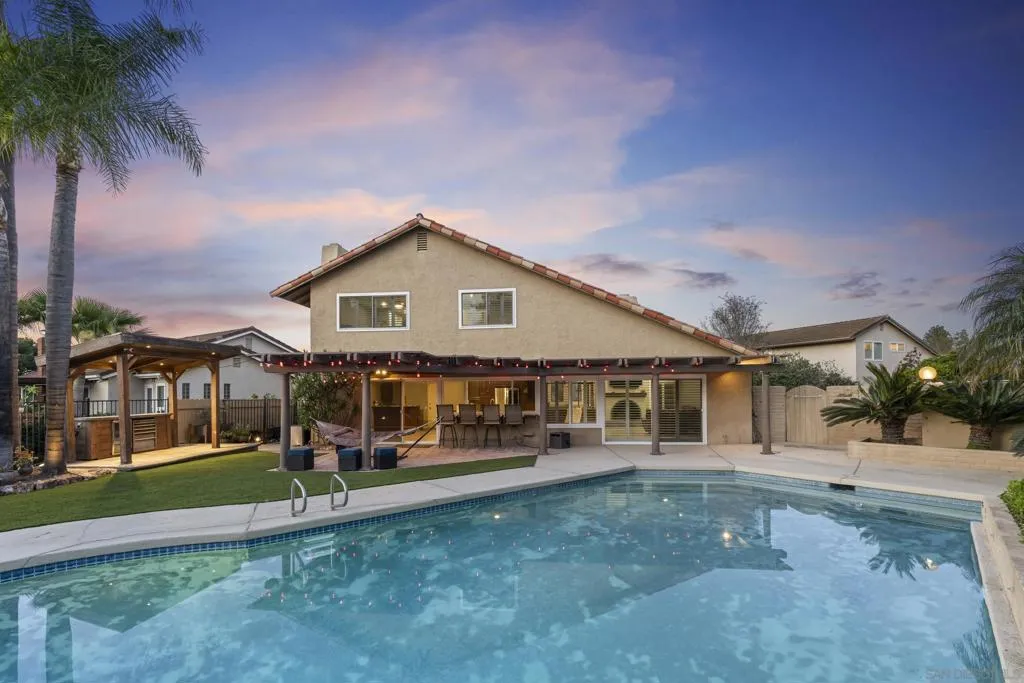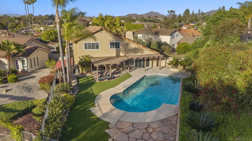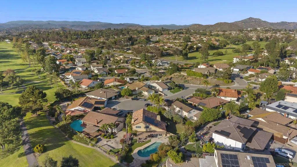 This 4-bedroom, 2.5-bath home offers 2,061 square feet of thoughtfully designed living space, highlighted by vaulted ceilings, abundant natural light, and a seamless connection to the backyard. Set on an oversized lot backing to open golf course space, it delivers a rare combination of privacy and usable outdoor living. Tucked away on a quiet cul-de-sac within the highly sought-after Poway school district, the home balances location, layout, and functionality. The larger driveway provides added convenience, and the two-car garage features epoxy flooring, built-in cabinetry, a dedicated tool table, and an EV charger, with ample storage throughout. Inside, two newer fireplaces add both warmth and updated character, a wine fridge enhances the home’s entertaining appeal, and custom closets add thoughtful organization throughout the home. Owned solar helps keep utility costs down. The backyard is designed for both relaxation and entertaining, with a large covered pergola strung with Edison lights, a pool with flagstone surround, a separate gazebo, and low-maintenance artificial turf, all framed by mature tropical landscaping for true privacy. Additional features include an outdoor fridge, outdoor shower, and a storage shed for added functionality. Beyond the fence line, golf course and mountain views create an elevated outdoor experience. With close proximity to schools, the award-winning Poway school district, golf, and everyday amenities, this property stands out for its lot size, livability, and overall versatility.
