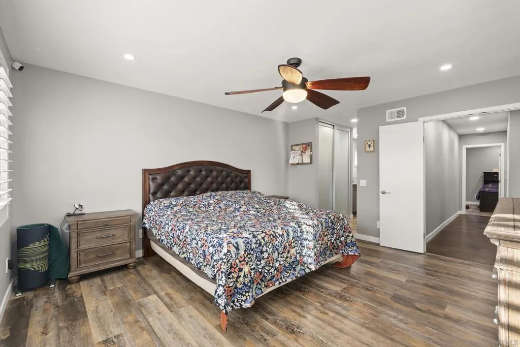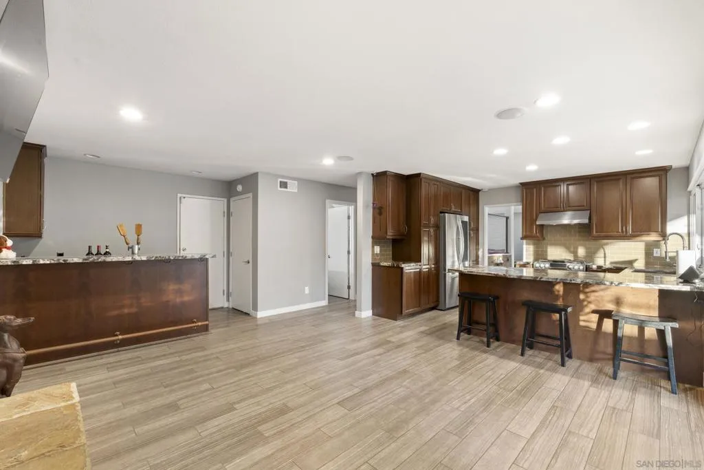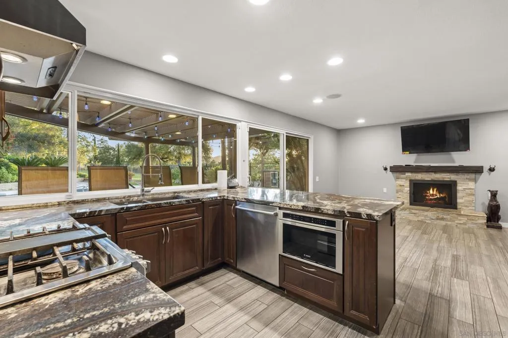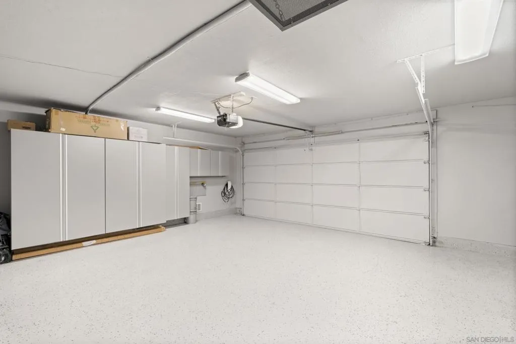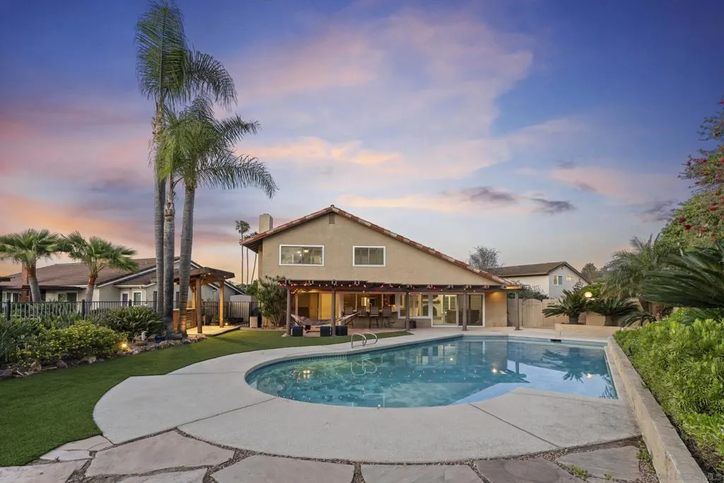 This 4-bedroom, 2.5-bath home offers 2,061 square feet of thoughtfully designed living space, highlighted by vaulted ceilings, abundant natural light, and a seamless connection to the backyard. Set on an oversized lot backing to open golf course space, it delivers a rare combination of privacy and usable outdoor living. Tucked away on a quiet cul-de-sac within the highly sought-after Poway school district, the home balances location, layout, and functionality. The larger driveway provides added convenience, and the two-car garage features epoxy flooring, built-in cabinetry, a dedicated tool table, and an EV charger, with ample storage throughout. Inside, two newer fireplaces add both warmth and updated character, a wine fridge enhances the home’s entertaining appeal, and custom closets add thoughtful organization throughout the home. Owned solar helps keep utility costs down. The backyard is designed for both relaxation and entertaining, with a large covered pergola strung with Edison lights, a pool with flagstone surround, a separate gazebo, and low-maintenance artificial turf, all framed by mature tropical landscaping for true privacy. Additional features include an outdoor fridge, outdoor shower, and a storage shed for added functionality. Beyond the fence line, golf course and mountain views create an elevated outdoor experience. With close proximity to schools, the award-winning Poway school district, golf, and everyday amenities, this property stands out for its lot size, livability, and overall versatility.