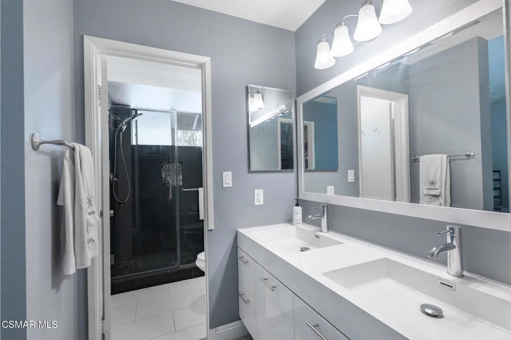 Enjoy resort style living in a tranquil sanctuary of creeks, and lush natural surroundings that invite you into an inviting and scenic ambiance. This immaculately remodeled three-level townhome shows beautifully light and airy with vaulted ceilings, a high-end modern design and a flawless open feel. Remodeled kitchen with high-end appliances, sophisticated quartz counters and custom cabinetry. Upstairs a large primary suite serves as a special retreat with treetop views from a private patio. Remodeled ensuite bathroom with double sinks, large tile shower, and ample size closet with updated light fixtures. The secondary oversized bedroom offers unique flexibility, and can easily convert to two bedrooms. The direct access garage leads to a versatile bonus room, perfect for home office, exercise studio, or craft area, and in-unit laundry. This thoughtfully tucked away home is ideally located near Warner Center Park, The Village, Westfield Topanga Mall and the soon to be upcoming Rams Village at Warner Center. With convenient access to beaches, transportation, shops, and fabulous restaurants. This is a rare opportunity to be a part of this incredible destination of sophistication and chic living. Amenities of this meticulously maintained association offering WiFi, water, lush grounds, private balconies, 3 resort-style pools, recreation room access, tennis and racquetball courts. Please use RentSpree.com for applications