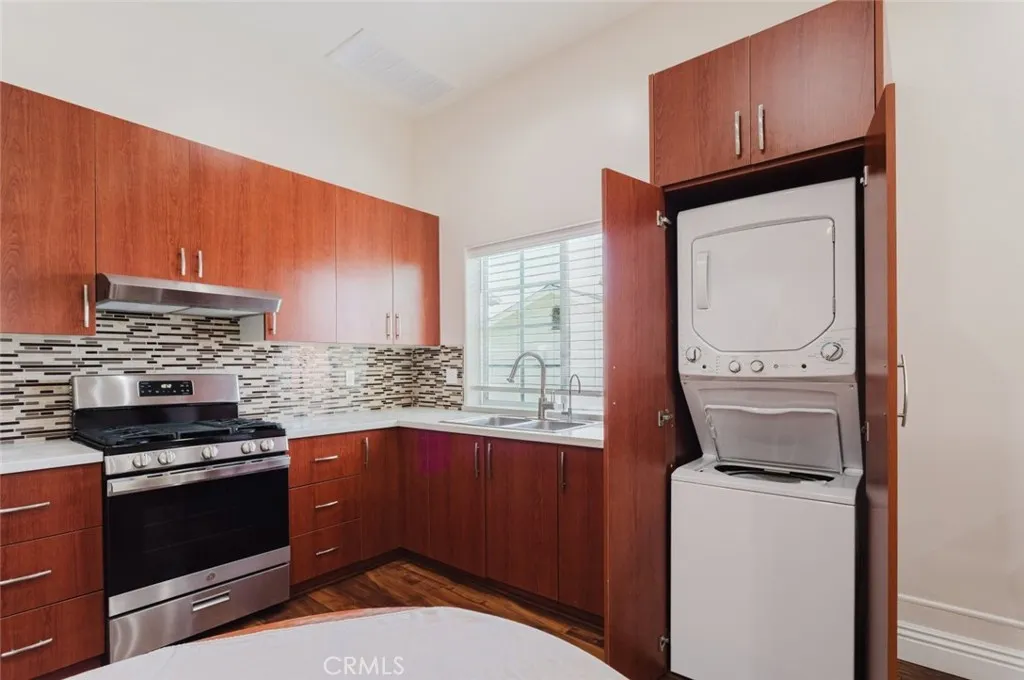 Beautifully designed 1-bedroom, 1-bath ADU offering approximately 700 square feet of open and airy living space in a prime Burbank location. This thoughtfully laid-out unit features high ceilings, recessed lighting, and warm wood-style flooring throughout, creating a bright and inviting atmosphere. The modern kitchen is equipped with sleek cabinetry, ample counter space, and included appliances, seamlessly opening to the living area for comfortable everyday living. A spacious bedroom and well-appointed bathroom provide both comfort and functionality. Enjoy the convenience of an in-unit stackable washer and dryer, a private entrance for added privacy, and 1 designated carport parking space. Ideally situated near shopping, dining, and major studios, this ADU offers a perfect blend of comfort and location.