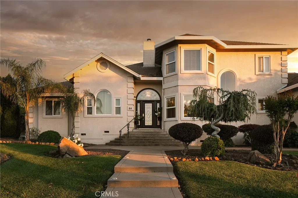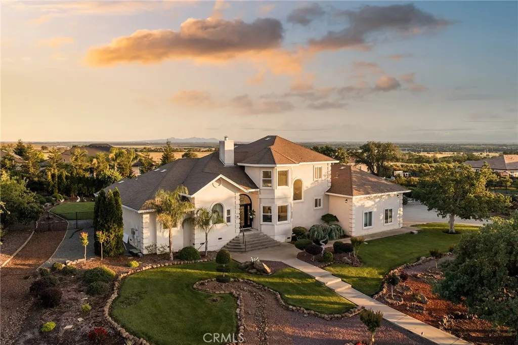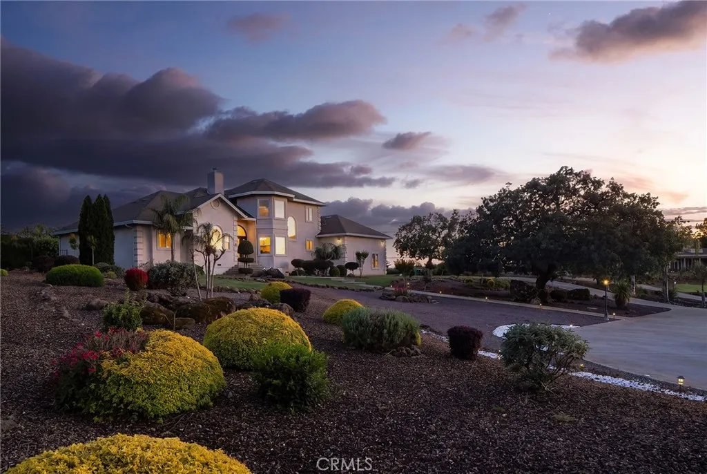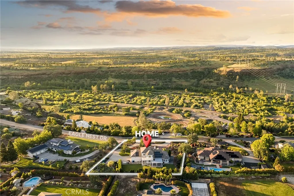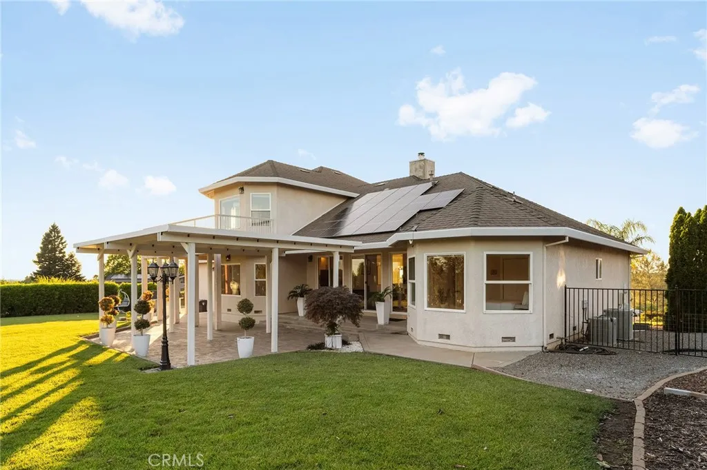 Set within the gated community of Rocky Bluff, this beautifully remodeled luxury home offers truly unmatched views, overlooking Butte Creek Canyon from the front, with stunning sunsets over the canyon. Just minutes from Chico, the property sits on a spacious lot with mature landscaping, fruit trees, raised garden beds, and plenty of room to add a pool, all complemented by a welcoming circular driveway that makes a strong first impression. This 3-bedroom home plus an office offers a functional and desirable layout, with two bedrooms located on the main floor and a private primary suite upstairs. Inside, the home has been thoughtfully updated with a stunning kitchen featuring custom cabinetry, a large island, walk-in pantry, and updated appliances, all opening to the main living spaces designed to capture the views. Soaring ceilings, detailed woodwork, updated flooring, and a sleek electric fireplace create a warm yet elevated feel throughout. The expansive primary suite offers a true retreat with generous space, a spa-like bathroom, and a large walk-in closet, along with a private balcony perfectly positioned to take in the surrounding scenery, with views of the Sutter Buttes. The 900 sqft suite also offers flexibility for a sitting area or workspace if desired. Enjoy seamless indoor-outdoor living with a covered patio ideal for relaxing or entertaining. Additional features include owned solar, automatic blinds, a three-car garage, and a rare second kitchen setup in the garage—perfect for entertaining or extended use.