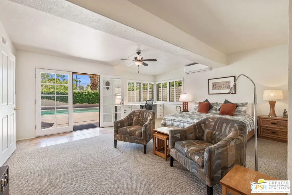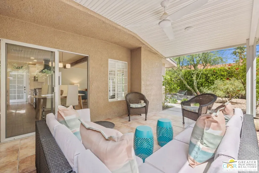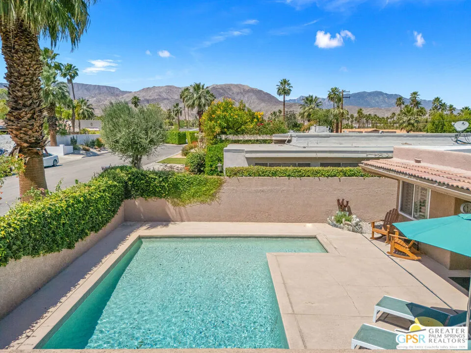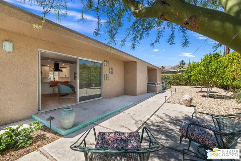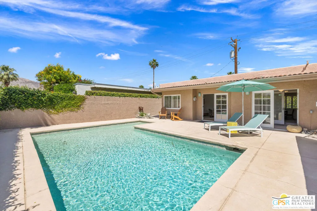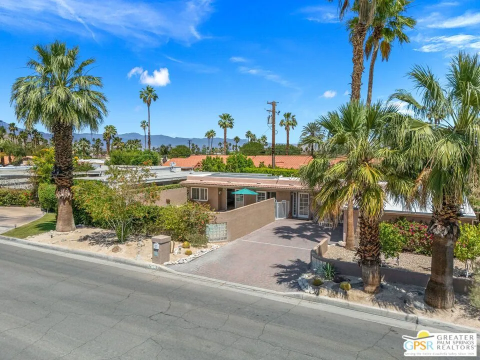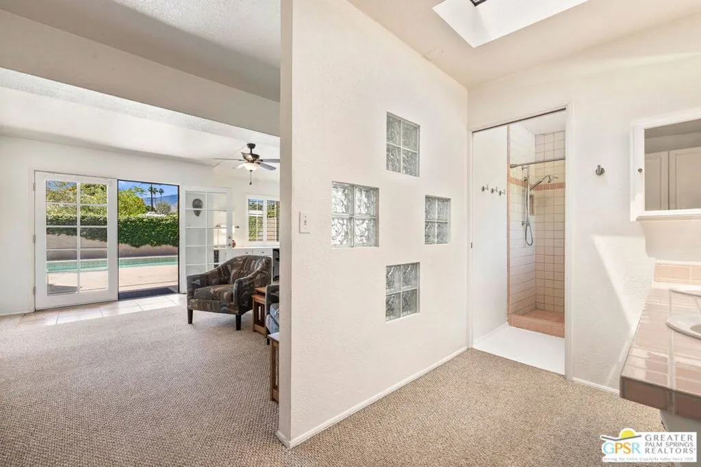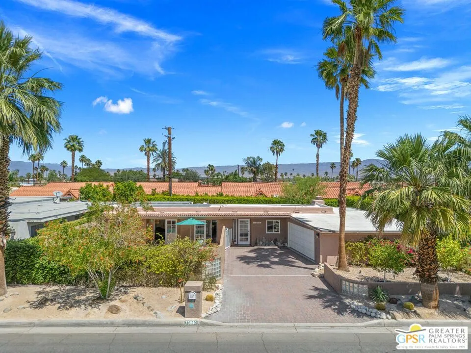 This ultra private South Palm Desert home blends midcentury lines and natural light with an easy indoor outdoor flow, where patios, swaying palms, and the PebbleTec saltwater pool set the scene. Open living and dining areas center around a fireplace and connect to an updated kitchen with stylish finishes, while sliding glass doors extend the space outward for effortless indoor outdoor entertaining. Most every room opens to either a patio or the pool, creating a natural connection to a mix of outdoor conversation areas. Architectural glass block plays beautifully with the natural light, while beamed ceilings and skylights enhance the bright, airy feel. Porcelain flooring runs throughout much of the home. The dining area features a built-in buffet that adds a touch of original character. The primary suite opens to the south-facing pool for all-day sun and views of the Santa Rosa Mountains, with handsome built-ins that include a desk. The guest bedroom features a full bath. A separate den or office opens to the pool through French doors. Skylights in the bathrooms enhance the light-filled feel throughout. The backyard is wrapped in mature vines for exceptional privacy and includes a hot tub on the back patio plus a separate north-side spa for year-round relaxation. Major upgrades include a new roof in 2024 and two OWNED SOLAR systems, one for the home and one for the pool, supporting efficient, low-maintenance living. Fee land, you own it. Offered FURNISHED with a 2 car garage. El Paseo is just down the street!