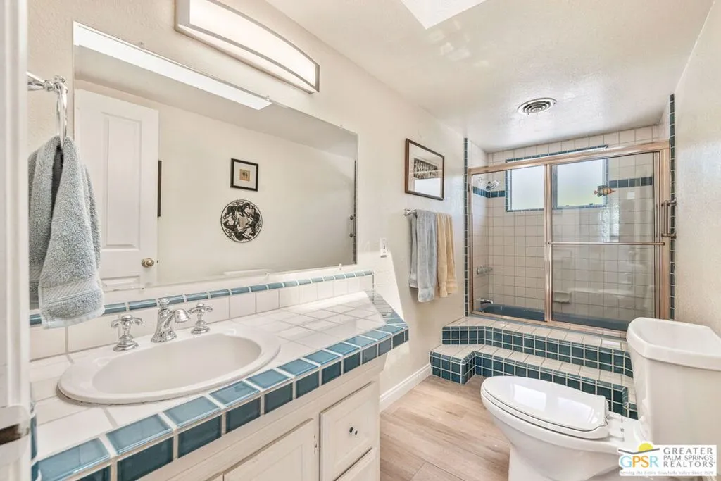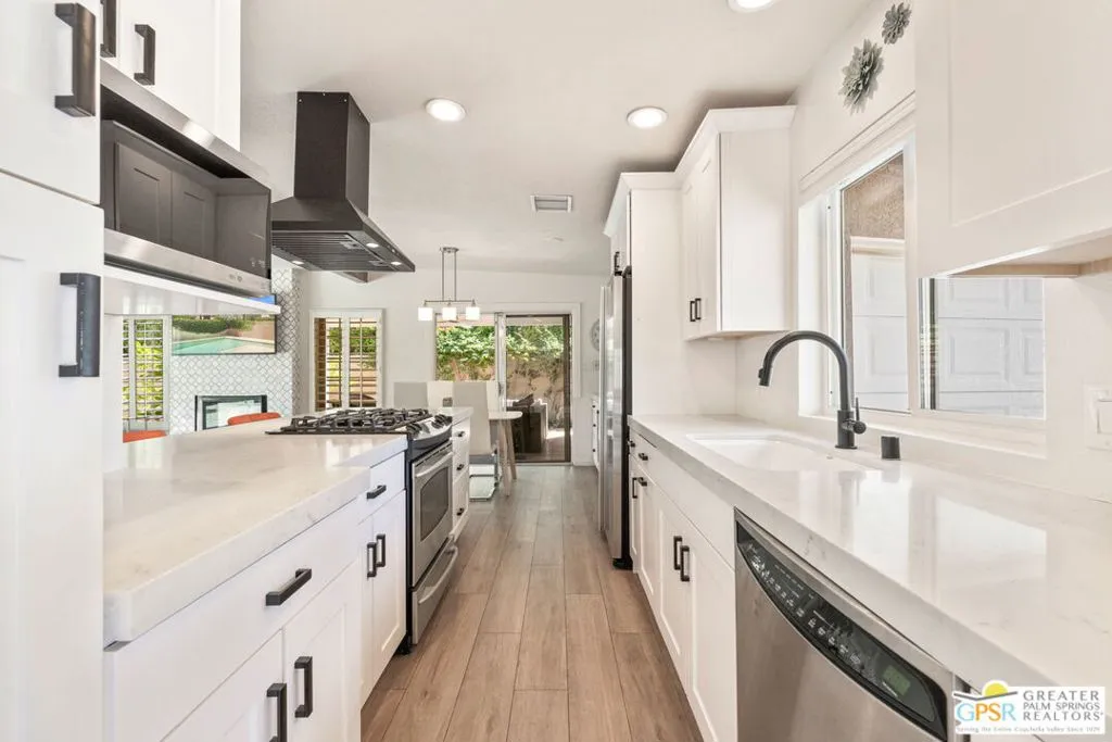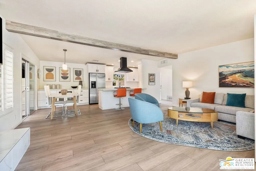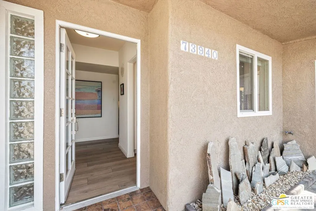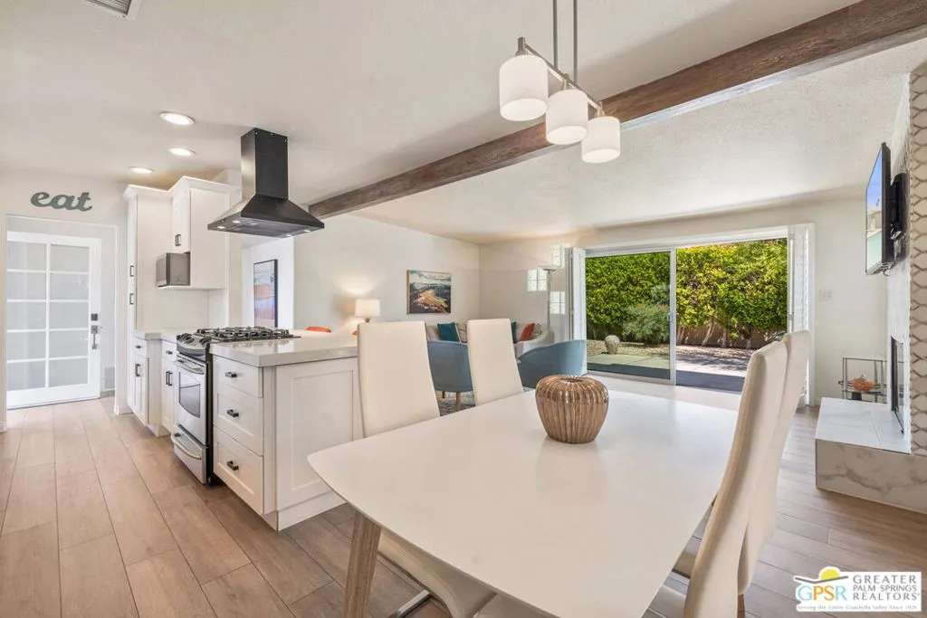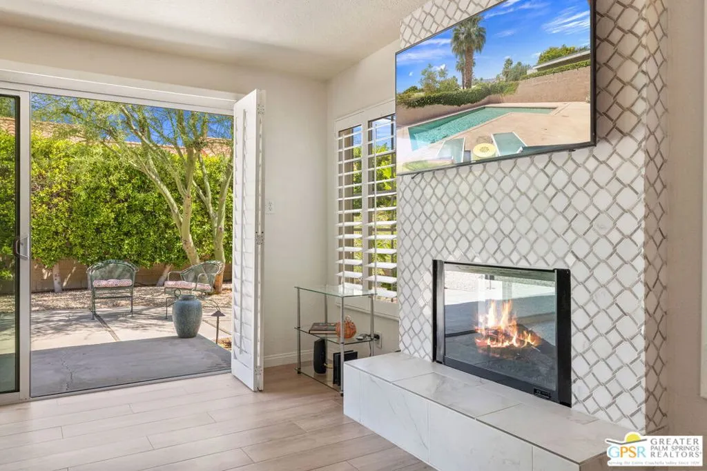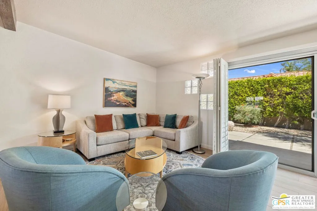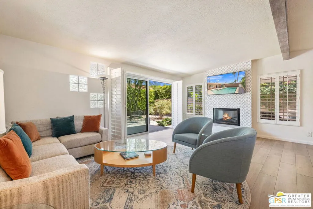 This ultra private South Palm Desert home blends midcentury lines and natural light with an easy indoor outdoor flow, where patios, swaying palms, and the PebbleTec saltwater pool set the scene. Open living and dining areas center around a fireplace and connect to an updated kitchen with stylish finishes, while sliding glass doors extend the space outward for effortless indoor outdoor entertaining. Most every room opens to either a patio or the pool, creating a natural connection to a mix of outdoor conversation areas. Architectural glass block plays beautifully with the natural light, while beamed ceilings and skylights enhance the bright, airy feel. Porcelain flooring runs throughout much of the home. The dining area features a built-in buffet that adds a touch of original character. The primary suite opens to the south-facing pool for all-day sun and views of the Santa Rosa Mountains, with handsome built-ins that include a desk. The guest bedroom features a full bath. A separate den or office opens to the pool through French doors. Skylights in the bathrooms enhance the light-filled feel throughout. The backyard is wrapped in mature vines for exceptional privacy and includes a hot tub on the back patio plus a separate north-side spa for year-round relaxation. Major upgrades include a new roof in 2024 and two OWNED SOLAR systems, one for the home and one for the pool, supporting efficient, low-maintenance living. Fee land, you own it. Offered FURNISHED with a 2 car garage. El Paseo is just down the street!
