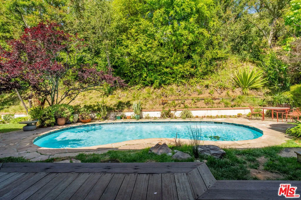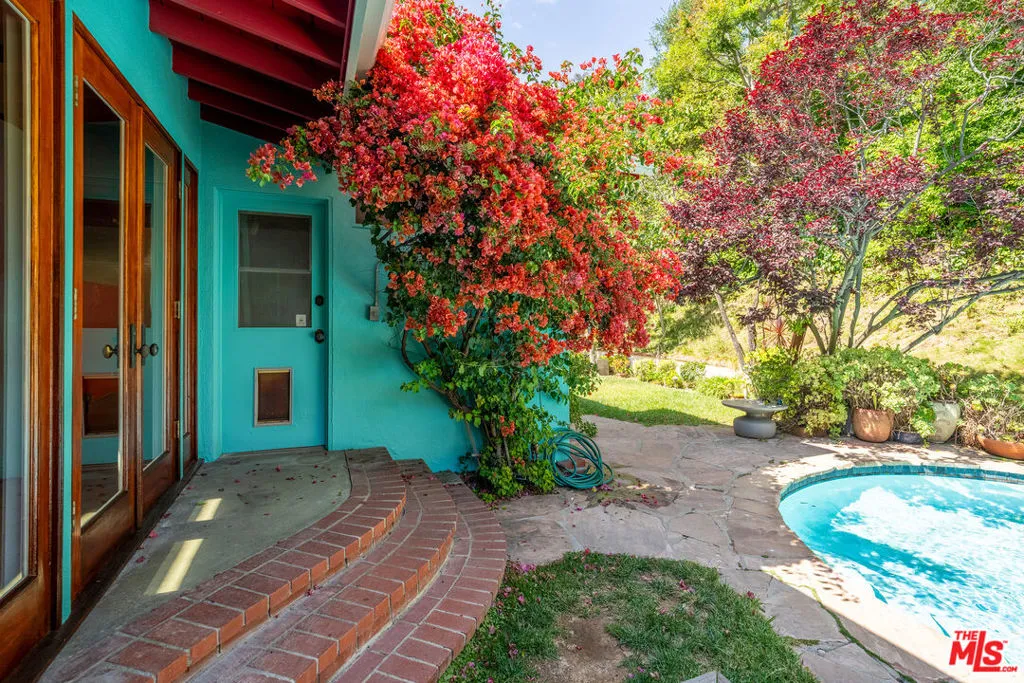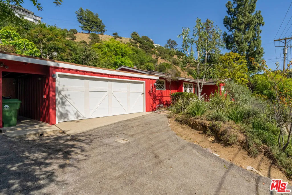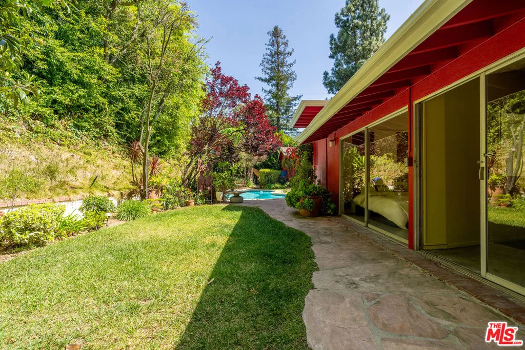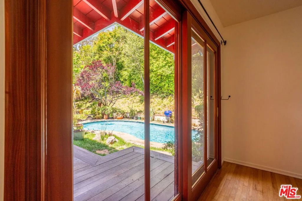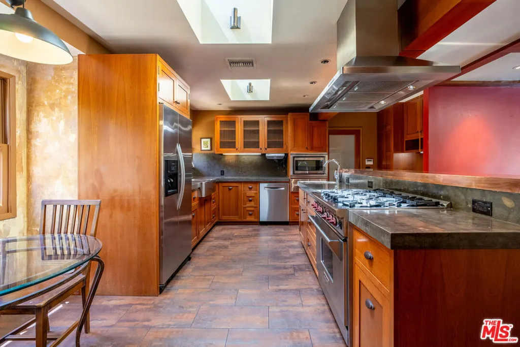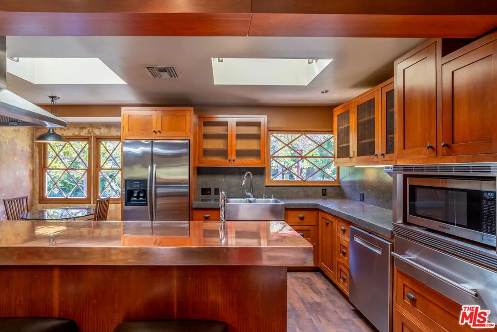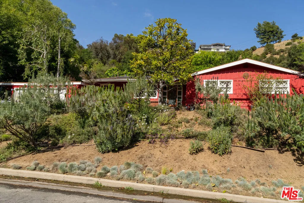 Tucked off Mulholland in the heart of Laurel Canyon, the Red Barn House is a three-bedroom, three-bath canyon retreat that feels like a world apart - freshly repainted inside and out, full of character, and set on a lush 9,303 sq ft lot in the coveted Wonderland School District. Soaring skylights flood the 2,341 sq ft interior with natural light, and the warm finishes throughout are exactly what you'd want in a canyon house. In the kitchen, honed limestone countertops give way to a copper bar top - rich, tactile, and full of character that only deepens over time. The pool and surrounding patio receive sun throughout the day, creating a private outdoor sanctuary built for year-round al fresco living. The attached studio is perfect for a music room, home office, guest suite, playroom, or creative den. Partially furnished and move-in ready, with room to make it your own. Minutes from the Sunset Strip, but feels like your own little world.