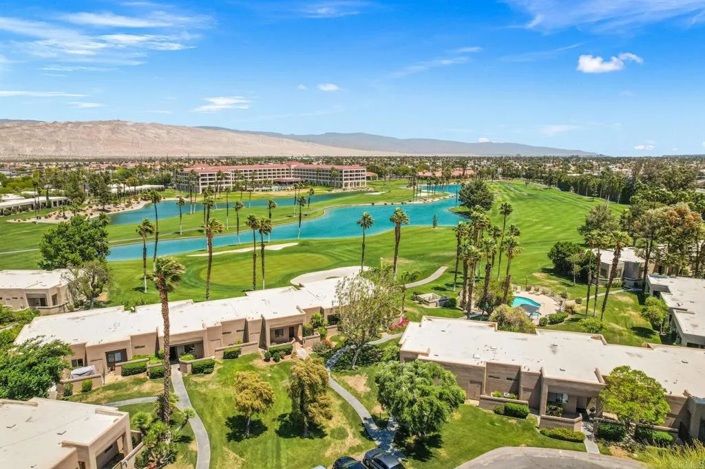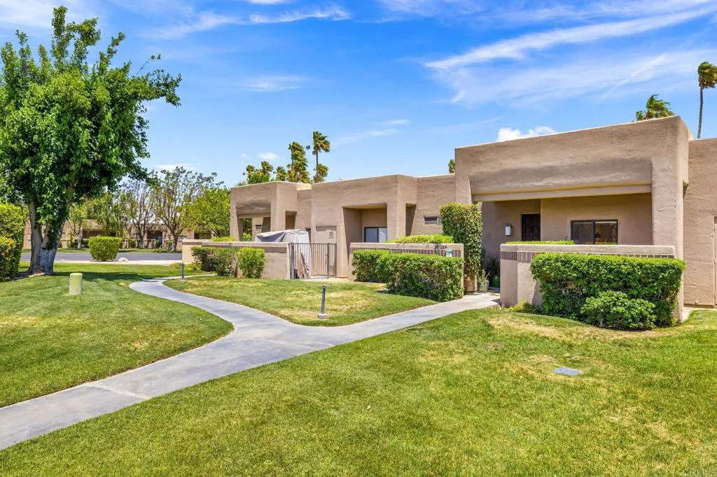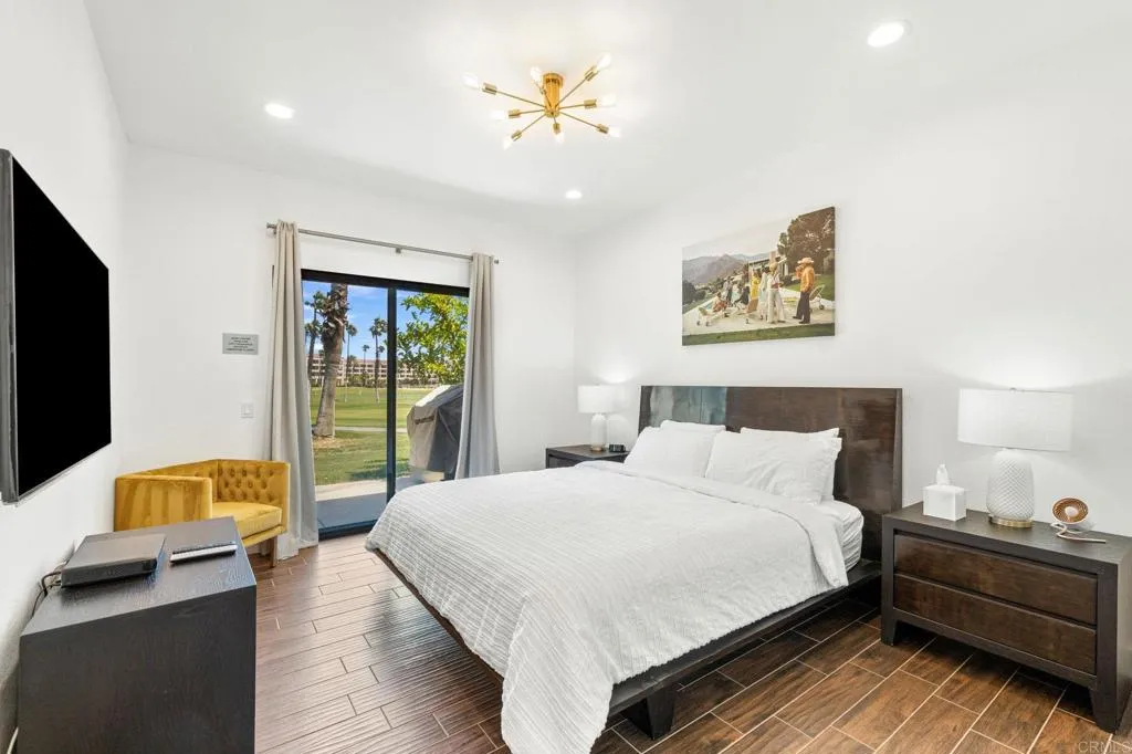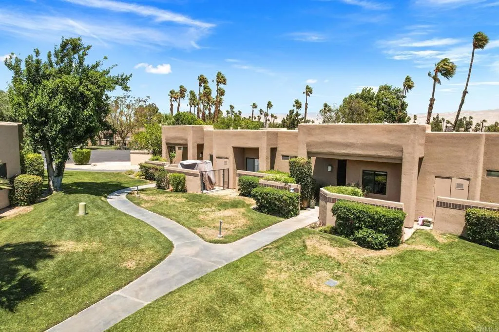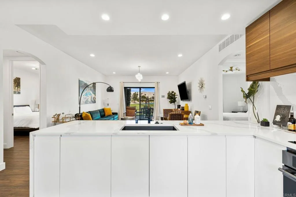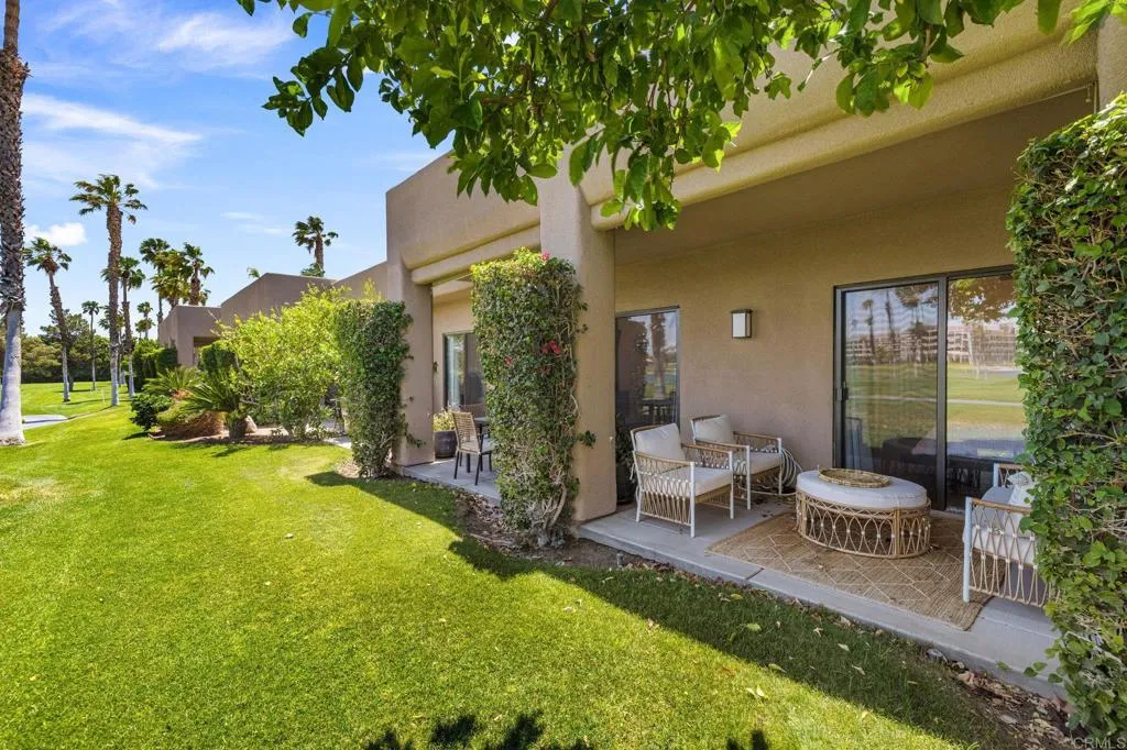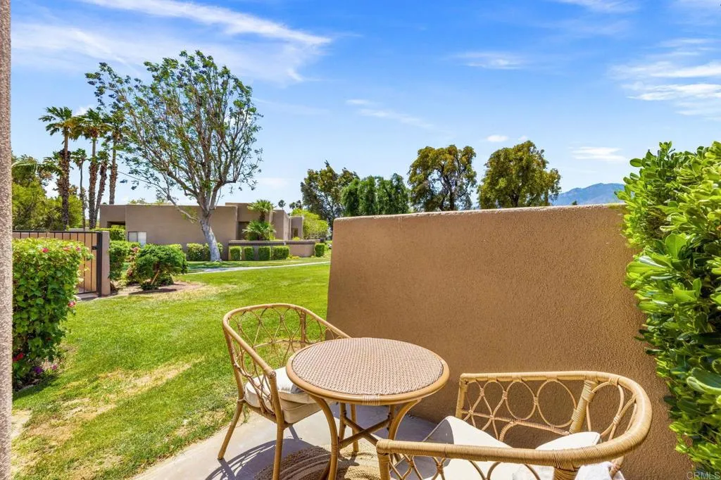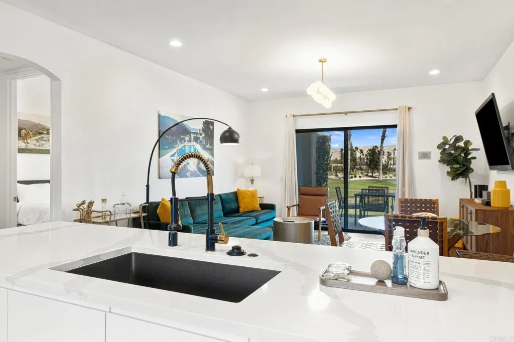 Welcome to a fully reimagined desert retreat that feels like a true Palm Springs design experience, where sophisticated mid-century modern style meets resort living. Inspired by the iconic glamour of Slim Aarons, curated canvas prints from his famed Poolside Gossip collection are showcased throughout the home, creating a playful nod to classic Palm Springs luxury. Unlike anything else currently available within Desert Princess Country Club, this fully remodeled residence has been thoughtfully redesigned with intentional details at every turn and is being offered fully furnished, creating a truly turnkey opportunity. The stunning kitchen serves as the centerpiece of the home, featuring walnut-style cabinetry, dramatic quartz countertops with a full slab backsplash and oversized waterfall, bar seating, matte black fixtures, pot filler, upgraded electrical, enhanced ventilation, recessed lighting, and premium appliances including a GE Café Series Refrigerator. The open-concept living space was designed with rich wood-look tile flooring, curated mid-century modern inspired furnishings, statement lighting, layered textures, and designer details that create warmth and sophistication. The bedroom suites feature Restoration Hardware furnishings paired with king-sized beds and luxury Hotel Collection mattresses for a true resort-style stay. The spa-inspired bathrooms have been completely transformed with oversized walk-in showers wrapped in striking designer Chloe tile, glass enclosures, dual vanities, elevated mirrors and brass fixtures that feel straight out of a boutique hotel. Each bedroom also features a walk in closet for extra storage. Additional upgrades include a WaterBoy Whole House Water Filtration System, new hot water heater, new Honeywell Thermostat, AC, keyless entry, new garage door and opener with key pad entry, upgraded garage electrical, full-size washer/dryer. Perfectly positioned on the 1st green of the Lagos course, the home enjoys sweeping golf course, lake, and resort views with mountain vistas beyond. The outdoor space is equally impressive with a new concrete slab, dining table and lounge seating collection as well as a premium Brinkmann Elite BBQ. The sale also includes a 2-seater golf cart and four bicycles, allowing owners and guests to fully enjoy the incredible amenities of Desert Princess Country Club including: 27 holes of golf, 34 pools and spas, Tennis & pickleball courts, Fitness center, Bocce ball courts, spa, Clubhouse restaurant & bar, Pro shop, 24-hour guard-gated security and patrol. Located just minutes from Palm Springs International Airport and the shopping, dining, and entertainment of downtown Palm Springs, this condo offers both convenience and escape. Land lease extended through 2069 and has been a successful short-term and seasonal rental make this an exceptional lifestyle and investment opportunity. This isn’t simply a condo, it’s a fully curated Palm Springs lifestyle.