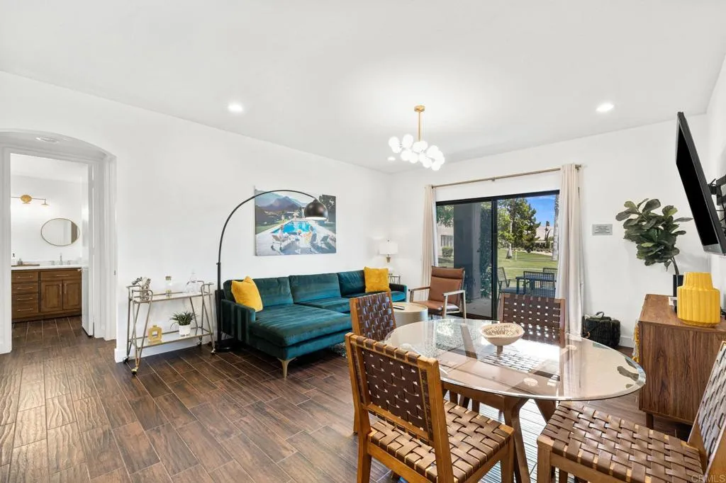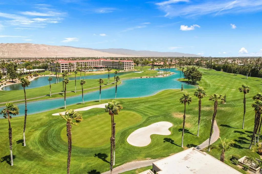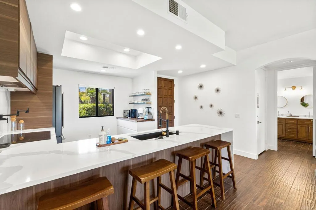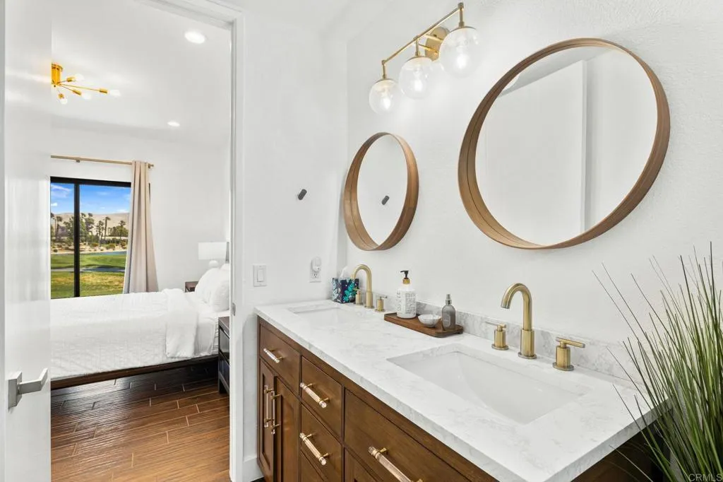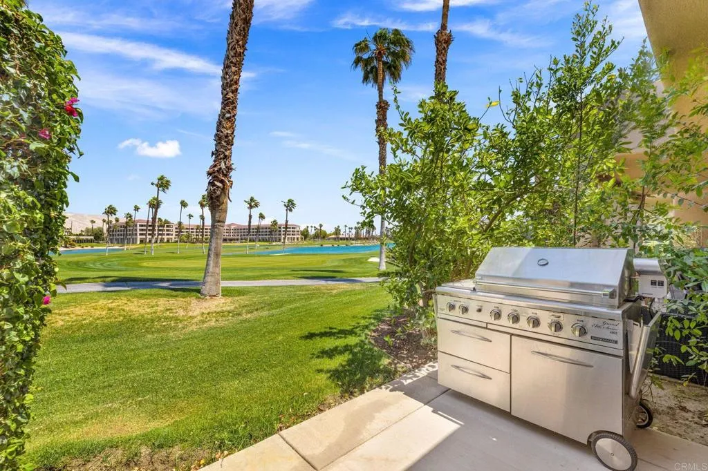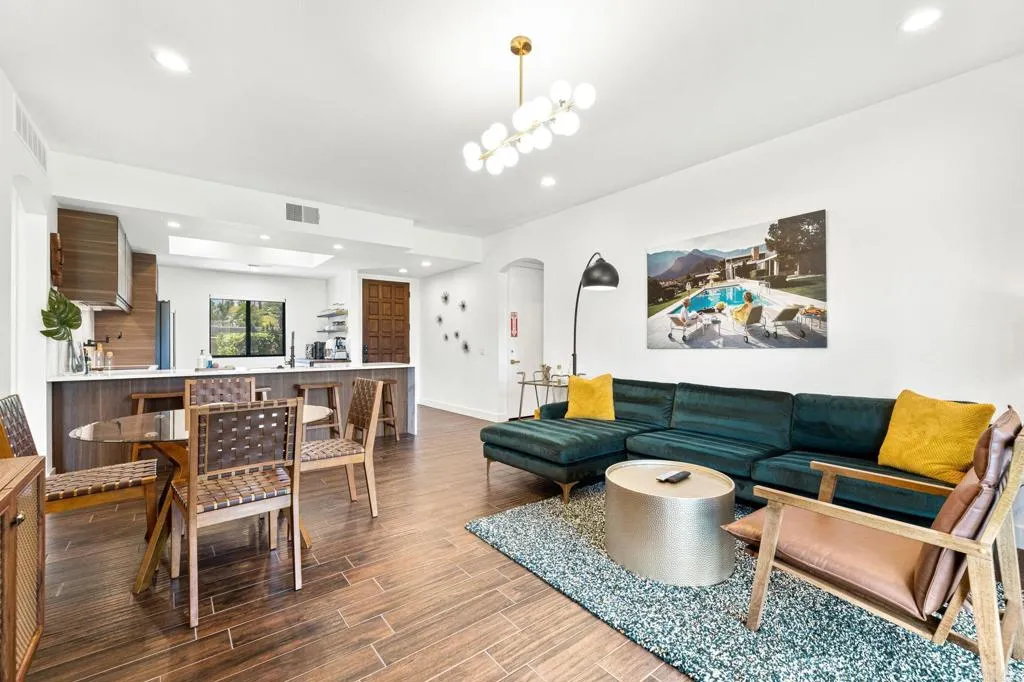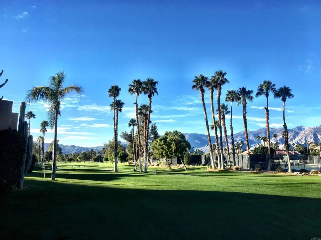 Welcome to a fully reimagined desert retreat that feels like a true Palm Springs design experience, where sophisticated mid-century modern style meets resort living. Inspired by the iconic glamour of Slim Aarons, curated canvas prints from his famed Poolside Gossip collection are showcased throughout the home, creating a playful nod to classic Palm Springs luxury. Unlike anything else currently available within Desert Princess Country Club, this fully remodeled residence has been thoughtfully redesigned with intentional details at every turn and is being offered fully furnished, creating a truly turnkey opportunity. The stunning kitchen serves as the centerpiece of the home, featuring walnut-style cabinetry, dramatic quartz countertops with a full slab backsplash and oversized waterfall, bar seating, matte black fixtures, pot filler, upgraded electrical, enhanced ventilation, recessed lighting, and premium appliances including a GE Café Series Refrigerator. The open-concept living space was designed with rich wood-look tile flooring, curated mid-century modern inspired furnishings, statement lighting, layered textures, and designer details that create warmth and sophistication. The bedroom suites feature Restoration Hardware furnishings paired with king-sized beds and luxury Hotel Collection mattresses for a true resort-style stay. The spa-inspired bathrooms have been completely transformed with oversized walk-in showers wrapped in striking designer Chloe tile, glass enclosures, dual vanities, elevated mirrors and brass fixtures that feel straight out of a boutique hotel. Each bedroom also features a walk in closet for extra storage. Additional upgrades include a WaterBoy Whole House Water Filtration System, new hot water heater, new Honeywell Thermostat, AC, keyless entry, new garage door and opener with key pad entry, upgraded garage electrical, full-size washer/dryer. Perfectly positioned on the 1st green of the Lagos course, the home enjoys sweeping golf course, lake, and resort views with mountain vistas beyond. The outdoor space is equally impressive with a new concrete slab, dining table and lounge seating collection as well as a premium Brinkmann Elite BBQ. The sale also includes a 2-seater golf cart and four bicycles, allowing owners and guests to fully enjoy the incredible amenities of Desert Princess Country Club including: 27 holes of golf, 34 pools and spas, Tennis & pickleball courts, Fitness center, Bocce ball courts, spa, Clubhouse restaurant & bar, Pro shop, 24-hour guard-gated security and patrol. Located just minutes from Palm Springs International Airport and the shopping, dining, and entertainment of downtown Palm Springs, this condo offers both convenience and escape. Land lease extended through 2069 and has been a successful short-term and seasonal rental make this an exceptional lifestyle and investment opportunity. This isn’t simply a condo, it’s a fully curated Palm Springs lifestyle.