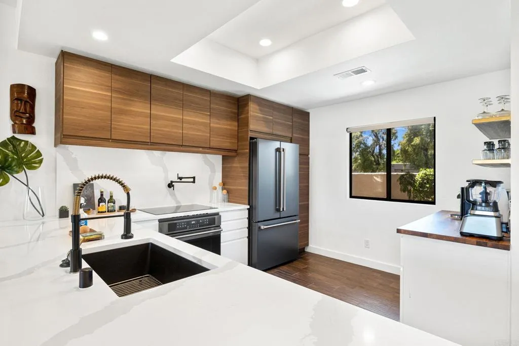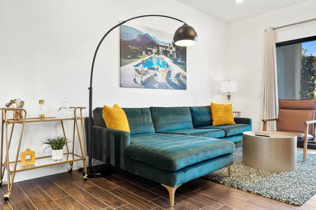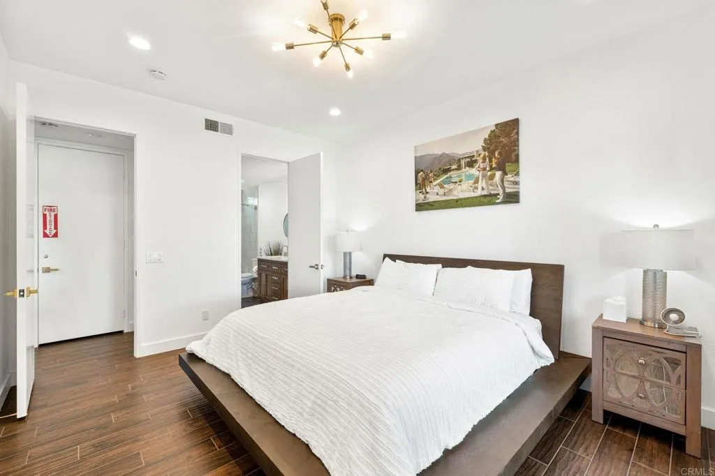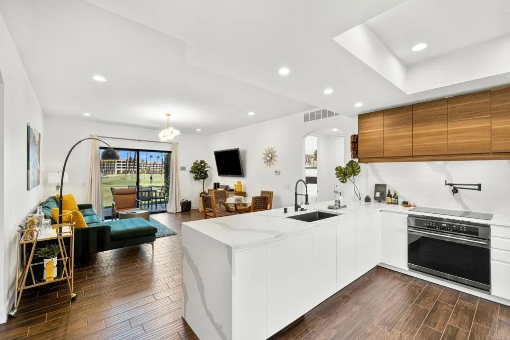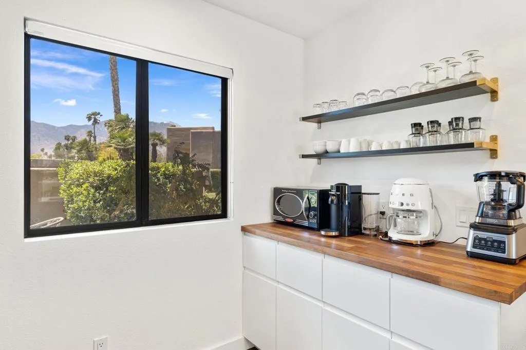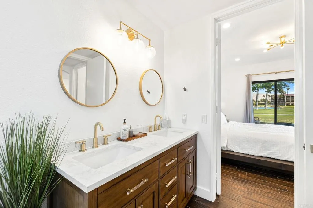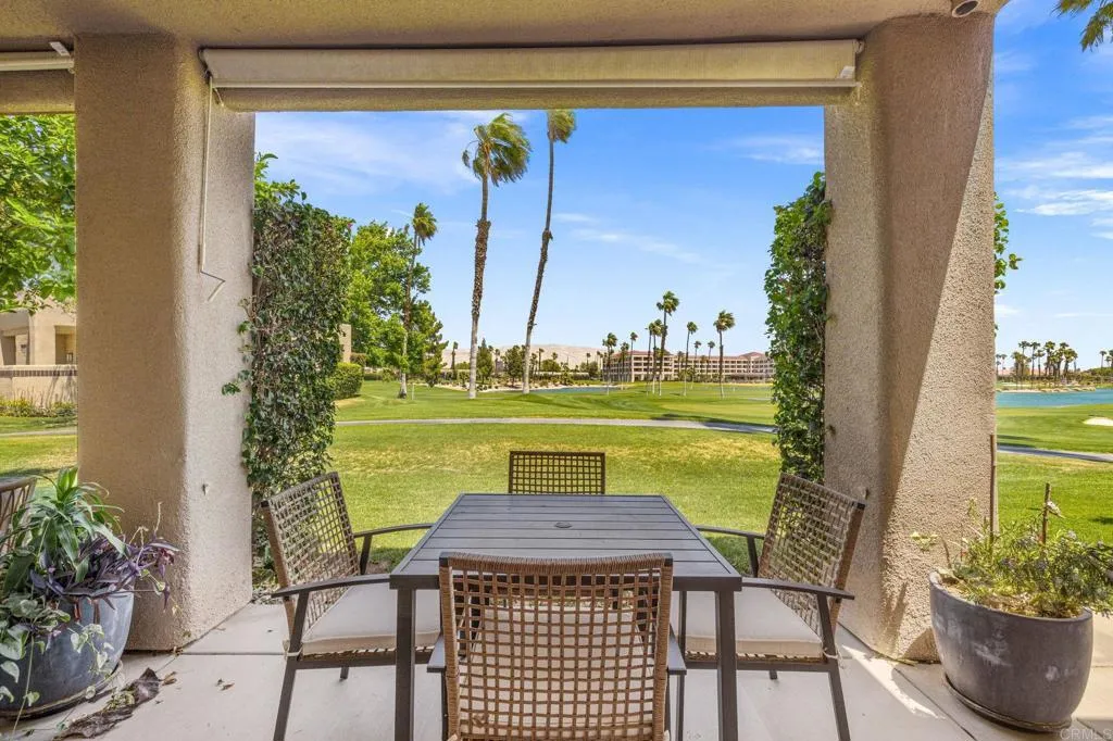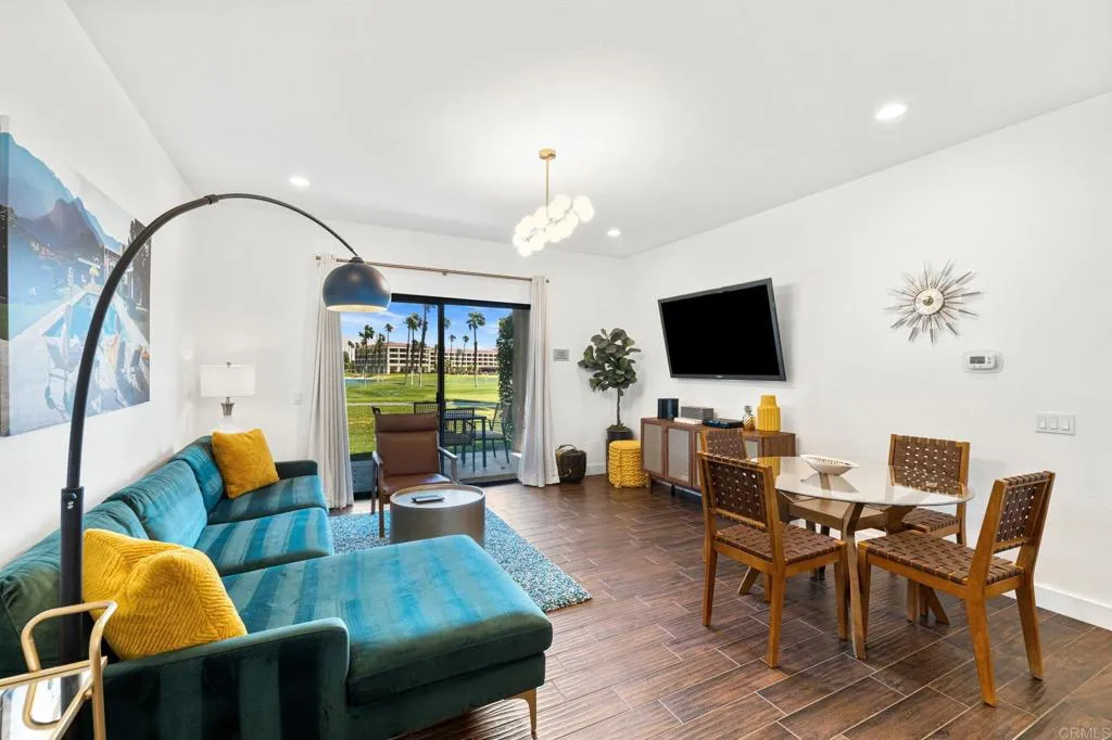 Welcome to a fully reimagined desert retreat that feels like a true Palm Springs design experience, where sophisticated mid-century modern style meets resort living. Inspired by the iconic glamour of Slim Aarons, curated canvas prints from his famed Poolside Gossip collection are showcased throughout the home, creating a playful nod to classic Palm Springs luxury. Unlike anything else currently available within Desert Princess Country Club, this fully remodeled residence has been thoughtfully redesigned with intentional details at every turn and is being offered fully furnished, creating a truly turnkey opportunity. The stunning kitchen serves as the centerpiece of the home, featuring walnut-style cabinetry, dramatic quartz countertops with a full slab backsplash and oversized waterfall, bar seating, matte black fixtures, pot filler, upgraded electrical, enhanced ventilation, recessed lighting, and premium appliances including a GE Café Series Refrigerator. The open-concept living space was designed with rich wood-look tile flooring, curated mid-century modern inspired furnishings, statement lighting, layered textures, and designer details that create warmth and sophistication. The bedroom suites feature Restoration Hardware furnishings paired with king-sized beds and luxury Hotel Collection mattresses for a true resort-style stay. The spa-inspired bathrooms have been completely transformed with oversized walk-in showers wrapped in striking designer Chloe tile, glass enclosures, dual vanities, elevated mirrors and brass fixtures that feel straight out of a boutique hotel. Each bedroom also features a walk in closet for extra storage. Additional upgrades include a WaterBoy Whole House Water Filtration System, new hot water heater, new Honeywell Thermostat, AC, keyless entry, new garage door and opener with key pad entry, upgraded garage electrical, full-size washer/dryer. Perfectly positioned on the 1st green of the Lagos course, the home enjoys sweeping golf course, lake, and resort views with mountain vistas beyond. The outdoor space is equally impressive with a new concrete slab, dining table and lounge seating collection as well as a premium Brinkmann Elite BBQ. The sale also includes a 2-seater golf cart and four bicycles, allowing owners and guests to fully enjoy the incredible amenities of Desert Princess Country Club including: 27 holes of golf, 34 pools and spas, Tennis & pickleball courts, Fitness center, Bocce ball courts, spa, Clubhouse restaurant & bar, Pro shop, 24-hour guard-gated security and patrol. Located just minutes from Palm Springs International Airport and the shopping, dining, and entertainment of downtown Palm Springs, this condo offers both convenience and escape. Land lease extended through 2069 and has been a successful short-term and seasonal rental make this an exceptional lifestyle and investment opportunity. This isn’t simply a condo, it’s a fully curated Palm Springs lifestyle.