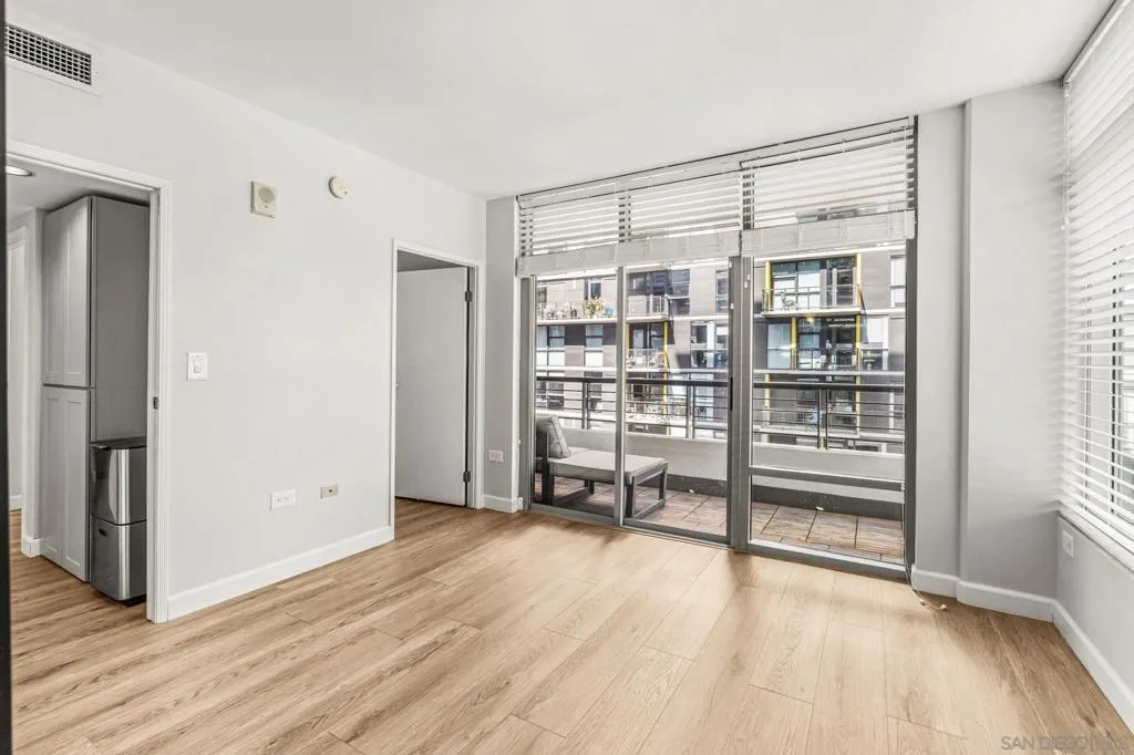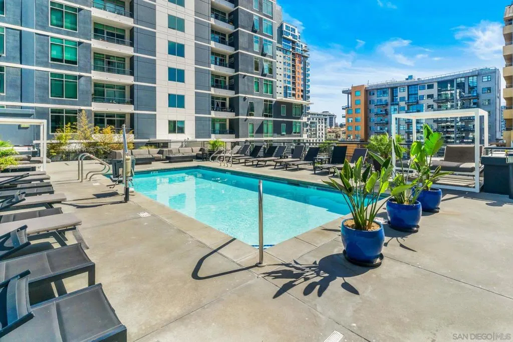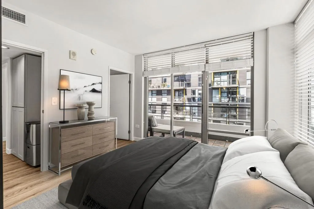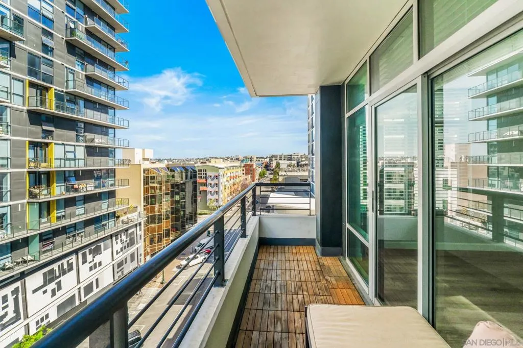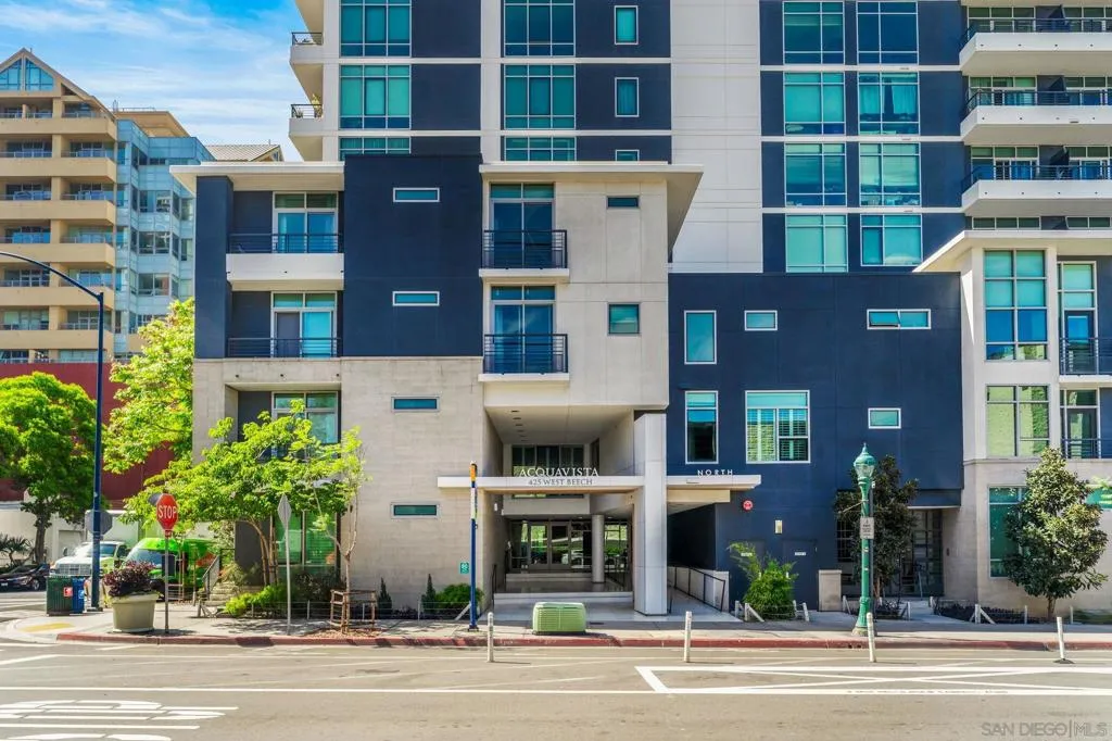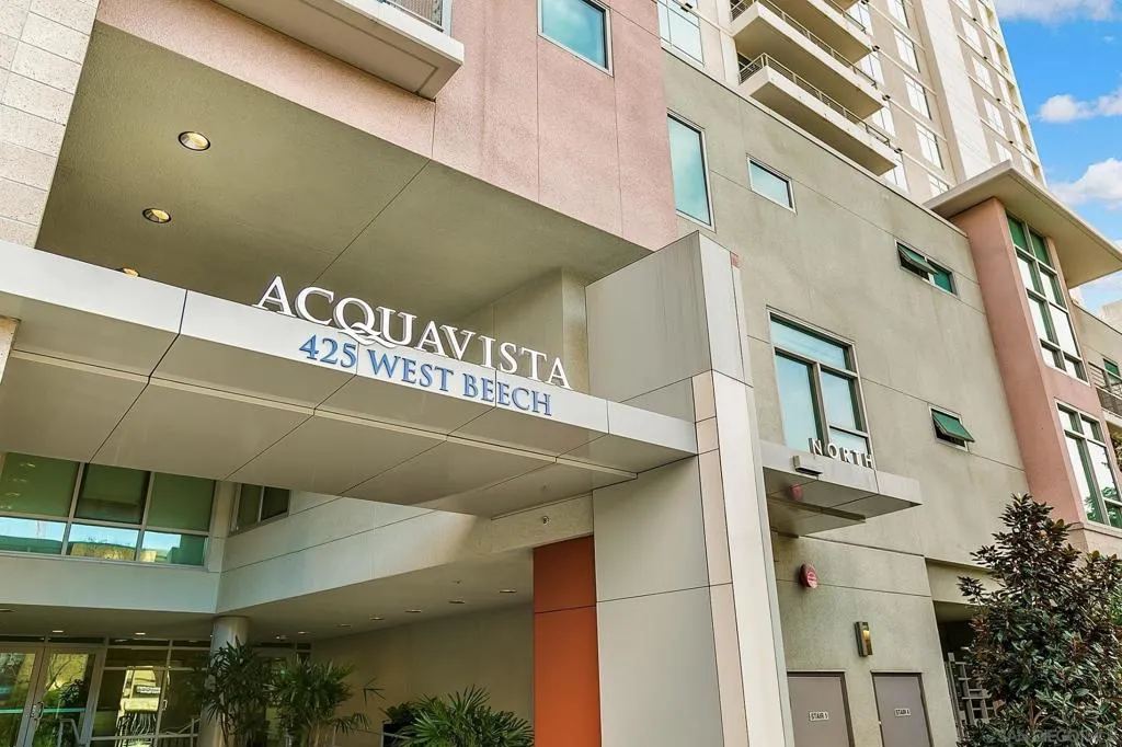 Experience elevated urban living in this beautifully updated 2-bedroom, 2-bath corner residence located on the 8th floor of Acqua Vista, a premier high-rise in the heart of Little Italy—just blocks from San Diego Bay. Perfectly positioned on the same level as the pool, hot tub and BBQ’s, this move-in ready condo offers both convenience and style. Freshly painted throughout, the home features a custom built-in pantry, and new washer and dryer. Thoughtful upgrades continue with thick custom wood blinds, keypad entry, and a new AC system for year-round comfort. Large windows in both bedrooms flood the space with natural light, while the spacious living area creates an inviting open-concept layout. The primary bedroom includes direct access to a private balcony, enhanced with finished wood decking—perfect for relaxing above the city. Acqua Vista residents enjoy resort-style amenities including a fully equipped fitness center, a stunning 8th-floor pool and spa, BBQ area, and outdoor dining space. A 24-hour attended lobby provides security and package handling, while valet parking ensures ease and protection for your vehicle. With trolley and freeway access just blocks away, this Class A building offers the ultimate in luxury, location, and convenience. Don’t let this opportunity pass you by!