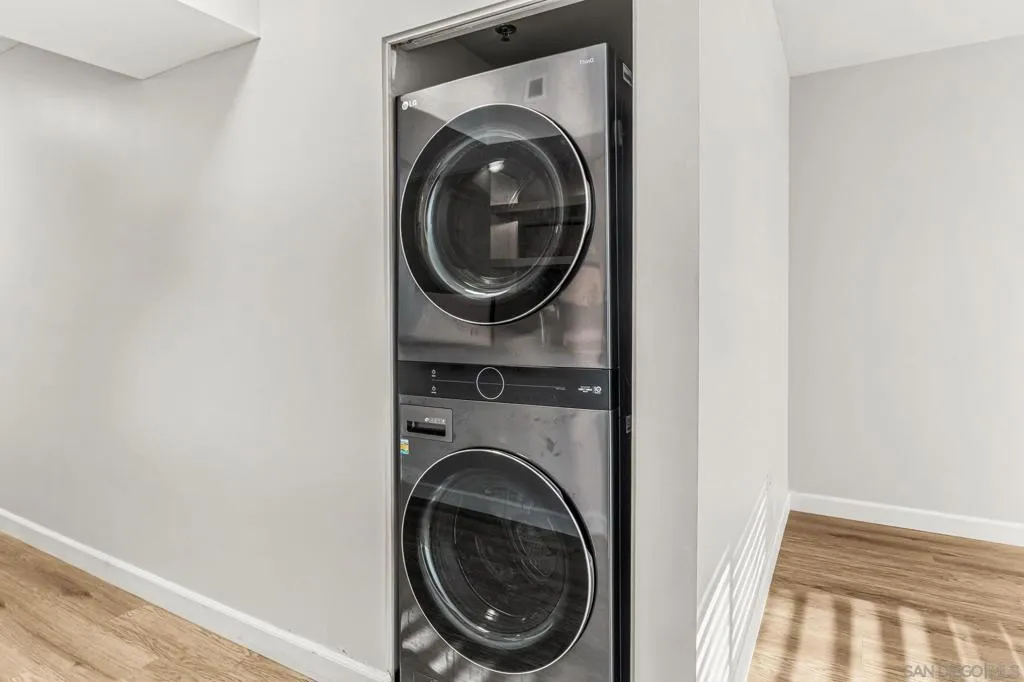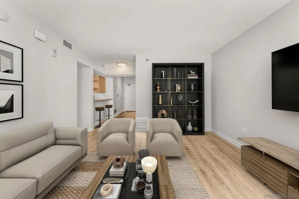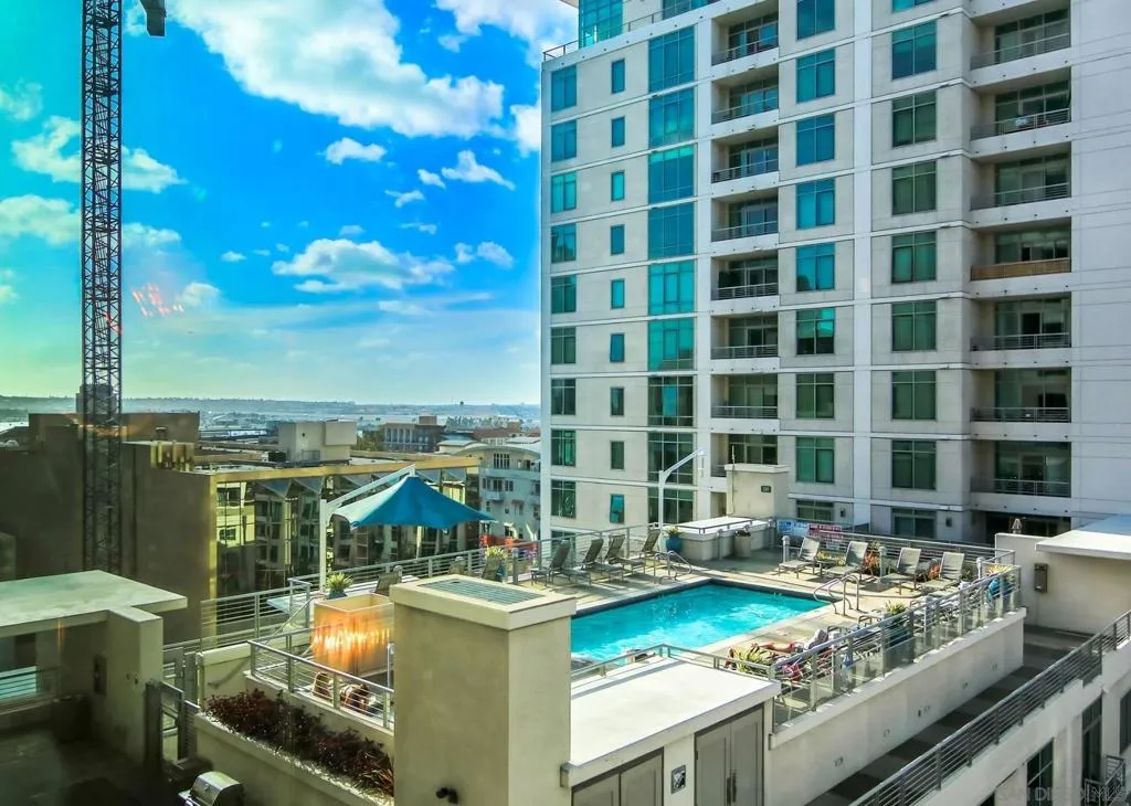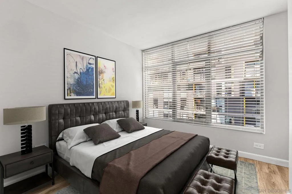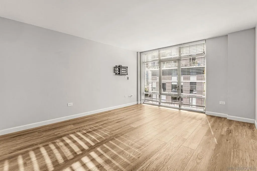 Experience elevated urban living in this beautifully updated 2-bedroom, 2-bath corner residence located on the 8th floor of Acqua Vista, a premier high-rise in the heart of Little Italy—just blocks from San Diego Bay. Perfectly positioned on the same level as the pool, hot tub and BBQ’s, this move-in ready condo offers both convenience and style. Freshly painted throughout, the home features a custom built-in pantry, and new washer and dryer. Thoughtful upgrades continue with thick custom wood blinds, keypad entry, and a new AC system for year-round comfort. Large windows in both bedrooms flood the space with natural light, while the spacious living area creates an inviting open-concept layout. The primary bedroom includes direct access to a private balcony, enhanced with finished wood decking—perfect for relaxing above the city. Acqua Vista residents enjoy resort-style amenities including a fully equipped fitness center, a stunning 8th-floor pool and spa, BBQ area, and outdoor dining space. A 24-hour attended lobby provides security and package handling, while valet parking ensures ease and protection for your vehicle. With trolley and freeway access just blocks away, this Class A building offers the ultimate in luxury, location, and convenience. Don’t let this opportunity pass you by!