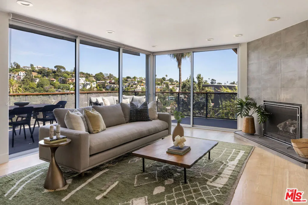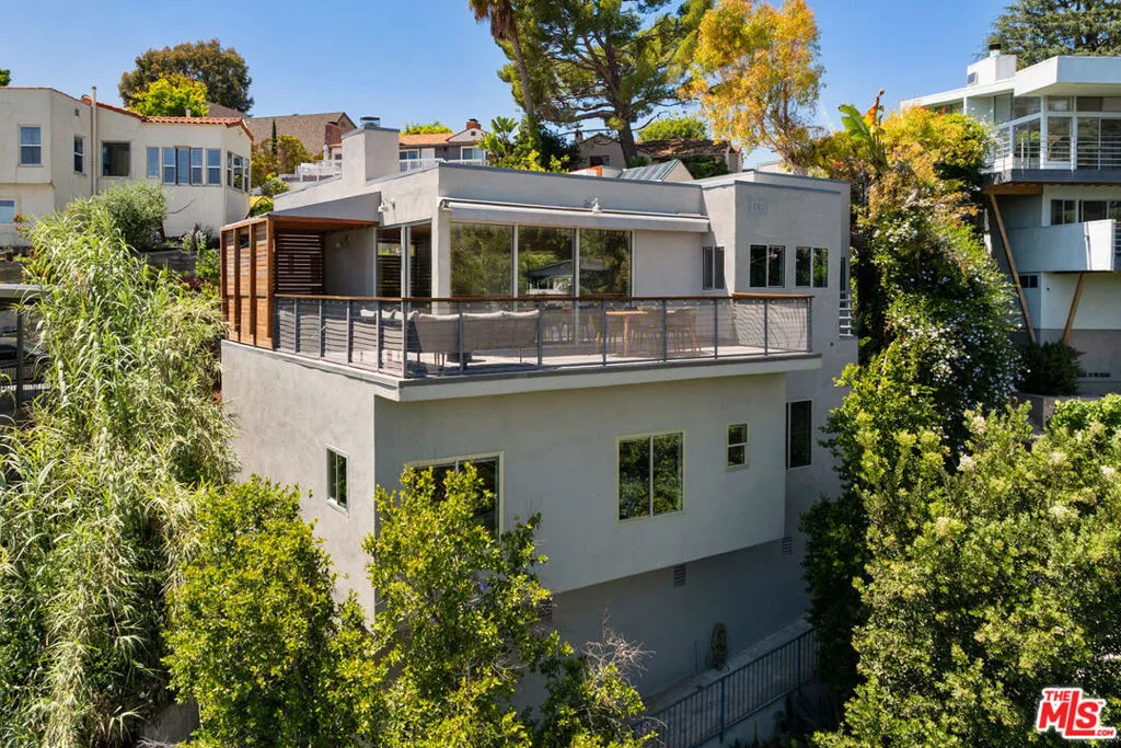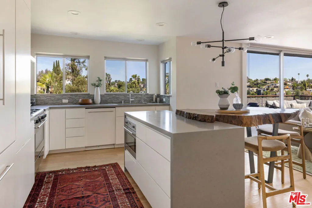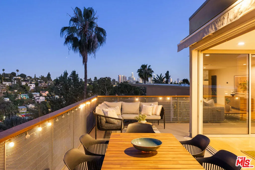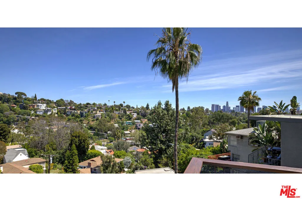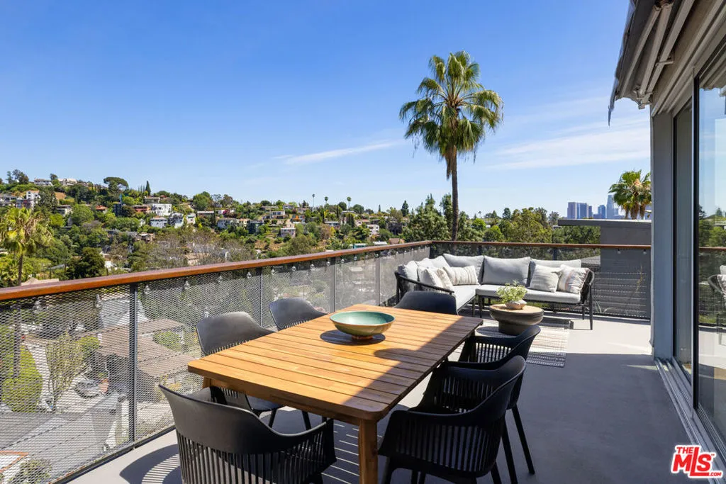 In Silver Lake, this updated Modern is pure 90s minimalism, impressive in scale and showcasing incredible views. The expansive layout provides several spaces to live and gather, including a living room with a slate fireplace and powder room, and formal dining; abundant windows bring in views of lush greenery. The sunny kitchen features a double pantry, built-in appliances, and a custom wood breakfast bar. An adjacent den feels like a sunroom with walls of glass, extending to a wraparound balcony with a pergola and sweeping views of the Silver Lake hills and sparkling city lights. All four bedrooms are en-suite; the generous primary includes a dedicated lounge space, custom walk-in closet, and a bathroom with a separate shower and soaking tub. Amenities include a two-car attached garage, dual zone central HVAC, and laundry. Well-situated in the Micheltorena Elementary School District, you are mere moments from the Silver Lake Reservoir and Meadow, Sunset Junction, and dining and shopping on Silver Lake Boulevard.