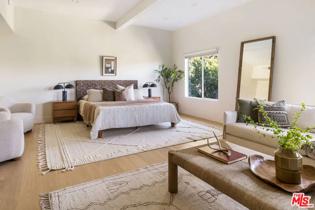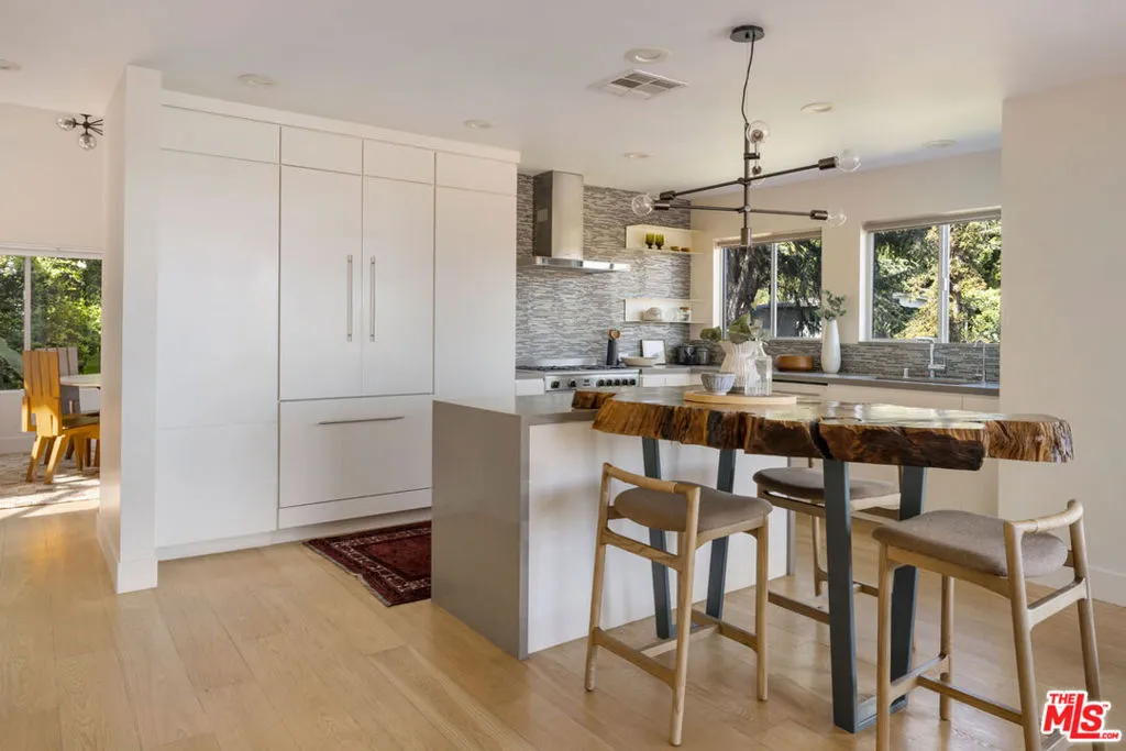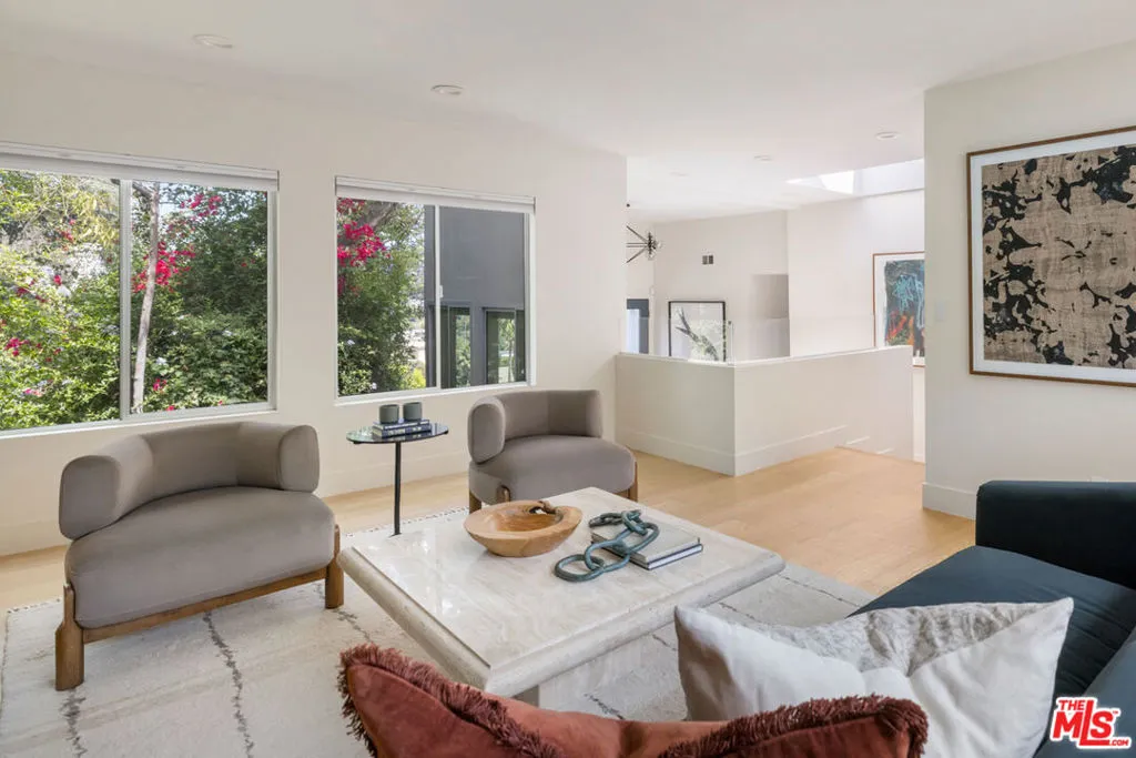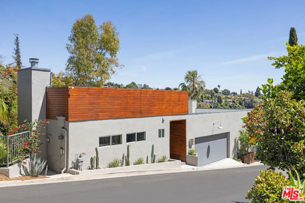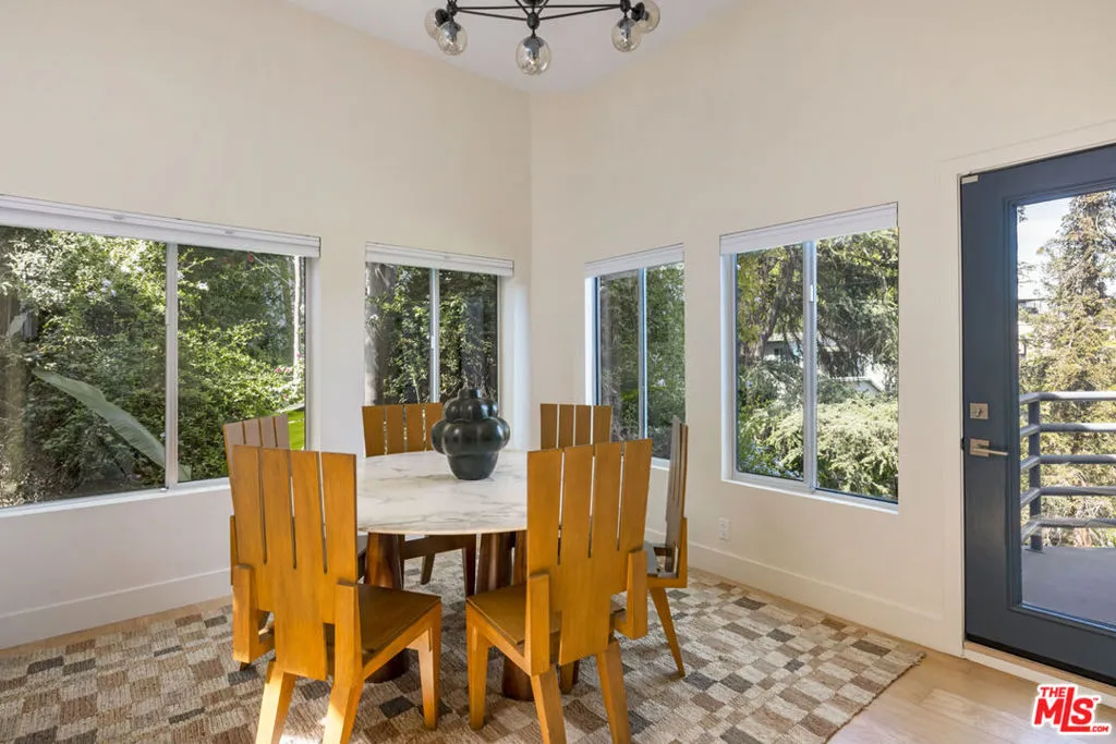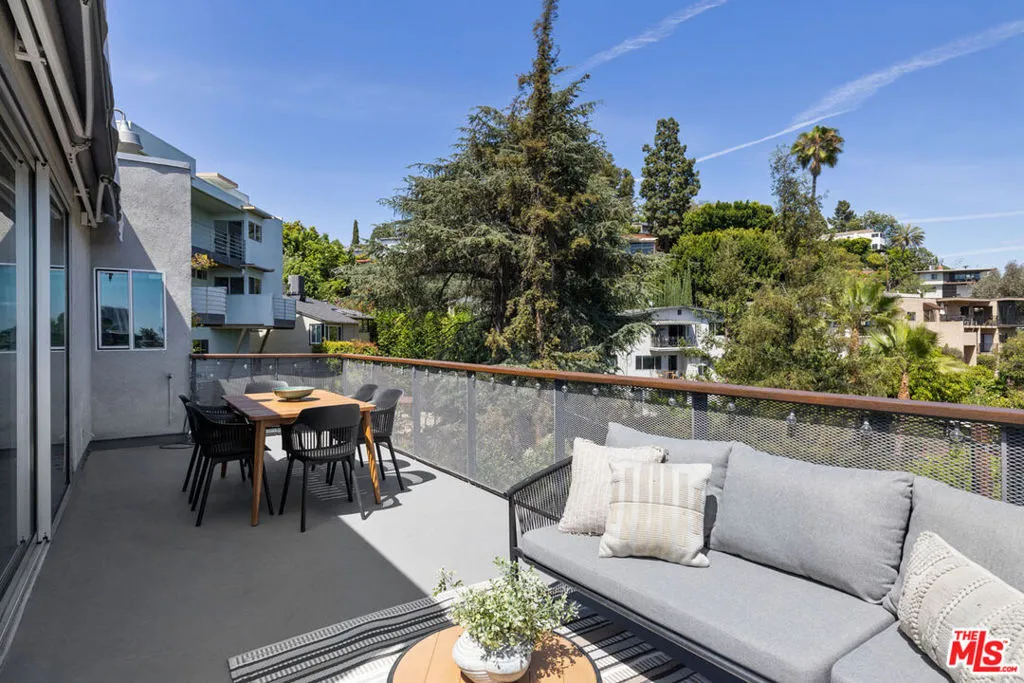 In Silver Lake, this updated Modern is pure 90s minimalism, impressive in scale and showcasing incredible views. The expansive layout provides several spaces to live and gather, including a living room with a slate fireplace and powder room, and formal dining; abundant windows bring in views of lush greenery. The sunny kitchen features a double pantry, built-in appliances, and a custom wood breakfast bar. An adjacent den feels like a sunroom with walls of glass, extending to a wraparound balcony with a pergola and sweeping views of the Silver Lake hills and sparkling city lights. All four bedrooms are en-suite; the generous primary includes a dedicated lounge space, custom walk-in closet, and a bathroom with a separate shower and soaking tub. Amenities include a two-car attached garage, dual zone central HVAC, and laundry. Well-situated in the Micheltorena Elementary School District, you are mere moments from the Silver Lake Reservoir and Meadow, Sunset Junction, and dining and shopping on Silver Lake Boulevard.