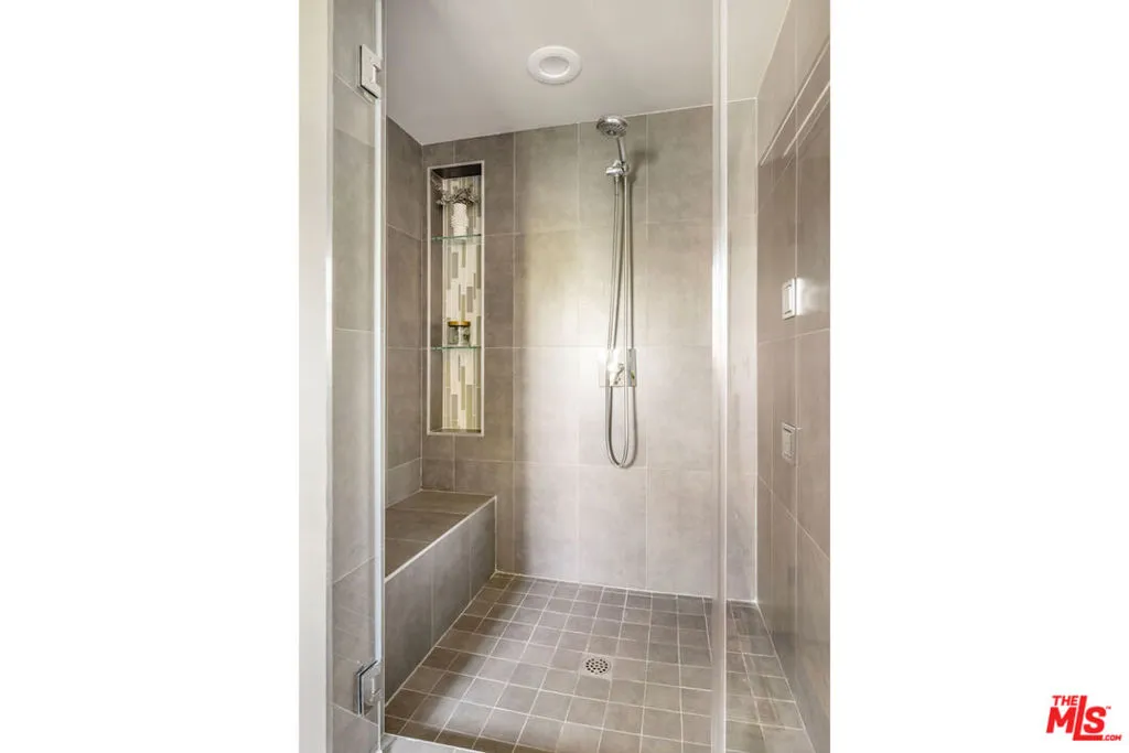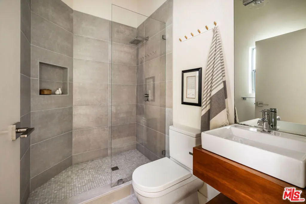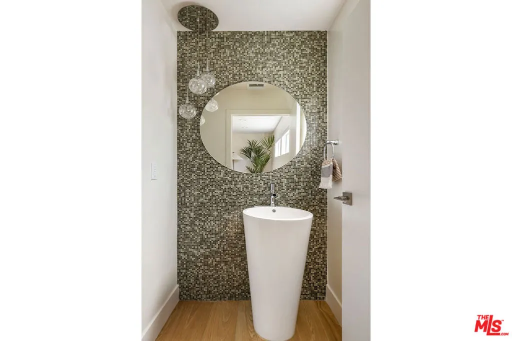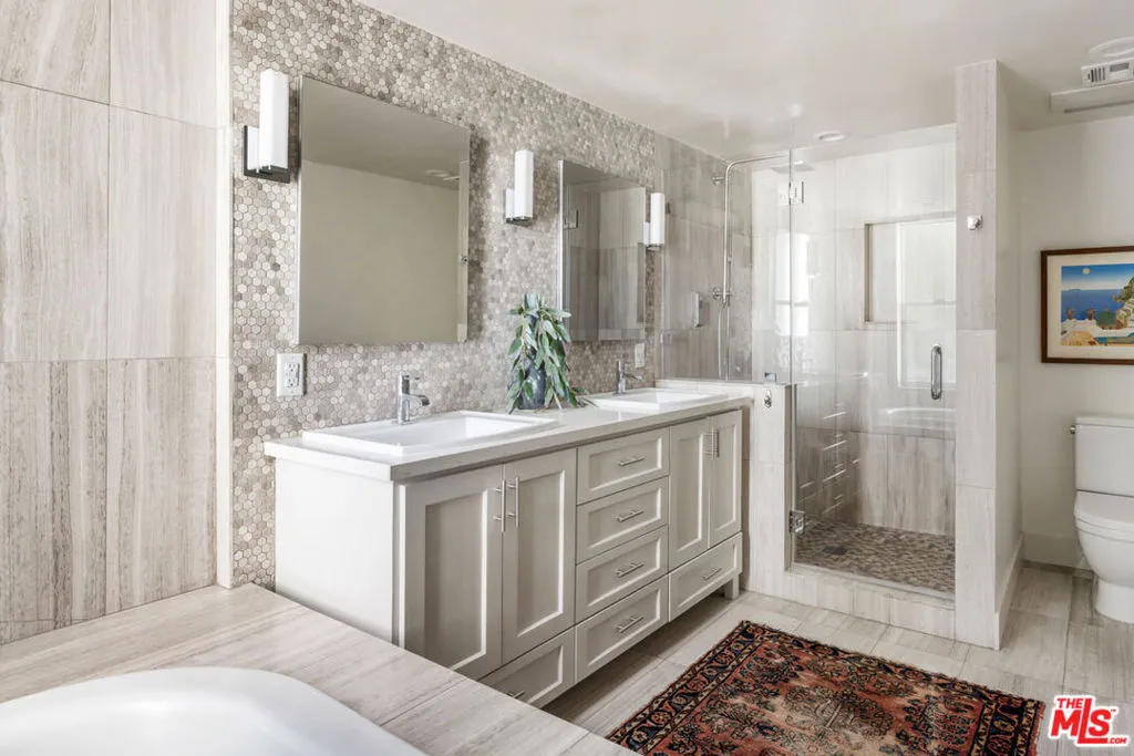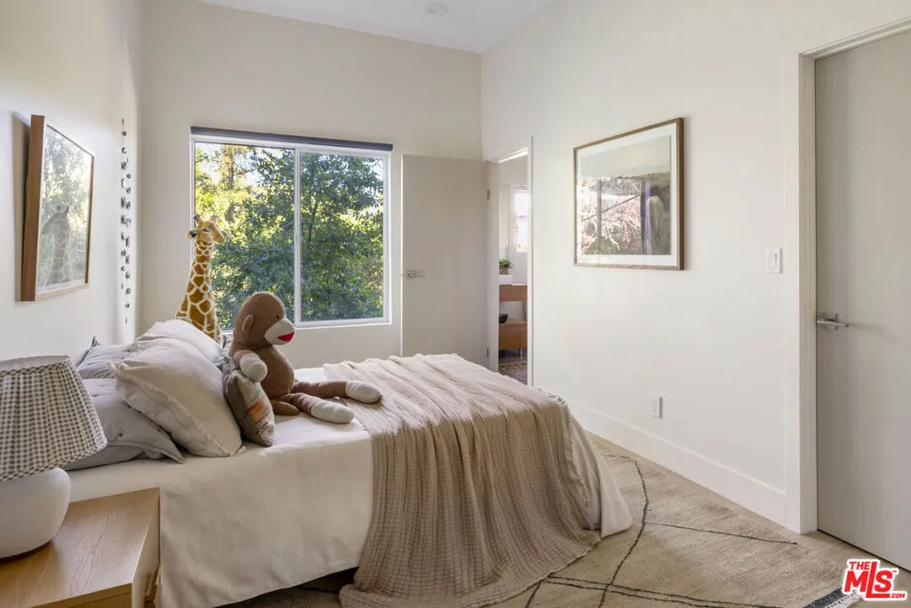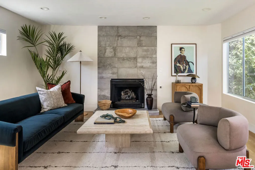 In Silver Lake, this updated Modern is pure 90s minimalism, impressive in scale and showcasing incredible views. The expansive layout provides several spaces to live and gather, including a living room with a slate fireplace and powder room, and formal dining; abundant windows bring in views of lush greenery. The sunny kitchen features a double pantry, built-in appliances, and a custom wood breakfast bar. An adjacent den feels like a sunroom with walls of glass, extending to a wraparound balcony with a pergola and sweeping views of the Silver Lake hills and sparkling city lights. All four bedrooms are en-suite; the generous primary includes a dedicated lounge space, custom walk-in closet, and a bathroom with a separate shower and soaking tub. Amenities include a two-car attached garage, dual zone central HVAC, and laundry. Well-situated in the Micheltorena Elementary School District, you are mere moments from the Silver Lake Reservoir and Meadow, Sunset Junction, and dining and shopping on Silver Lake Boulevard.