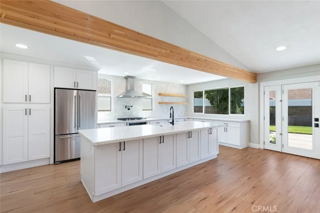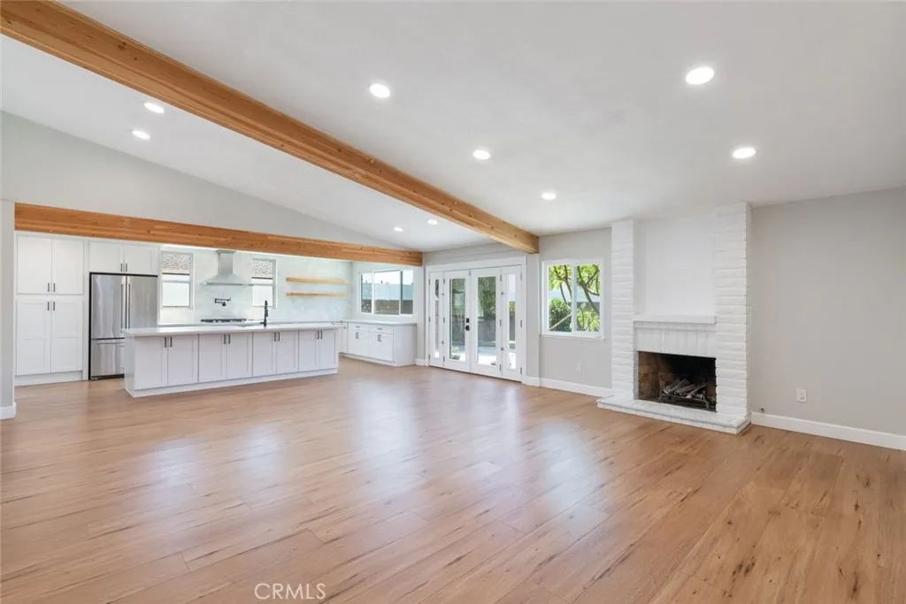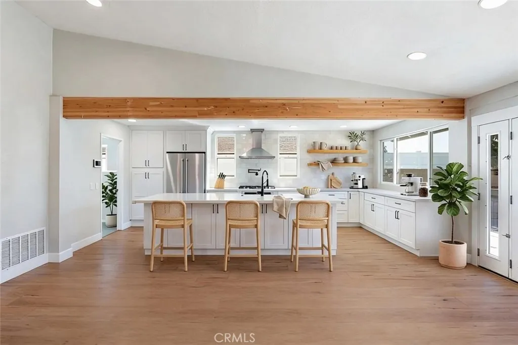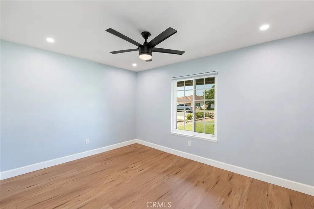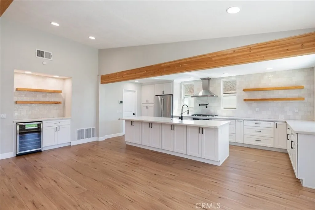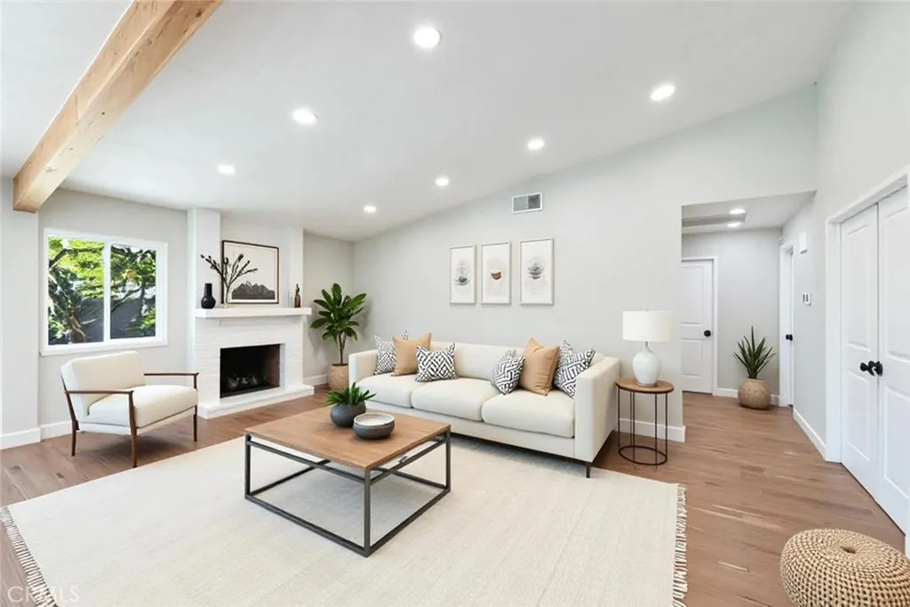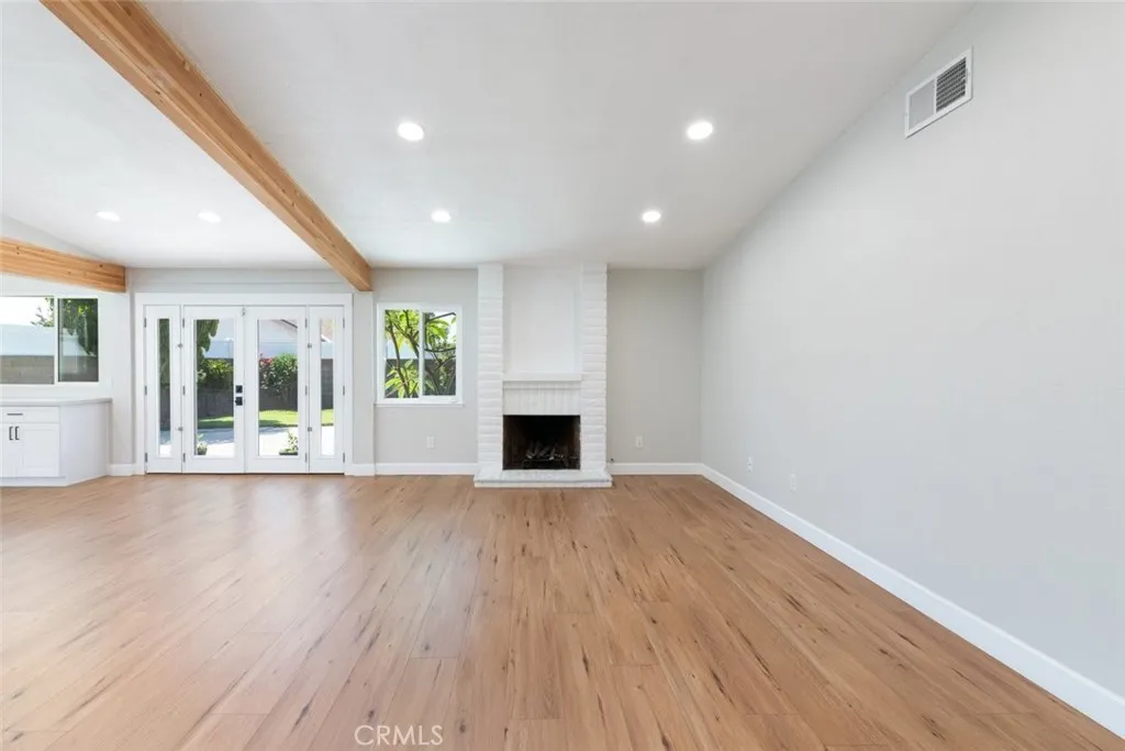 No expense was spared in transforming this beautifully updated single-story home. The 3-bedroom, 2-bath home has been thoughtfully improved inside and out, offering a blend of style, comfort, and functionality. The open-concept layout features soaring high ceilings with striking wood beams, recessed lighting, and a warm, inviting fireplace. At the heart of the home, the fully remodeled kitchen is a showpiece featuring premium Kitchen Aid appliances, an oversized island excellent for gatherings, a designer pot filler, and roll-out drawers. Complemented by a sleek backsplash and floating shelves, it’s great for both everyday living and entertaining. The space flows into the family room, which is equipped with a dry bar and a wine refrigerator - ideal for hosting. The luxury vinyl plank flooring extends throughout the entire home, providing an effortless flow from room to room. The inviting primary bedroom, features a double-door entry, continued high ceilings, direct access to the backyard through a newly installed sliding glass door, creating an indoor-outdoor connection. The primary bathroom features a functional layout with matching quartz countertops carried through from the kitchen, updated fixtures, a spa-like shower, and a spacious walk-in closet. The full secondary bathroom has been fully renovated with modern finishes that mirror the home’s overall style. Additional upgrades include ceiling fans in every bedroom, dual-pane windows, a newly installed roof, and an updated condenser, providing both comfort and peace of mind. Other highlights include an individual laundry room, a spacious driveway, nicely manicured, large front and back lawns with plenty of room to relax or customize. Conveniently located near Ontario Centennial and Kimball Community Park, along with Liberty Elementary School. Near the residence is access to shopping, dining, and major freeways. It’s a completely turnkey home.