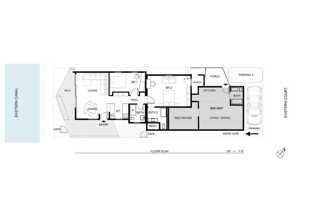 Two units on a one-of-a-kind T lot, with long views of the Linnie Canal in the Historic Venice Canals. One main house, 2 bedrooms / 2 bathrooms, and an additional guesthouse/studio, 1 bedroom / 1 bathroom. Right on the iconic Venice Canals, this beautifully renovated two-bedroom, two-bathroom cottage offers a rare blend of contemporary design and effortless indoor-outdoor living. Reimagined in 2008 by Los Angeles architect Mark Mack, the home features polished heated concrete floors, European windows, and expansive sliding glass doors that fully open the front facade from the living and dining area onto a spacious deck overlooking the water. With expansive views down the full length of the Linnie Canal, the setting is truly exceptional. A generous canal-front patio invites dining, entertaining, or simply enjoying the tranquil atmosphere, while a private side yard with BBQ provides a more secluded outdoor retreat. The primary suite features a king-size bed, soaring ceilings, a skylight, abundant closet space, and a spacious modern bathroom. The second bedroom offers a queen-size bed, generous storage, and a warm, comfortable atmosphere. The open kitchen is appointed with Brazilian quartz countertops and bar seating. The home is fully furnished and thoughtfully equipped with dishes, cooking utensils, household essentials, a Nespresso machine, and additional coffee appliances. An in-unit washer and dryer, Sonos sound system, Wi-Fi, Apple TV with Netflix, tankless water heater, and water-efficient landscaping complete the offering. In addition, a separate guesthouse/office unit includes its own bathroom, kitchen, living/work area, bedroom, and private outdoor seating at the entrance, ideal for guests, remote work, or added privacy. If not needed, this unit may be excluded from the lease, reducing the rent to $10,000 per month. Two parking spaces are located off the rear alley with convenient side access to the property. A stylish and serene canal-front retreat in one of Los Angeles' most desirable neighborhoods.