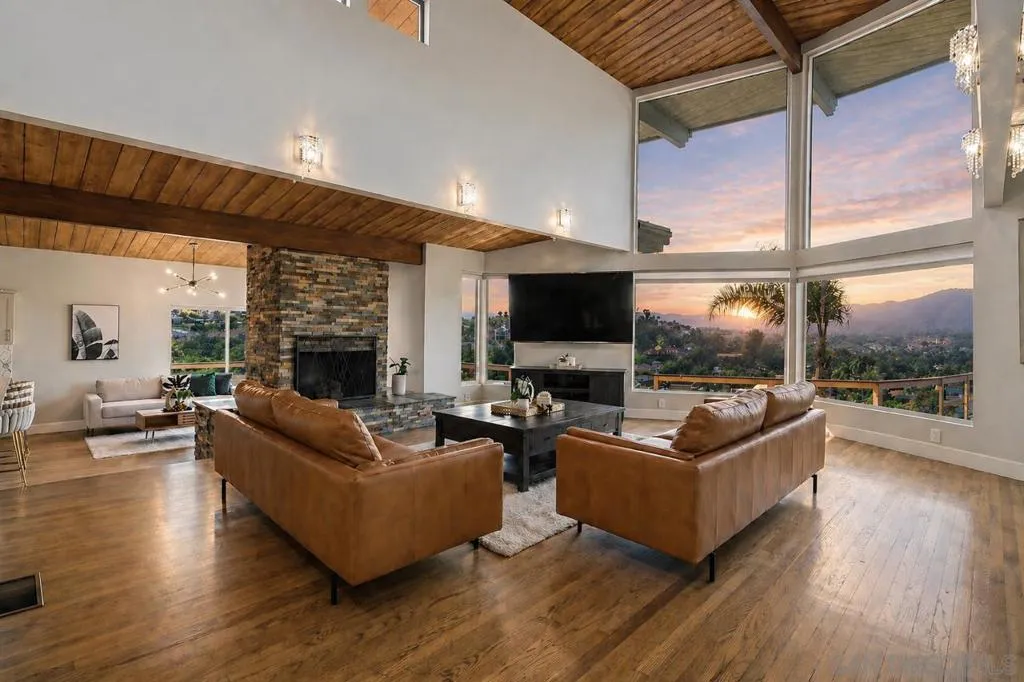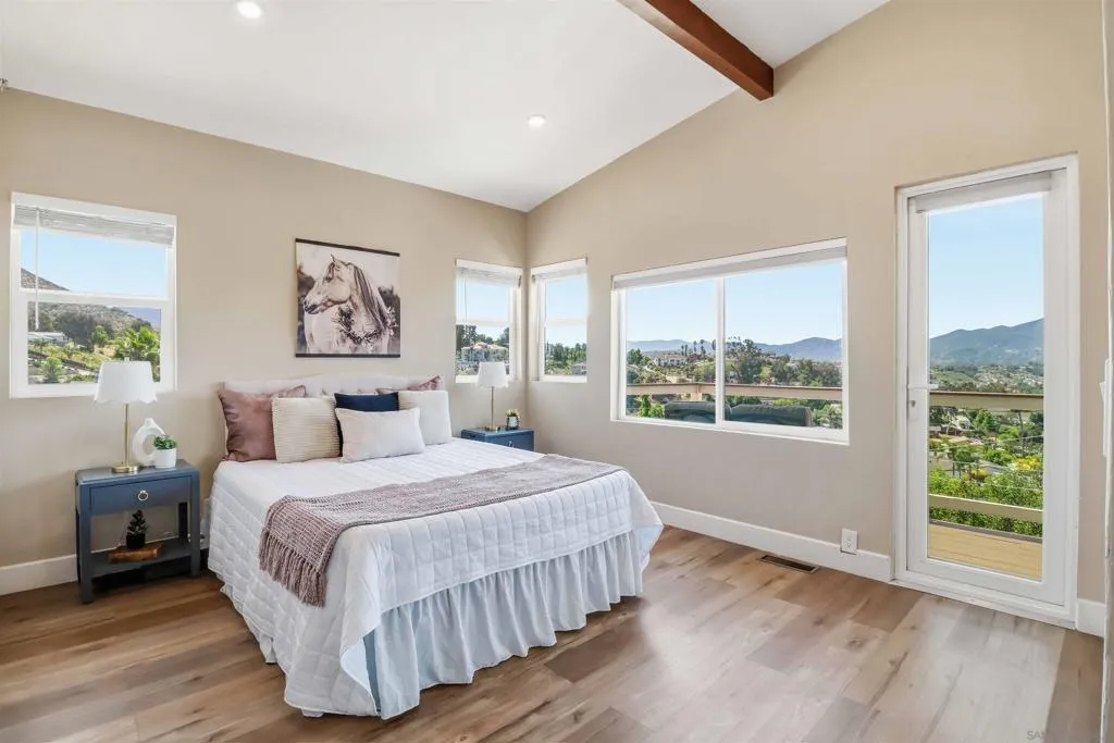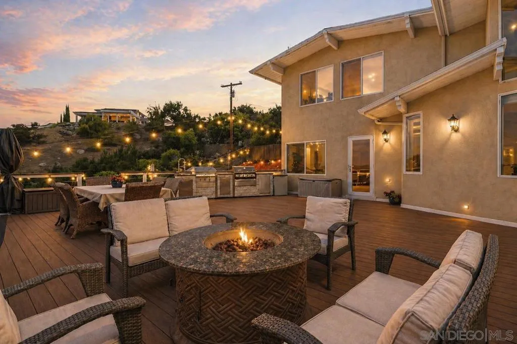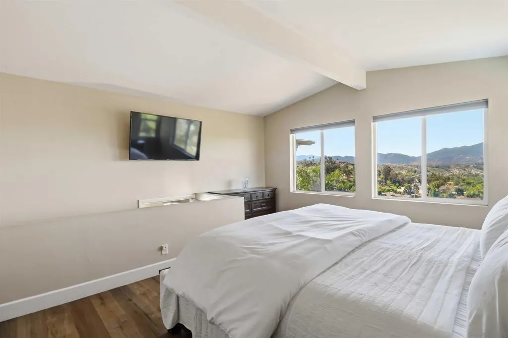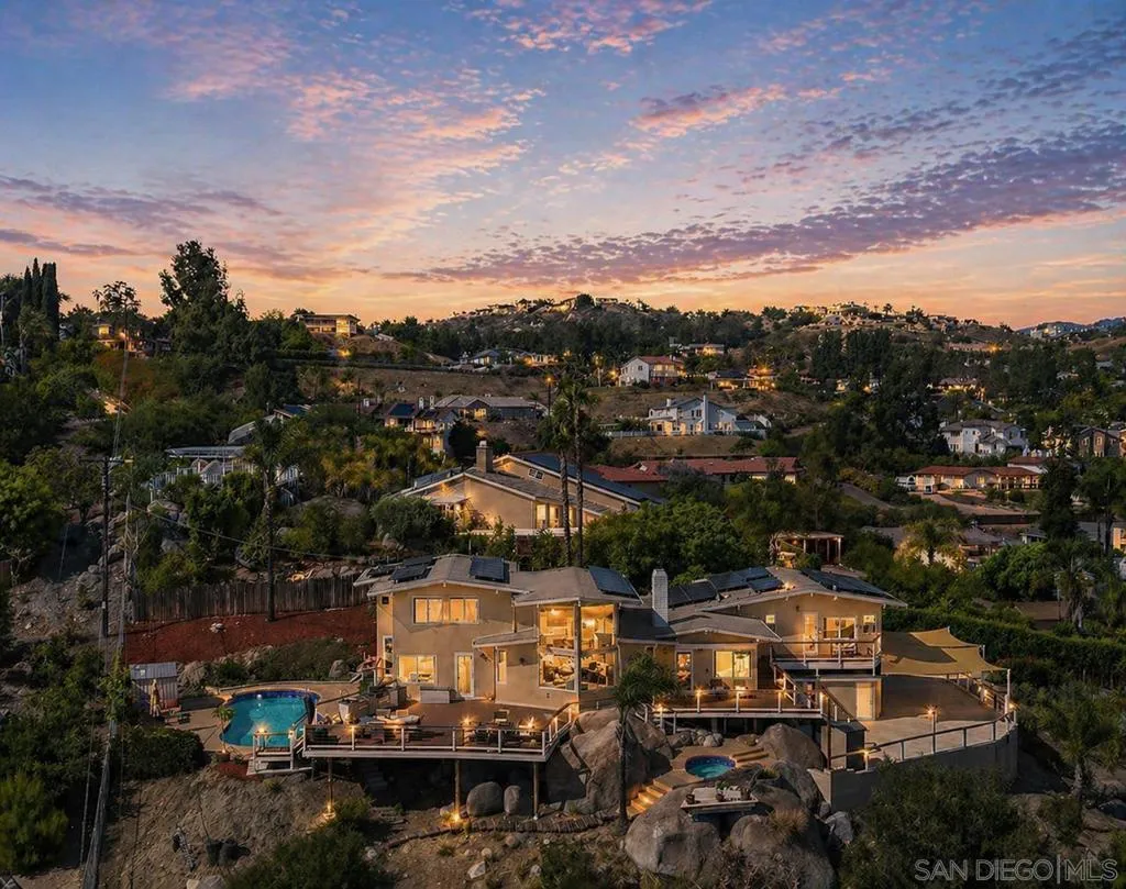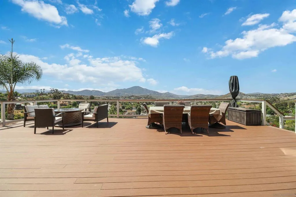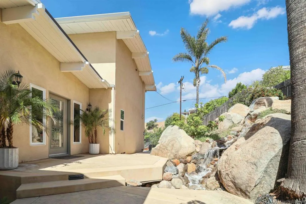 Extensively upgraded custom retreat showcasing panoramic views of the surrounding hills and valley from nearly every room. This private residence features a dramatic front entry with waterfall, lush landscaping, mature palms, wood stairs, boulders, citrus trees, exposed wood beam ceilings, hardwood floors, and beautiful tongue-and-groove cedar details. Enjoy resort-style outdoor living with a pool, spa, changing room, expansive wraparound Trex deck (~1,500 sq ft), multiple view decks and balconies, RV parking with full hookups, and a graded ADU pad. Recent upgrades include new double-pane Low-E windows and doors (2019), new stucco (2019), new entry stairs and concrete (2019), insulated garage doors (2019), fully remodeled kitchen with new appliances (2019), four updated bathrooms (2019), new plumbing and drywall (2019), dual-zone Trane AC (4-ton & 3-ton), new septic tank (2020), oversized storm drainage system (2020), widened driveway with new concrete and retaining walls, new RV parking pad with hookups, and a 12x16 barn-style workshop with 50-amp service. Outdoor upgrades include new pool, spa, and water feature plaster and equipment (2020), plus a finished garden area, creating a rare opportunity offering privacy, extensive upgrades, and exceptional indoor-outdoor living. Extensively upgraded custom retreat showcasing panoramic views of the surrounding hills and valley from nearly every room. This private residence features a dramatic front entry with waterfall, lush landscaping, mature palms, wood stairs, boulders, citrus trees, exposed wood beam ceilings, hardwood floors, and beautiful tongue-and-groove cedar details. Enjoy resort-style outdoor living with a pool, spa, changing room, expansive wraparound Trex deck (~1,500 sq ft), multiple view decks and balconies, RV parking with full hookups, and a graded ADU pad. Recent upgrades include new double-pane Low-E windows and doors (2019), new stucco (2019), new entry stairs and concrete (2019), insulated garage doors (2019), fully remodeled kitchen with new appliances (2019), four updated bathrooms (2019), new plumbing and drywall (2019), dual-zone Trane AC (4-ton & 3-ton), new septic tank (2020), oversized storm drainage system (2020), widened driveway with new concrete and retaining walls, new RV parking pad with hookups, and a 12x16 barn-style workshop with 50-amp service. Outdoor upgrades include new pool, spa, and water feature plaster and equipment (2020), plus a finished garden area, creating a rare opportunity offering privacy, extensive upgrades, and exceptional indoor-outdoor living.