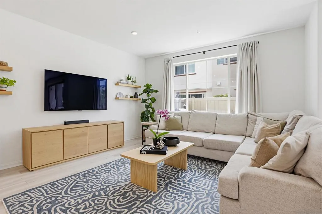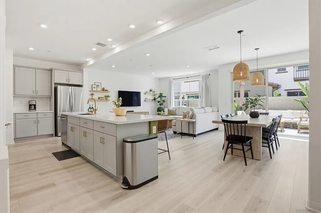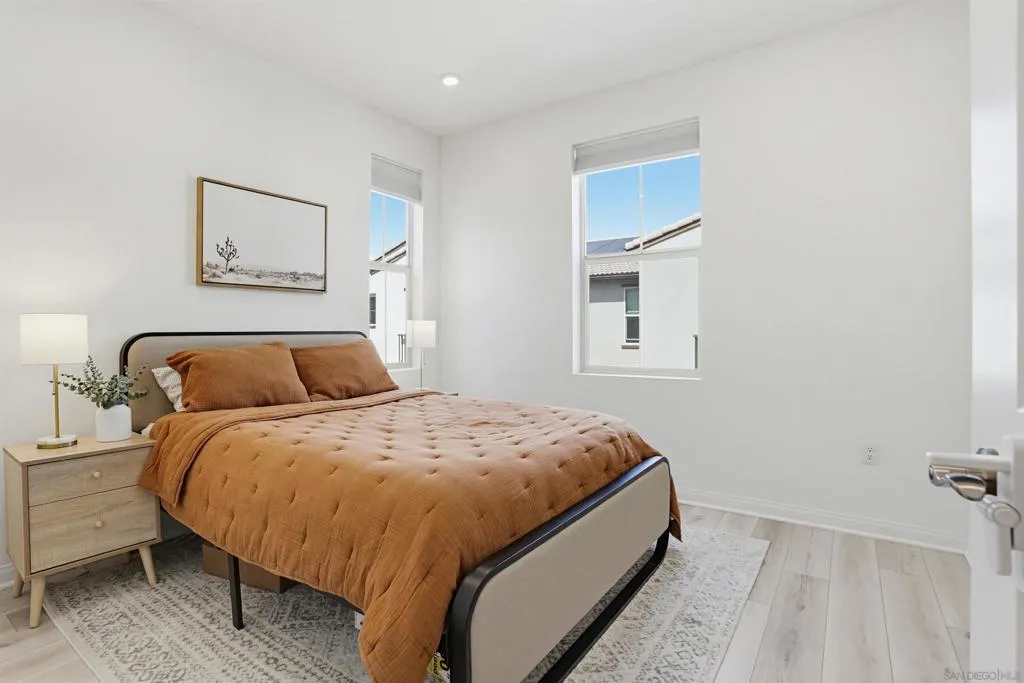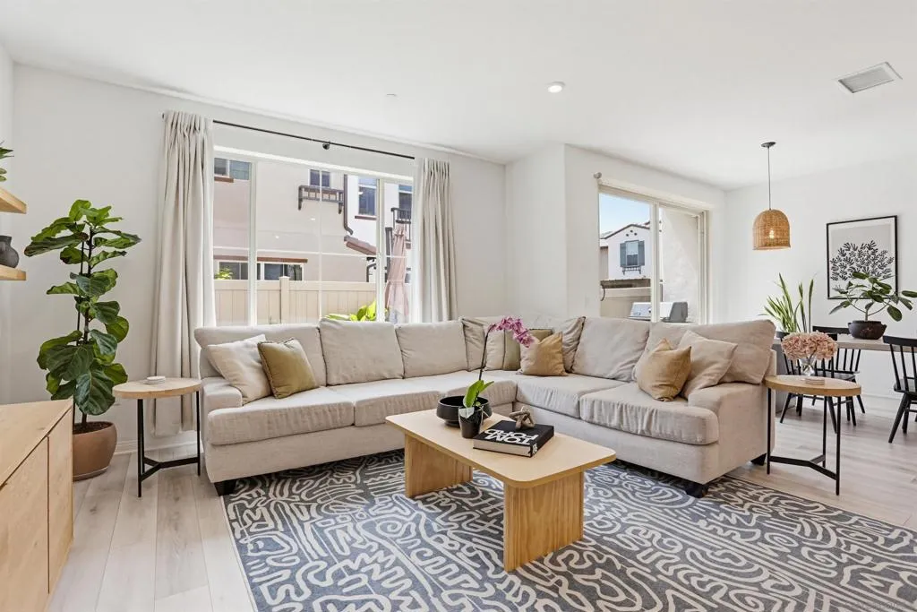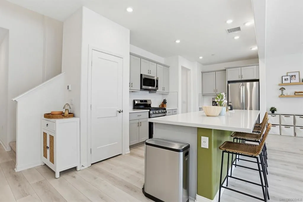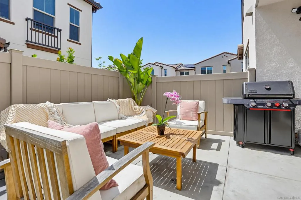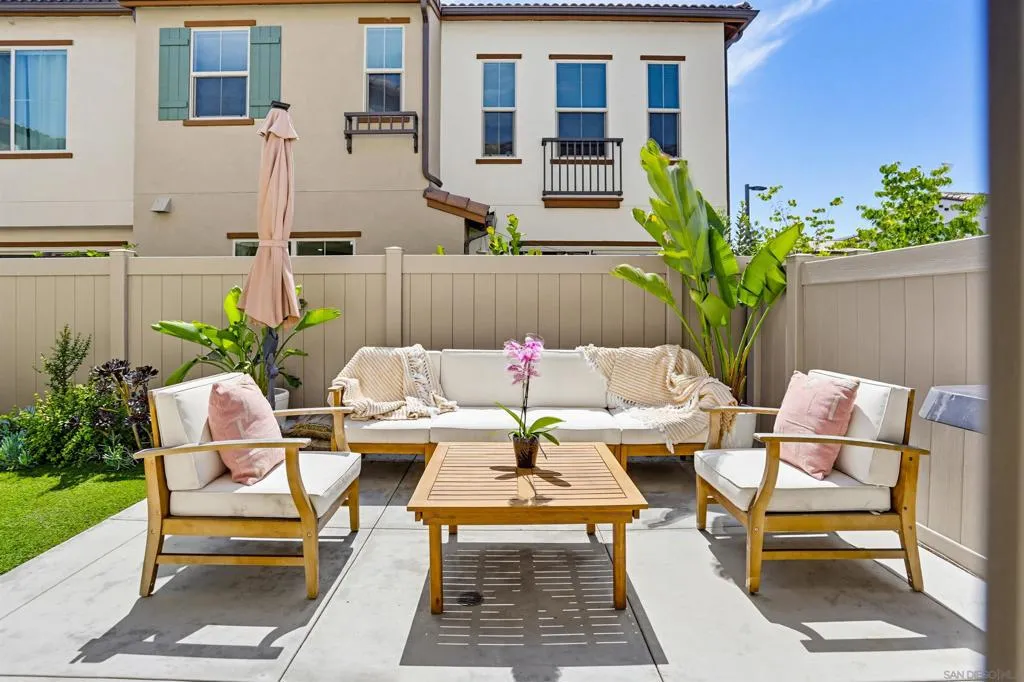 This stunning 3-bed, 2.5-bath, townhome, built in 2023, perfectly blends modern efficiency with high-end custom finishes. Tucked away in a quiet cul-de-sac, the property offers a serene living environment while boasting a light and open atmosphere throughout. The desirable open floor plan features a private patio off the living room with turf, designed for both comfort and entertaining. The inviting interior features high ceilings, vinyl wood flooring, dual pane windows, AC, recessed lighting, ample storage and an abundance of natural light throughout. The home is finished in a fresh, light-toned paint palette that maximizes natural light. The large and open gourmet kitchen is a true centerpiece featuring soft-close wooden cabinetry, high end brass hardware, quartz countertops, tile backsplash, two large pantries, and stainless steel appliances. The spacious master suite is set away from the other bedrooms, with a ceiling fan, walk-in closet, and a beautiful spa-like bathroom with glass shower and tub. The loft provides ample space for a home office, kids play area, media room, or library. Additional features include an owned solar system, upgraded built in wood cabinetry at the top of the stairs, 2-car garage with storage racks, LED lighting and high end fixtures, a dedicated laundry room upstairs, a tankless water heater, custom vanity in the powder room, and more. This home represents a "turn-key" opportunity, with tens of thousands in builder and owner upgrades allowing you to move in and immediately enjoy a contemporary lifestyle. Melrose Heights, (See supplement...) Melrose Heights is a highly sought after and well maintained community. Amenities include a large pool, spa, BBQs, picnic areas, playgrounds, and walking trails. All located within a short drive to beaches, downtown Carlsbad, Oceanside Pier, trendy Vista restaurants, and more. This is modern North County San Diego living at an affordable price!