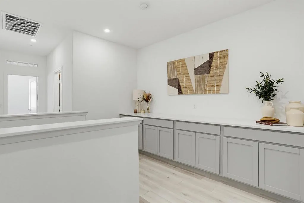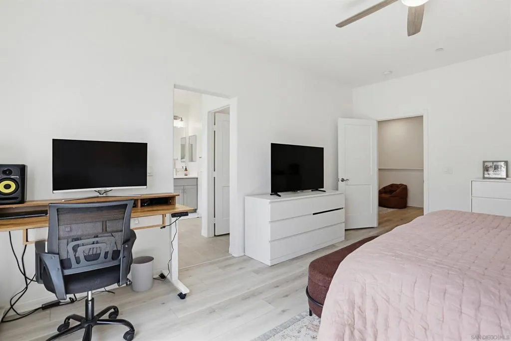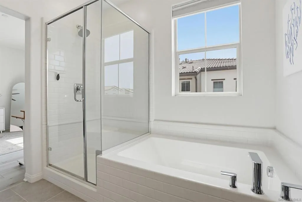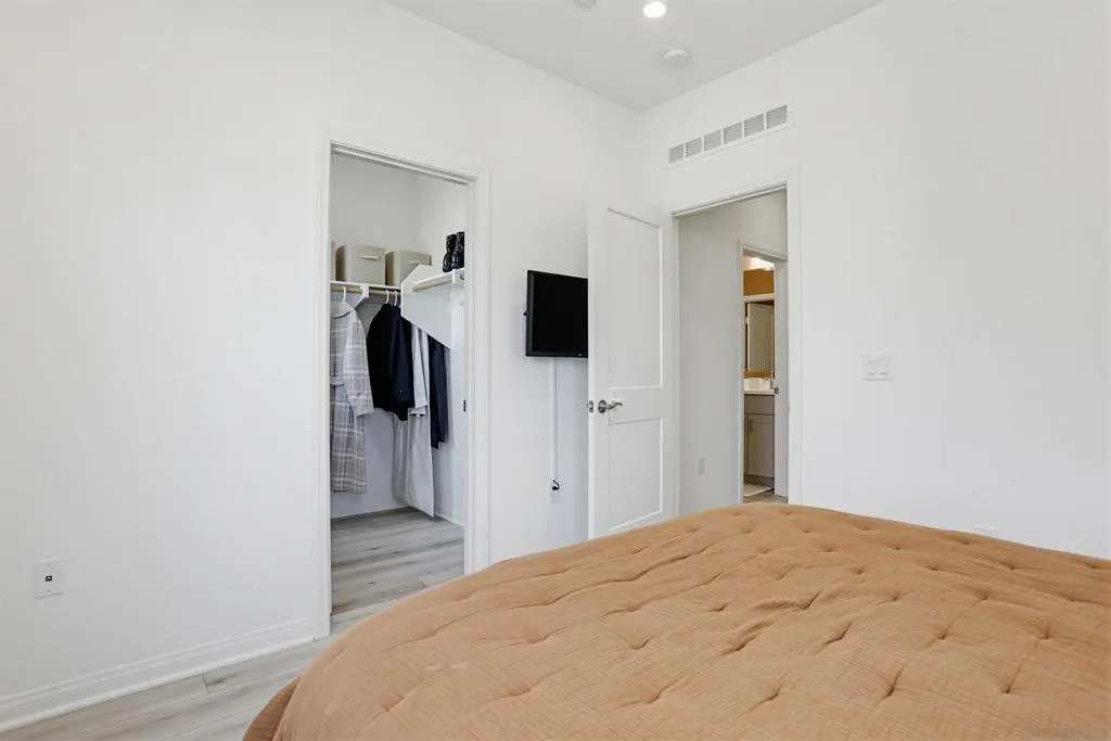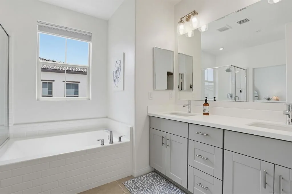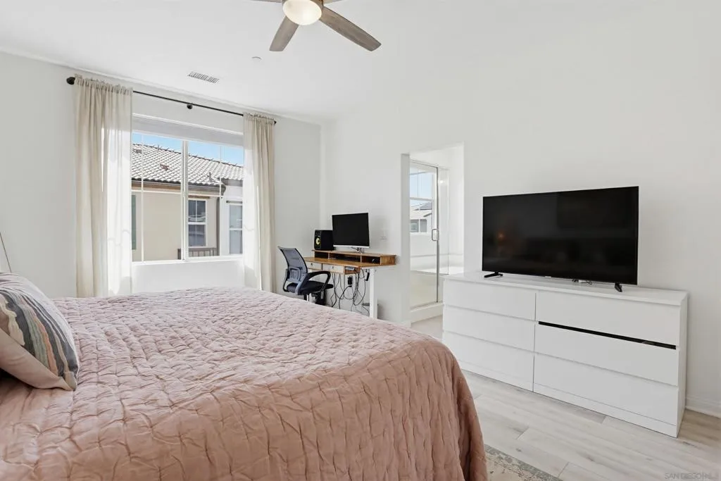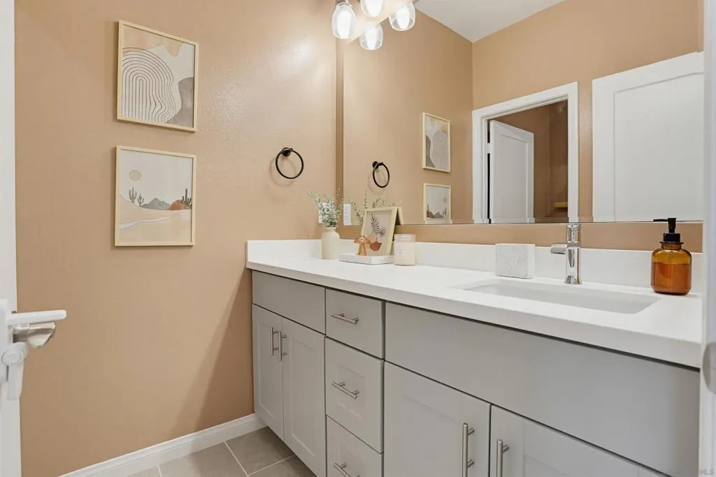 This stunning 3-bed, 2.5-bath, townhome, built in 2023, perfectly blends modern efficiency with high-end custom finishes. Tucked away in a quiet cul-de-sac, the property offers a serene living environment while boasting a light and open atmosphere throughout. The desirable open floor plan features a private patio off the living room with turf, designed for both comfort and entertaining. The inviting interior features high ceilings, vinyl wood flooring, dual pane windows, AC, recessed lighting, ample storage and an abundance of natural light throughout. The home is finished in a fresh, light-toned paint palette that maximizes natural light. The large and open gourmet kitchen is a true centerpiece featuring soft-close wooden cabinetry, high end brass hardware, quartz countertops, tile backsplash, two large pantries, and stainless steel appliances. The spacious master suite is set away from the other bedrooms, with a ceiling fan, walk-in closet, and a beautiful spa-like bathroom with glass shower and tub. The loft provides ample space for a home office, kids play area, media room, or library. Additional features include an owned solar system, upgraded built in wood cabinetry at the top of the stairs, 2-car garage with storage racks, LED lighting and high end fixtures, a dedicated laundry room upstairs, a tankless water heater, custom vanity in the powder room, and more. This home represents a "turn-key" opportunity, with tens of thousands in builder and owner upgrades allowing you to move in and immediately enjoy a contemporary lifestyle. Melrose Heights, (See supplement...) Melrose Heights is a highly sought after and well maintained community. Amenities include a large pool, spa, BBQs, picnic areas, playgrounds, and walking trails. All located within a short drive to beaches, downtown Carlsbad, Oceanside Pier, trendy Vista restaurants, and more. This is modern North County San Diego living at an affordable price!