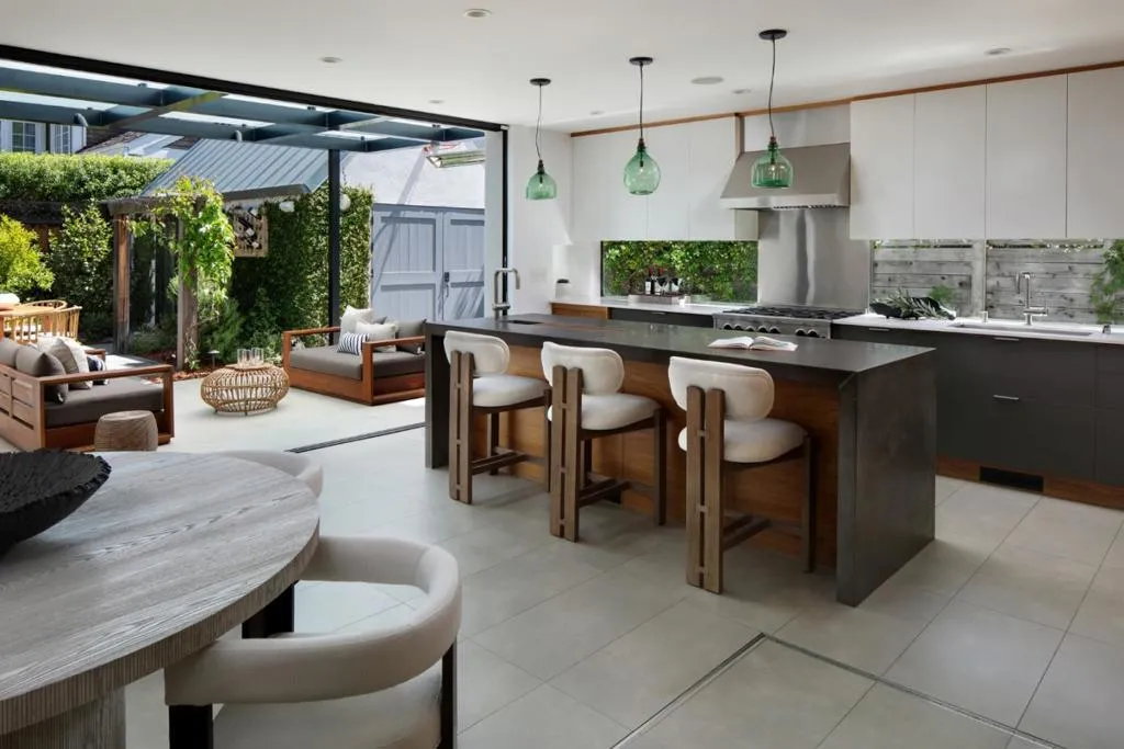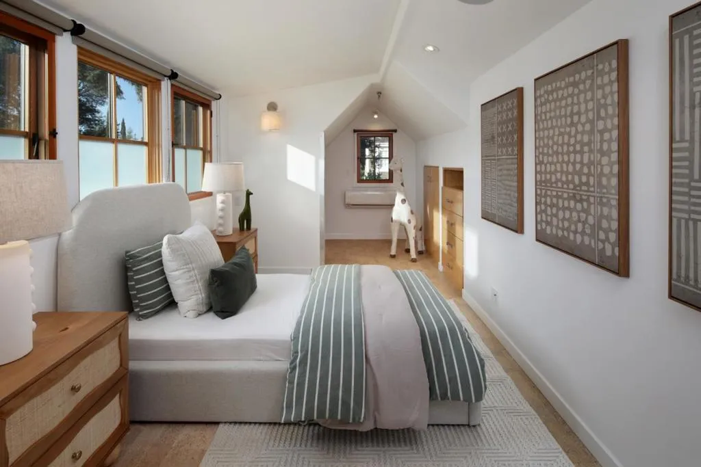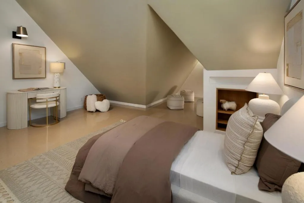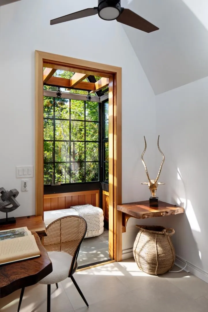 Nestled on a quiet, tree-lined street just moments from dwntwn, this chic Tudor blends old-world character w/ modern, organic design, offering privacy and quintessential California indoor-outdoor living. The main level features a stunning kit and dining area that opens seamlessly outdoors through fully receding glass sliders, anchored by a double-sided gas FP shared w/ an impressive LR w/ soaring beamed ceilings. A charming sunrm and office add bonus space. Two en-suite bedrms are also on the first floor, including a serene primary w/ patio access and a spa-like bath with steam shower, plus a second suite w/ a walk-in closet, along with a stylish laundry rm and powder rm. Upstairs, two add'l bdrms share a beautifully appointed bath and access to a large attic for storage. Lush, mature landscaping creates a private setting w/ a welcoming front patio, raised garden beds, and a prolific avocado tree, while the enchanting rear yd features a fire pit, tranquil water element, outdoor BBQ, dining area, a majestic redwood, and a glass-covered patio with built-in heaters. A converted garage with loft offers versatile flex space. Additional highlights include maple wood floors, air conditioning, double-pane windows, a standing metal roof, EV charger, and access to excellent public schools.