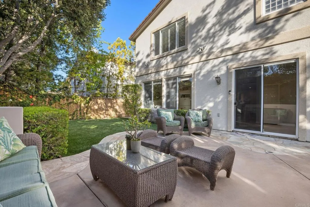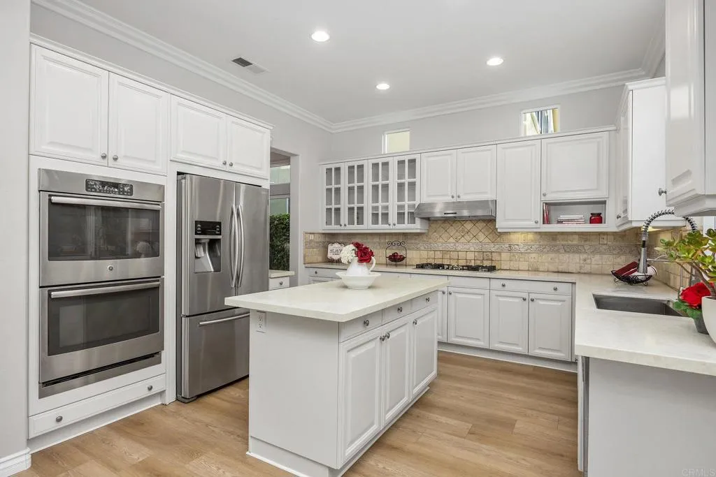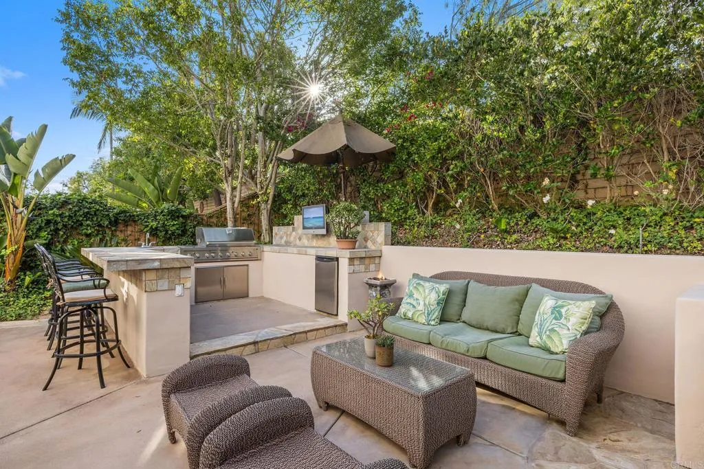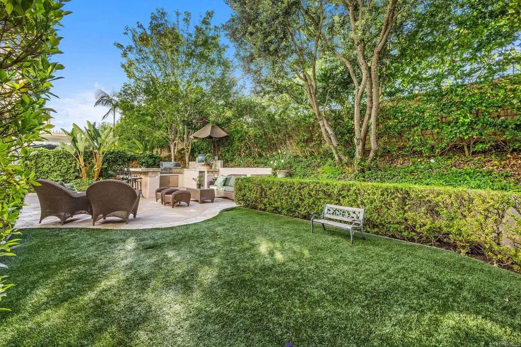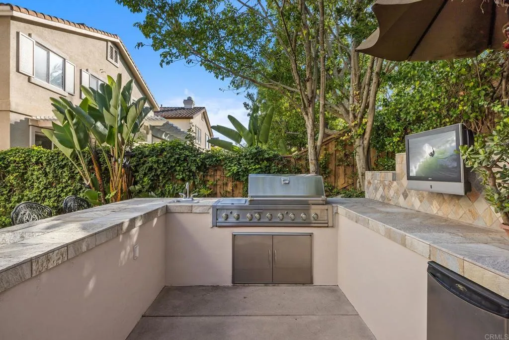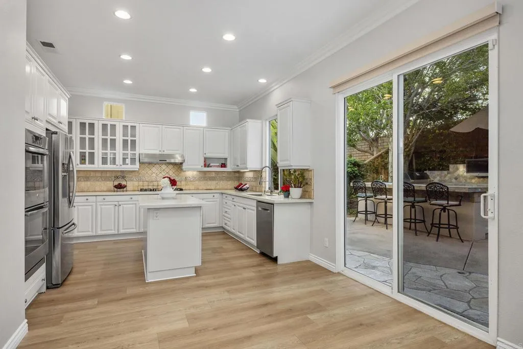 Nestled in the highly desirable Belmont community, this beautifully maintained home blends timeless curb appeal, inviting warmth, and thoughtful design. Set on a quiet cul-de-sac with direct access to adjacent green space, the property offers mature landscaping, attractive architecture, and a peaceful sense of retreat. Step inside through the dramatic volume ceiling entry, where abundant natural light, white oak look luxury flooring, crown molding, and designer lighting create a bright, airy atmosphere with warmth and sophistication throughout. The formal living room offers a refined, yet comfortable space anchored by a striking dual-sided gas fireplace. Celestial windows between the living and family rooms add architectural charm and extends natural light. The spacious family room features built-in cabinetry and large picture windows overlooking the private backyard. The family room flows seamlessly into the kitchen, creating a true open concept gathering space at the heart of the home. Designed for both entertaining and daily living, the kitchen features upgraded stone countertops, travertine backsplash, stainless steel appliances including double wall ovens and gas range, walk-in pantry, spacious center island, and backyard views. A convenient pass-through connects to the formal dining room, where large windows and statement chandelier create an elegant setting for gatherings. A private guest bedroom, full bath, laundry room with sink, and separate two-car and one-car garages complete the entry level. White oak look luxury flooring continues to the second level landing overlooking the grand entry, while crown molding and plantation shutters add warmth and cohesive design. The expansive primary suite offers a fireplace, an elegant chandelier, backyard views, a spa-inspired bath with soaking tub, oversized shower, separate vanities, and a dual-entry walk-in closet. The second level includes three well-appointed secondary bedrooms, one ensuite, and an upgraded shared bath. Designed as a private backyard retreat, the outdoor living spaces blend functionality, comfort, and mature natural beauty. The well-appointed outdoor kitchen serves as a standout centerpiece with built-in BBQ, bar seating, refrigerator, sink, television, and generous prep space for effortless gatherings. A turf play area adds versatility for kids, pets, or low-maintenance enjoyment, while mature landscaping, lush greenery, and inviting seating areas create a peaceful private oasis. Ideally located near top-rated schools, scenic trails, shopping, parks, and beaches, this Belmont home offers exceptional comfort and lifestyle.