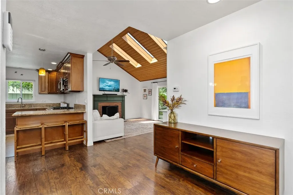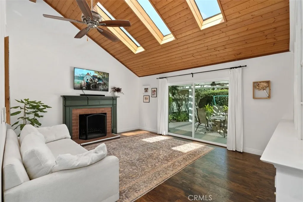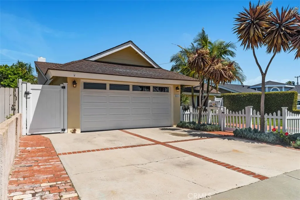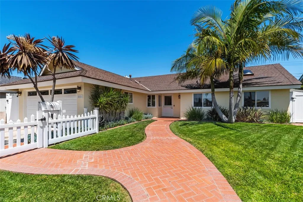 Gorgeous beach home, situated within the center of the neighborhood, while offering excellent curb appeal and plenty of quality upgrades. The presentation begins at the curb, with a white picket fence surrounding a nicely landscaped front yard, along with a brick walkway leading to the Dutch style front door with pocket screen. As you enter the home, you will be impressed by the formal living room, featuring a wood trimmed high volume ceiling with 3 skylights, along with a fireplace, custom mantle, built-in shelving and a French door leading to the rear patio. The remodeled kitchen features updated cabinetry, granite countertops, stainless steel appliances with a built-in microwave and refrigerator included with the sale. The hall bathroom has been updated with a granite countertop vanity, a bathtub/shower combo with Travertine tile surround plus tile flooring. All the bedrooms are nice sized and feature newer laminate flooring, high baseboards and ceiling fans. The primary bedroom has been fully customized, formerly a 3rd & 4th bedroom, now one spacious primary suite with a large closet, wood trimmed high volume ceiling with 2 skylights and a French door leading to the rear patio. The primary bathroom features a high volume ceiling with a skylight, along with an expanded walk-in shower with Travertine tiled surround plus tile flooring. Bonus features include: elegant laminate wood flooring, dual pane windows, smooth ceilings, recessed lighting, panel doors, closet organizers, a pull down ladder to the attic, an updated forced air heater + water heater. The private rear yard features a newer wrap around concrete patio with built-in drains, a lattice cover, nice landscaping with a lawn, an avocado tree + a front & rear timed sprinkler system. This lovely home is also walking distance to award winning schools, a park, golf, shopping, restaurants and is less than 3 miles to the beach or the Bella Terra Mall.