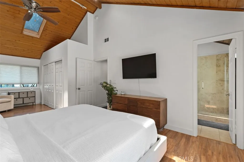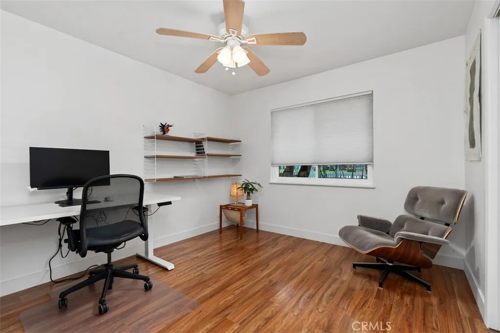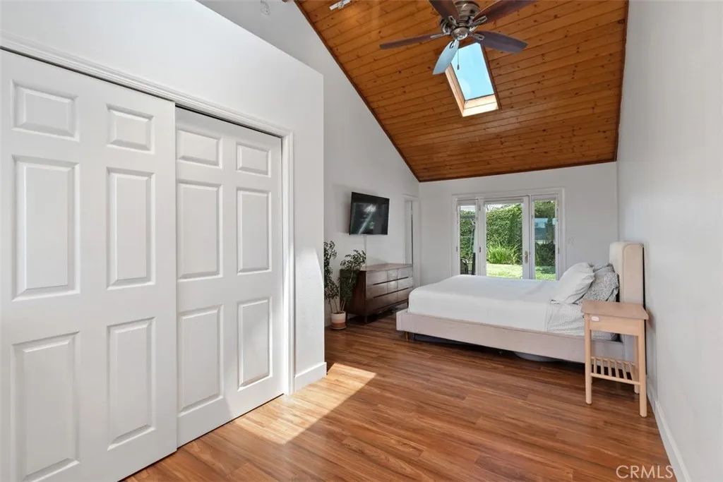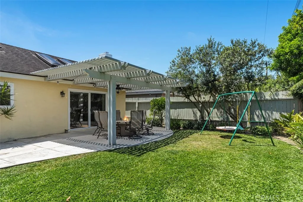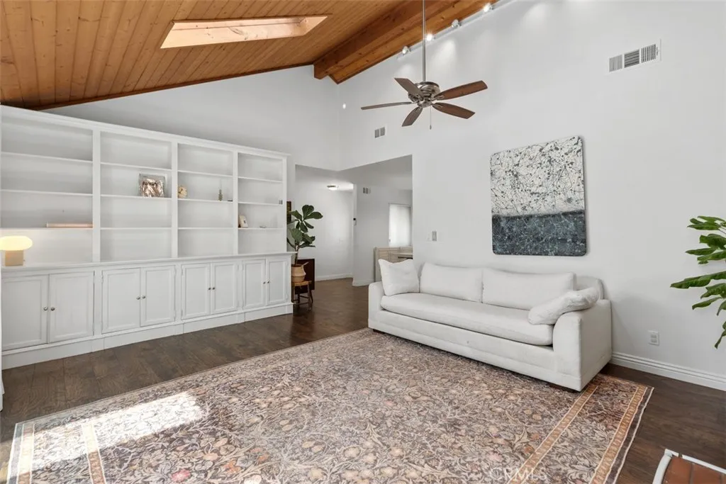 Gorgeous beach home, situated within the center of the neighborhood, while offering excellent curb appeal and plenty of quality upgrades. The presentation begins at the curb, with a white picket fence surrounding a nicely landscaped front yard, along with a brick walkway leading to the Dutch style front door with pocket screen. As you enter the home, you will be impressed by the formal living room, featuring a wood trimmed high volume ceiling with 3 skylights, along with a fireplace, custom mantle, built-in shelving and a French door leading to the rear patio. The remodeled kitchen features updated cabinetry, granite countertops, stainless steel appliances with a built-in microwave and refrigerator included with the sale. The hall bathroom has been updated with a granite countertop vanity, a bathtub/shower combo with Travertine tile surround plus tile flooring. All the bedrooms are nice sized and feature newer laminate flooring, high baseboards and ceiling fans. The primary bedroom has been fully customized, formerly a 3rd & 4th bedroom, now one spacious primary suite with a large closet, wood trimmed high volume ceiling with 2 skylights and a French door leading to the rear patio. The primary bathroom features a high volume ceiling with a skylight, along with an expanded walk-in shower with Travertine tiled surround plus tile flooring. Bonus features include: elegant laminate wood flooring, dual pane windows, smooth ceilings, recessed lighting, panel doors, closet organizers, a pull down ladder to the attic, an updated forced air heater + water heater. The private rear yard features a newer wrap around concrete patio with built-in drains, a lattice cover, nice landscaping with a lawn, an avocado tree + a front & rear timed sprinkler system. This lovely home is also walking distance to award winning schools, a park, golf, shopping, restaurants and is less than 3 miles to the beach or the Bella Terra Mall.