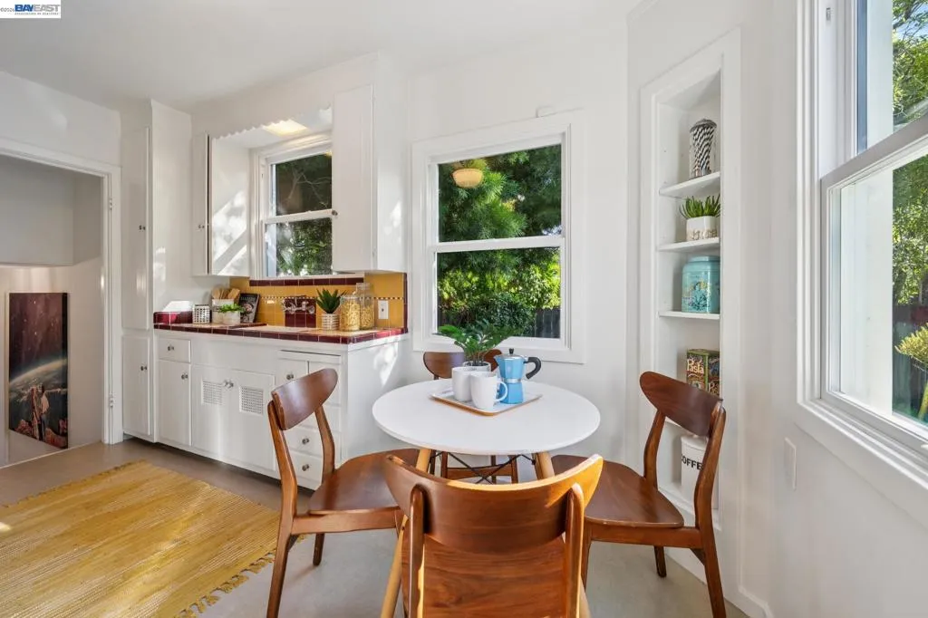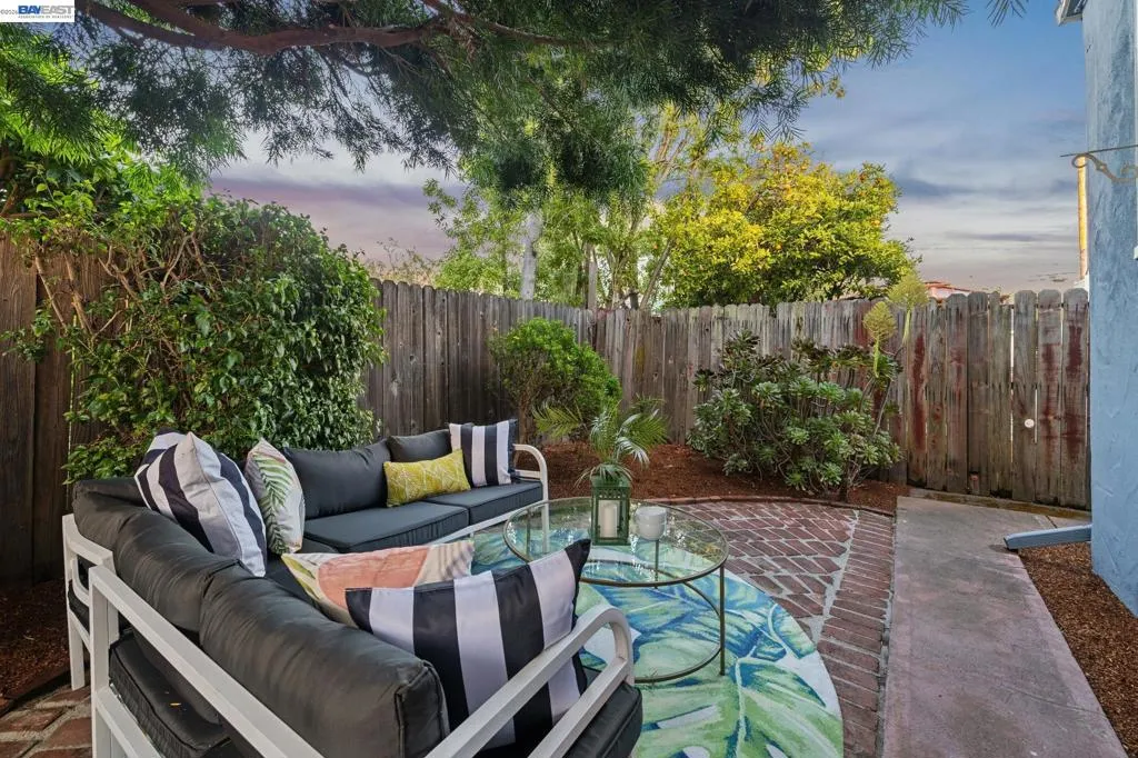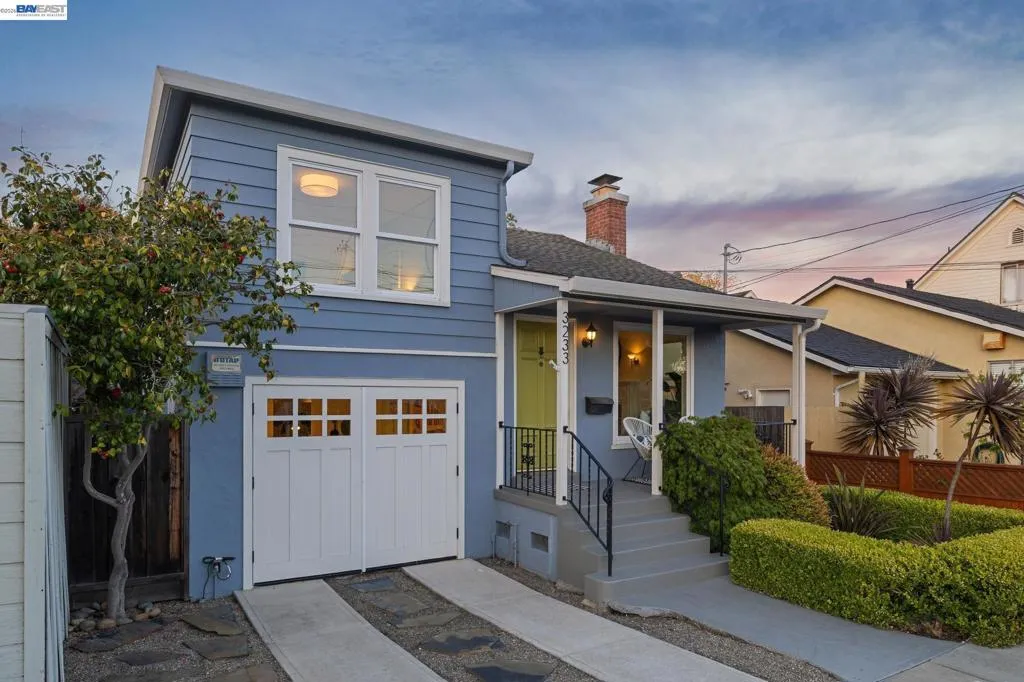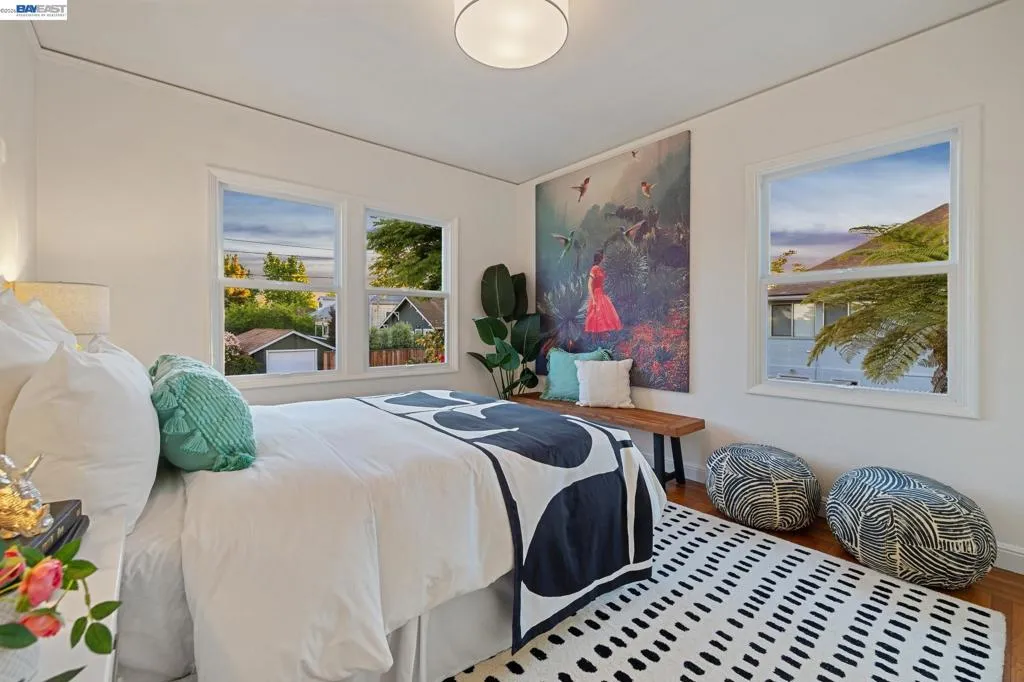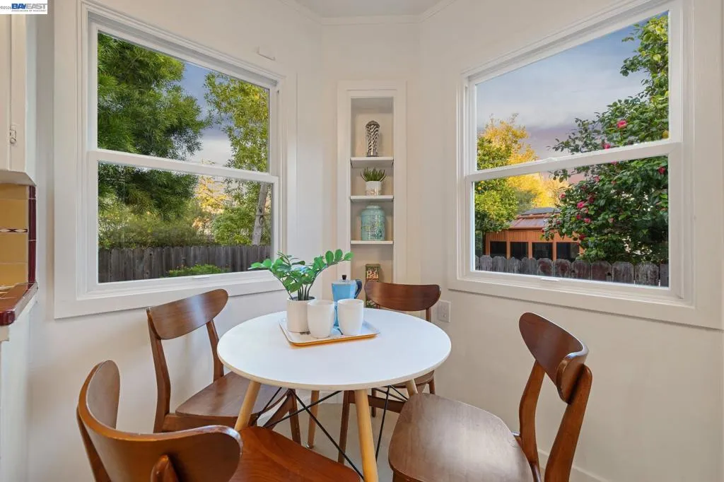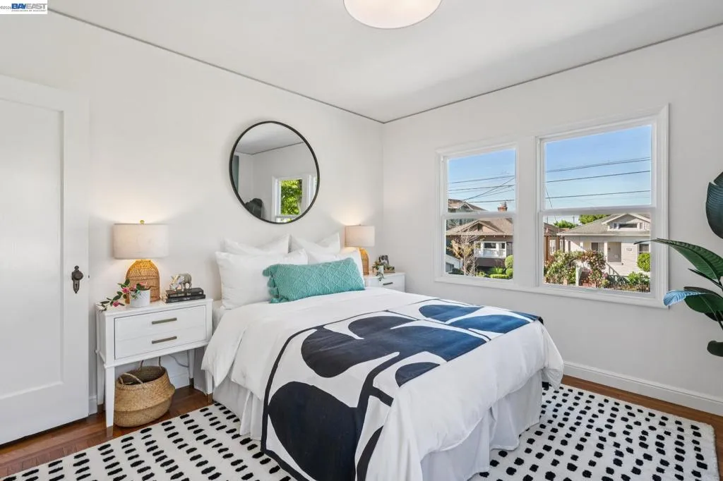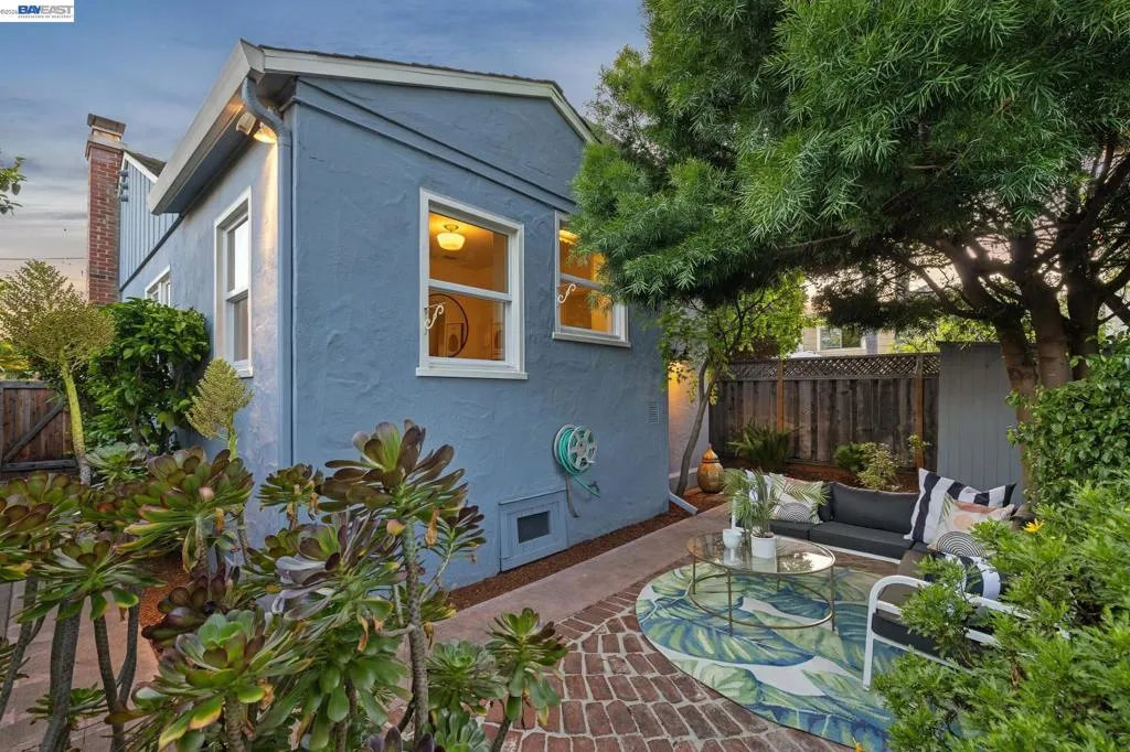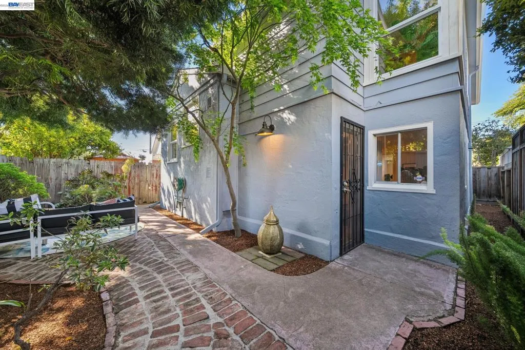 Enjoy the best of Alameda's East End, in this 2+BD/1BA bungalow on a quiet street with shoreline trails, parks, boating, a public swimming pool, and tennis courts only blocks away. Built in 1938, windows galore stream sunshine into the 1151 SQFT home that lives large with additional bonus spaces built out of the basement areas. A landscaped front yard and neighborly porch welcome you inside the home's bright and inviting living room. The fireplace is framed by a mantle with period woodwork and picture windows display garden views, making the room a great place to relax with family and friends. Beautiful plank hardwood floors span into the dining room for great flow and easy entertaining. The room features a staircase with decorative woodwork and a wrought iron handrail leading to the bedrooms. Tucked away for privacy on their own floor, both sunny bedrooms offer hardwood floors and walk-in custom closets and the updated hall bathroom has a shower above the tub. The kitchen adjoins the dining room, featuring a new Bosch fridge, vintage tiling, and a lovely breakfast nook with built-in shelves. Sip your morning coffee with a peaceful view of the backyard, or step through the backdoor where you can dine al fresco on the patio, surrounded by lush mature landscaping. The backyard includes a large storage shed. From the kitchen, you can also access the lower level of the home where the spacious laundry area offers great flexible space for an office, studio, or playroom, and the renovated garage area provides more flexible bonus square footage perfect for a den, family room, or home gym. Both areas have been upgraded with new lighting and hardwood floors. Out your front door, you'll find sought-after schools (elementary and middle school are each a few blocks away), Encinal Market for grocery shopping alongside a local cafe, restaurant, and new bakery, while Park Street’s downtown and Southshore Center are a few minutes away. Stroll to waterfront trails, Lincoln Park, or the Transbay bus stop just down the street for a convenient commute. Additional updates include newer windows (2022), new interior paint, and sewer lateral in compliance!