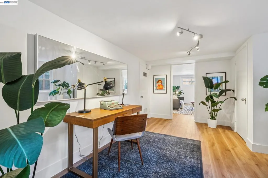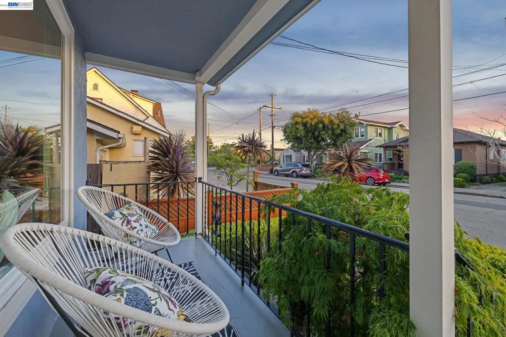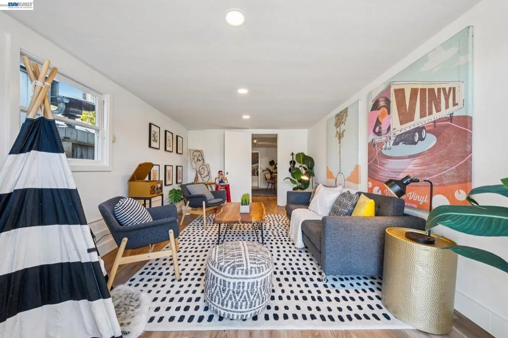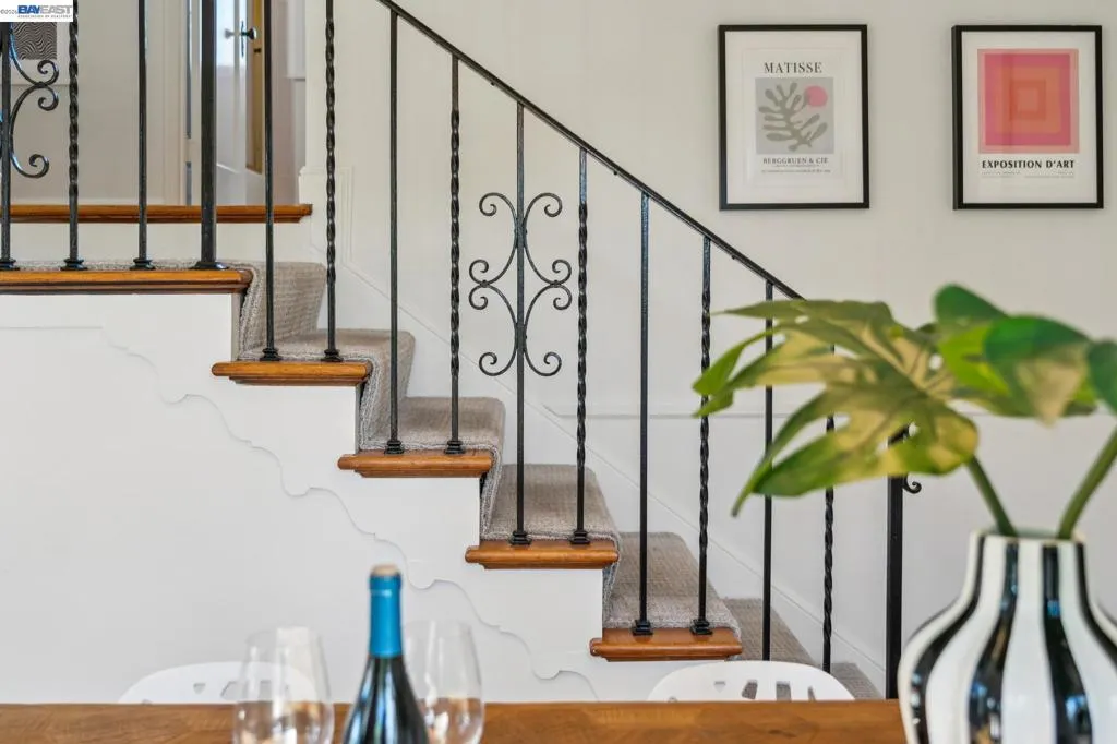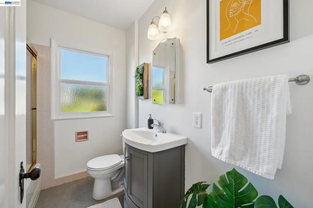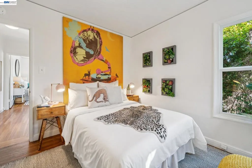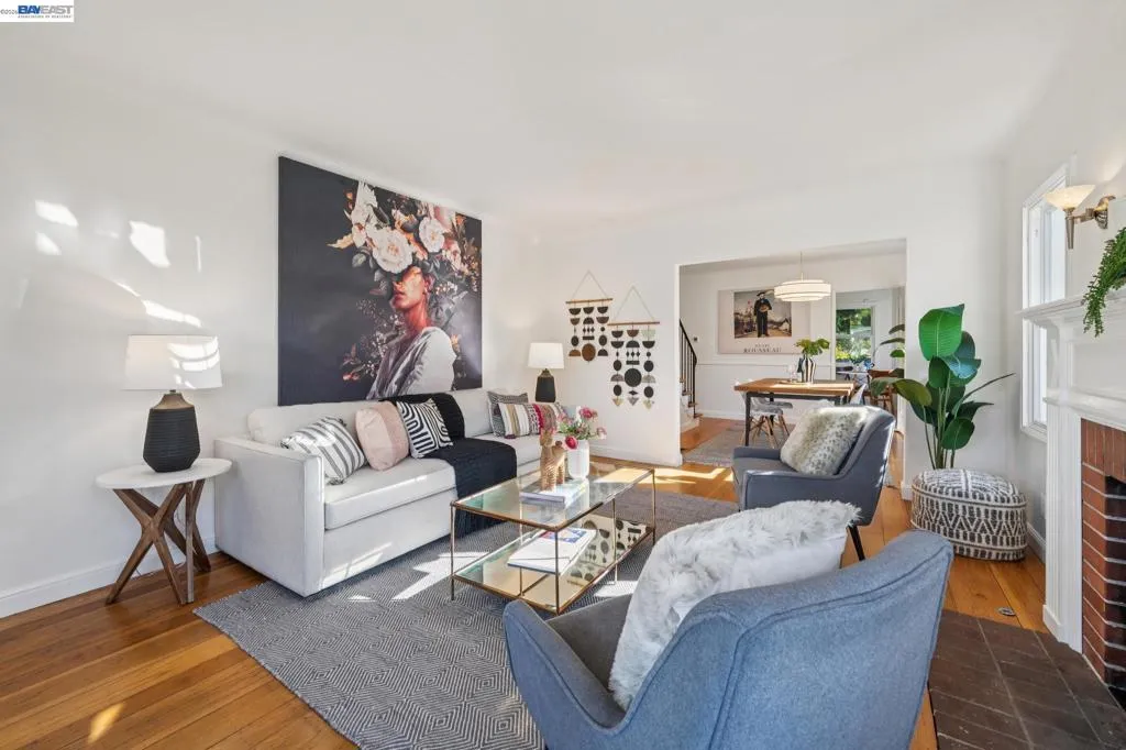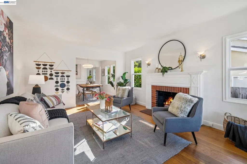 Enjoy the best of Alameda's East End, in this 2+BD/1BA bungalow on a quiet street with shoreline trails, parks, boating, a public swimming pool, and tennis courts only blocks away. Built in 1938, windows galore stream sunshine into the 1151 SQFT home that lives large with additional bonus spaces built out of the basement areas. A landscaped front yard and neighborly porch welcome you inside the home's bright and inviting living room. The fireplace is framed by a mantle with period woodwork and picture windows display garden views, making the room a great place to relax with family and friends. Beautiful plank hardwood floors span into the dining room for great flow and easy entertaining. The room features a staircase with decorative woodwork and a wrought iron handrail leading to the bedrooms. Tucked away for privacy on their own floor, both sunny bedrooms offer hardwood floors and walk-in custom closets and the updated hall bathroom has a shower above the tub. The kitchen adjoins the dining room, featuring a new Bosch fridge, vintage tiling, and a lovely breakfast nook with built-in shelves. Sip your morning coffee with a peaceful view of the backyard, or step through the backdoor where you can dine al fresco on the patio, surrounded by lush mature landscaping. The backyard includes a large storage shed. From the kitchen, you can also access the lower level of the home where the spacious laundry area offers great flexible space for an office, studio, or playroom, and the renovated garage area provides more flexible bonus square footage perfect for a den, family room, or home gym. Both areas have been upgraded with new lighting and hardwood floors. Out your front door, you'll find sought-after schools (elementary and middle school are each a few blocks away), Encinal Market for grocery shopping alongside a local cafe, restaurant, and new bakery, while Park Street’s downtown and Southshore Center are a few minutes away. Stroll to waterfront trails, Lincoln Park, or the Transbay bus stop just down the street for a convenient commute. Additional updates include newer windows (2022), new interior paint, and sewer lateral in compliance!